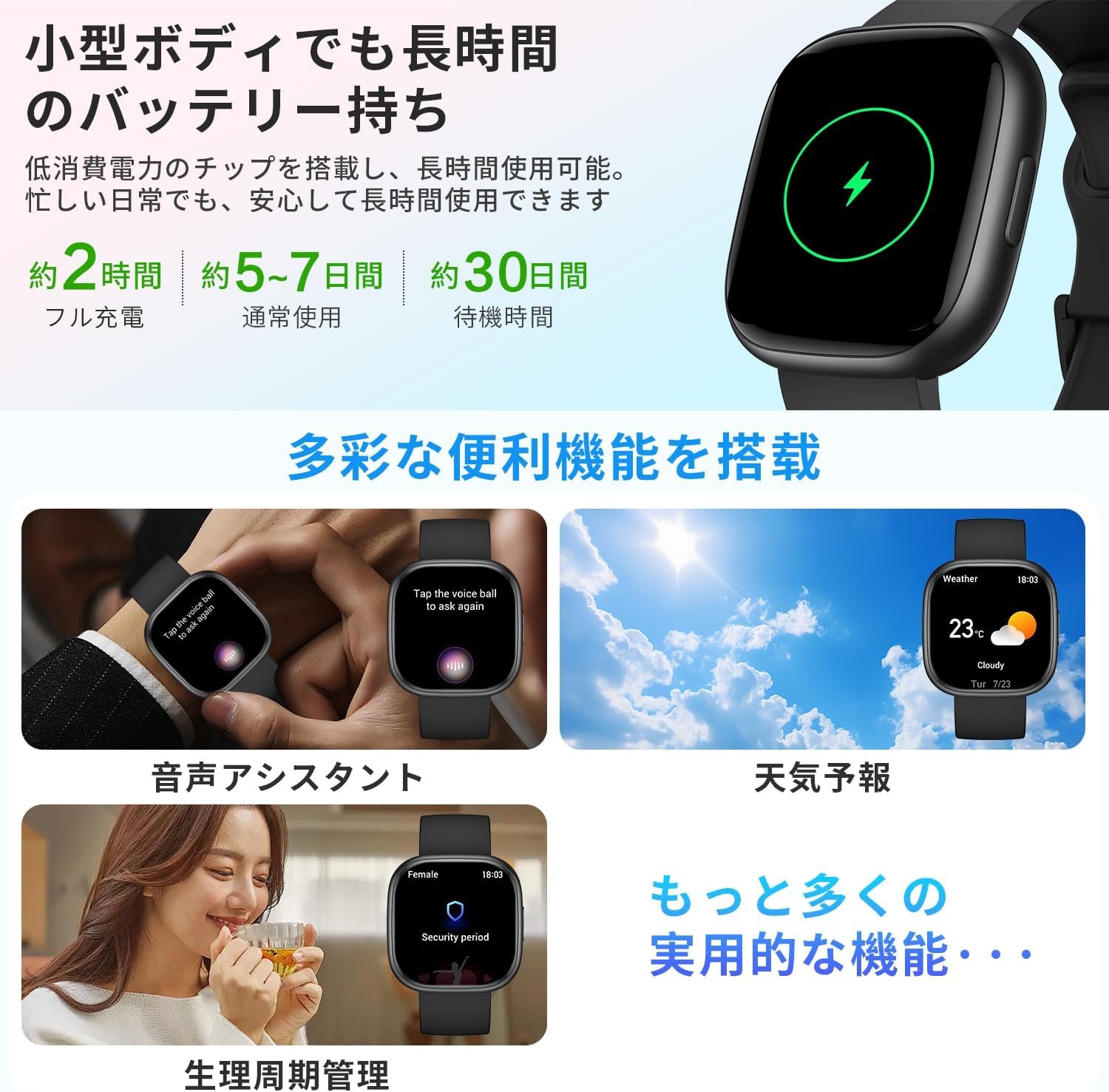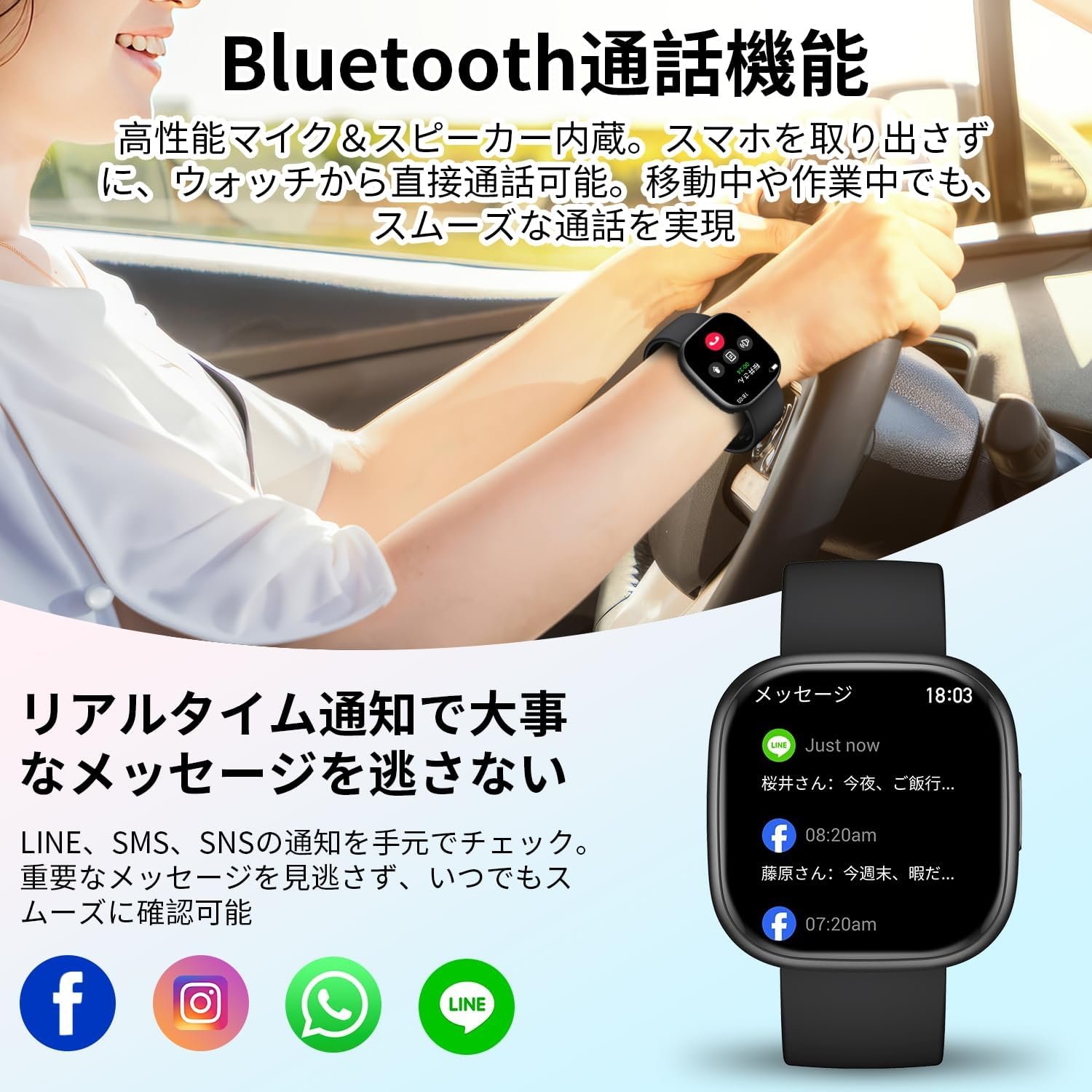 Bluetoothの呼び出し、メッセージの受信、音声アシスタント:Bluetoothを介して専用のスマートフォンアプリに接続すると、電話をかけることができます。携帯電話を取り出すことなく、手首からの電話に応答して応答することができます。そのため、作業や運転中に電話をかけることができます。さらに、ライン、SMS、その他のアプリ通知をリアルタイムで受信できるため、重要なメッセージを見逃すことはありません。また、音声アシスタント機能を使用すると、天気予報のチェック、音楽の再生、リマインダーの設定など、手元のスマートフォンのさまざまな機能を簡単に制御できます。この多機能スマートウォッチは、あなたの日常生活をスマートで便利にします