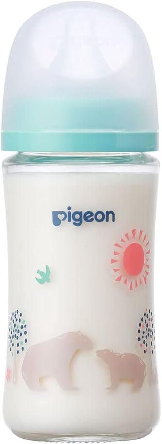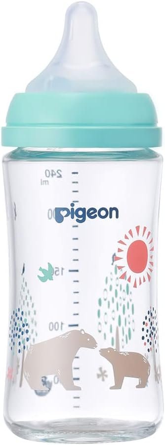 ピジョン母乳牛乳の哺乳瓶、熊、クマ、8.5 fl oz(240 ml)、3か月、耐熱性ガラス、水色 +鳩母乳スポンジブラシ、白い2個