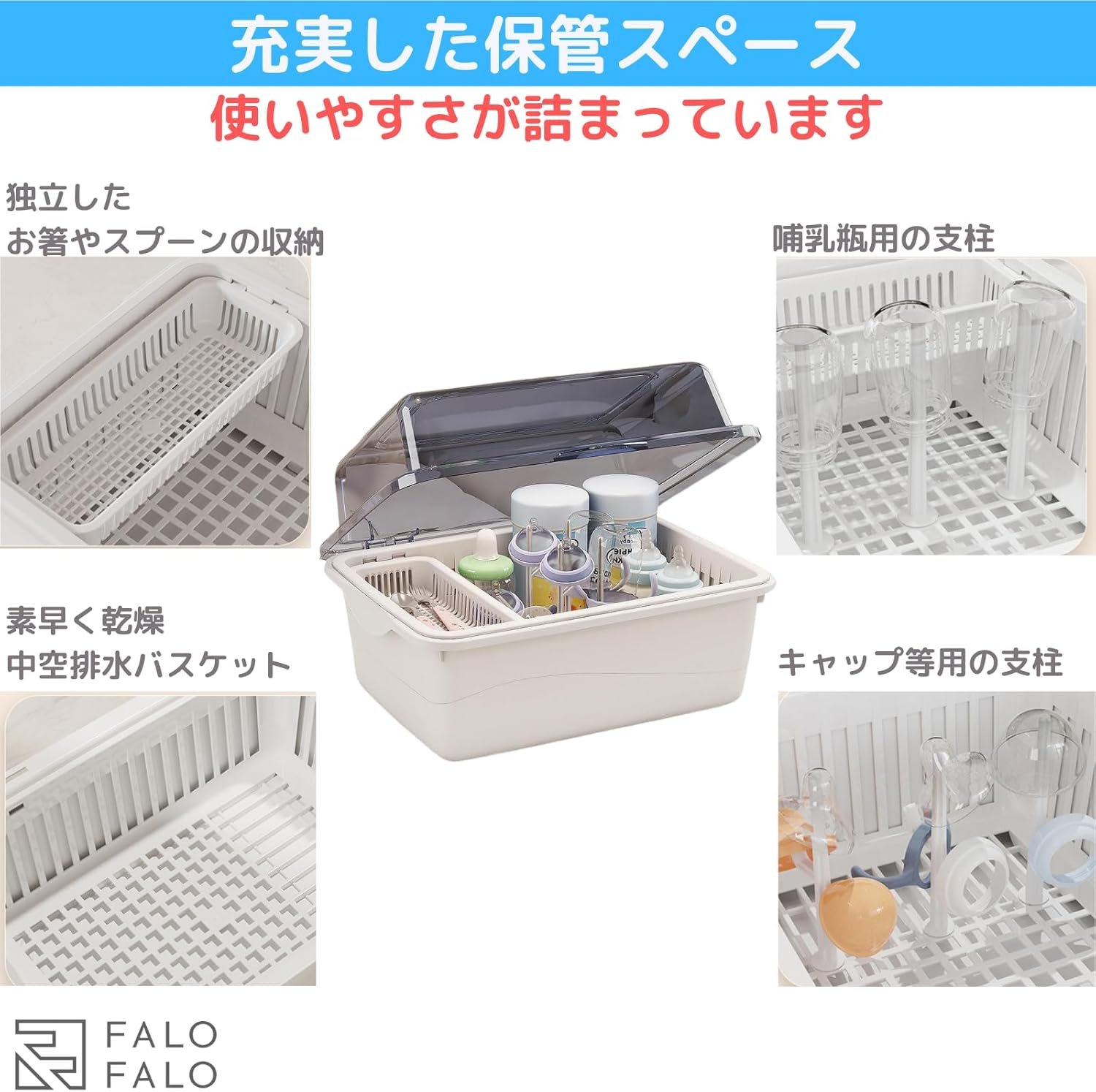 (追加の保管スペース)箸とスプーン用の個別の保管スペース、および哺乳瓶とおしゃべりのための保管スペースには6つのポストが付いています。中空排水バスケットは、迅速な排出と乾燥を可能にします