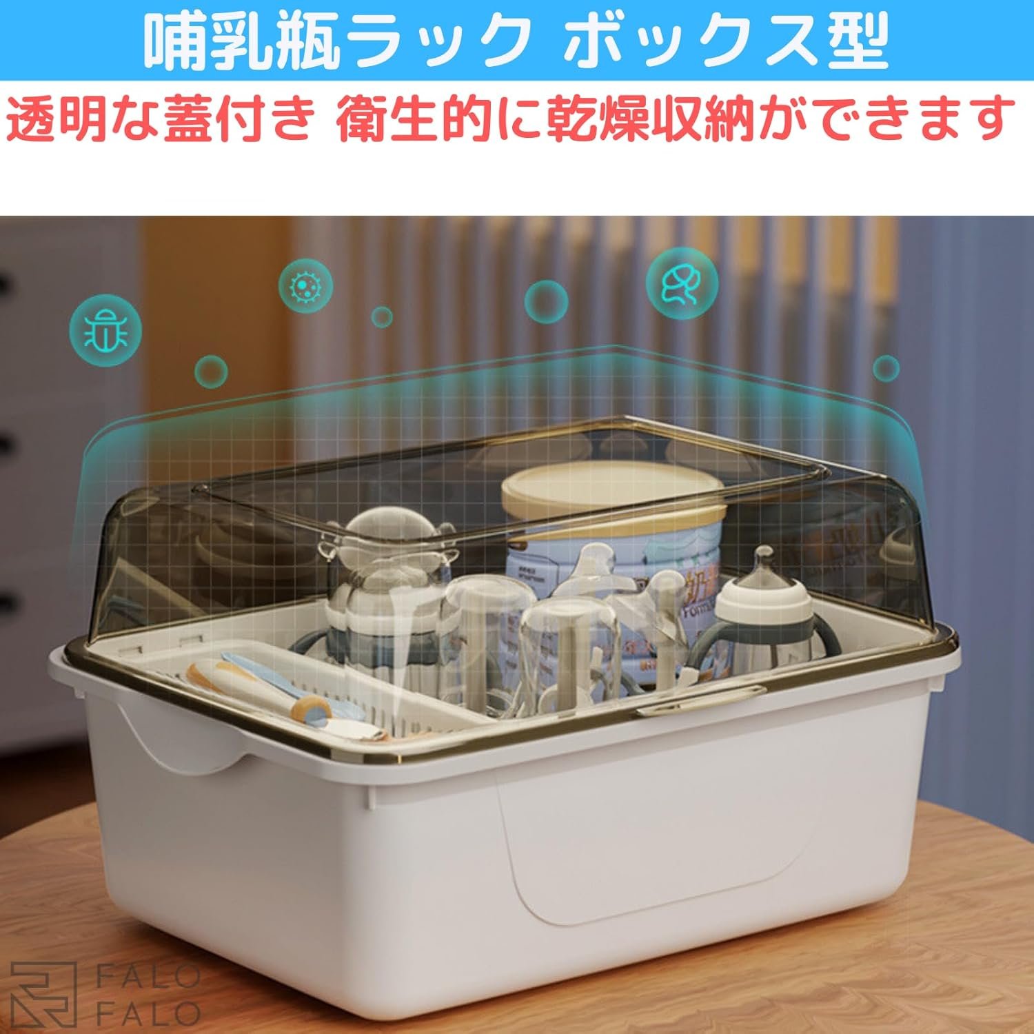 Falofalo給餌ボトルラック、ボックスタイプ、透明な蓋、ほこりの予防、衛生、乾燥、保管、大容量、お祝い、ギフト
