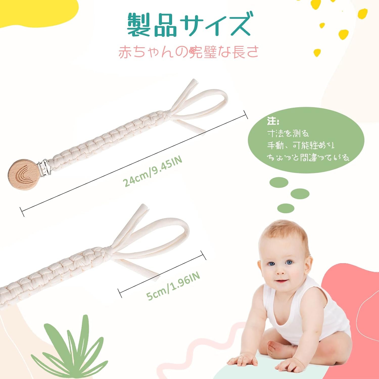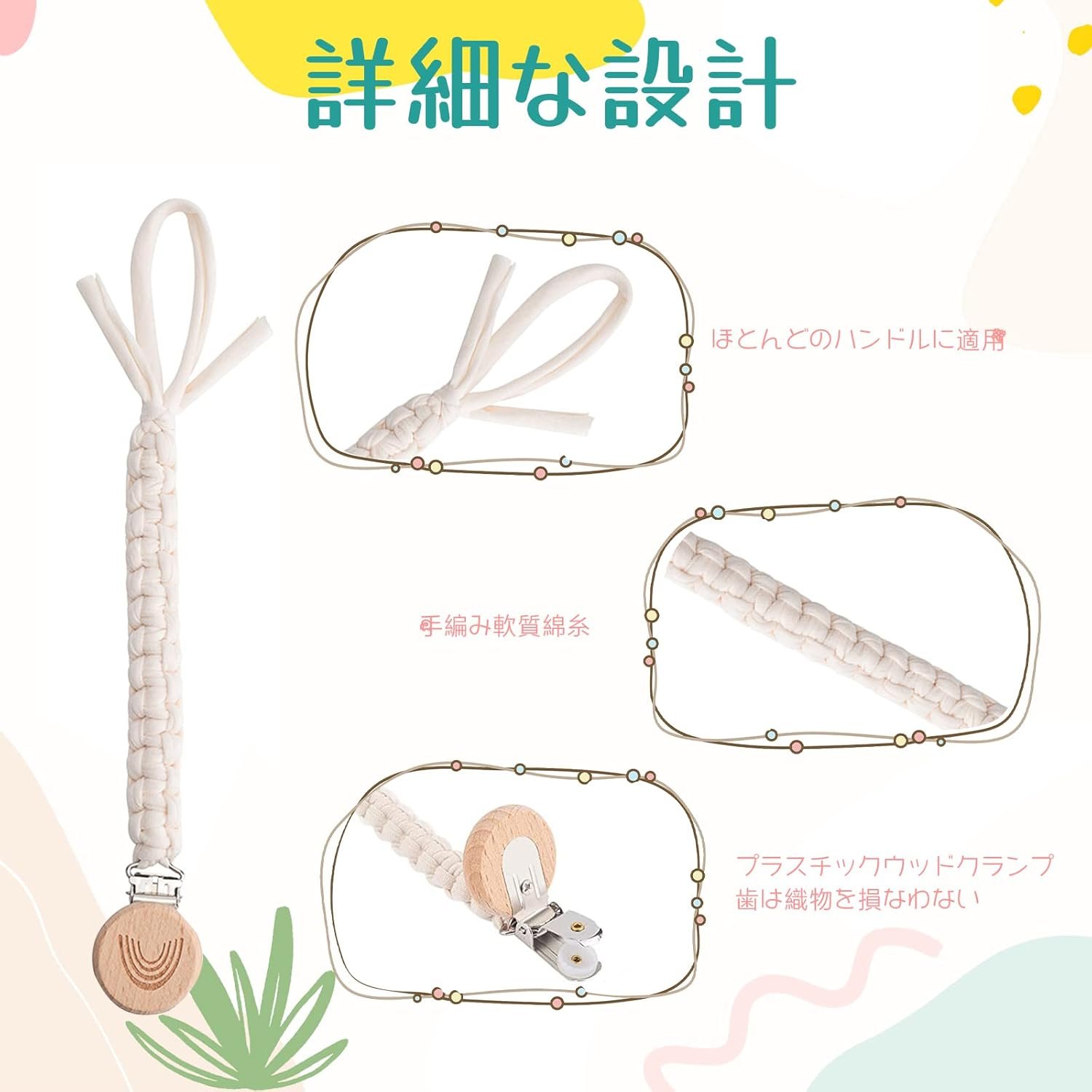 ユニークなデザイン:このおしゃぶりクリップセットには、男の子と女の子の両方に異なる色が含まれています。おしゃぶりクリップは織られており、ボヘミアンレインボー木製クリップがスタイルのタッチを追加します