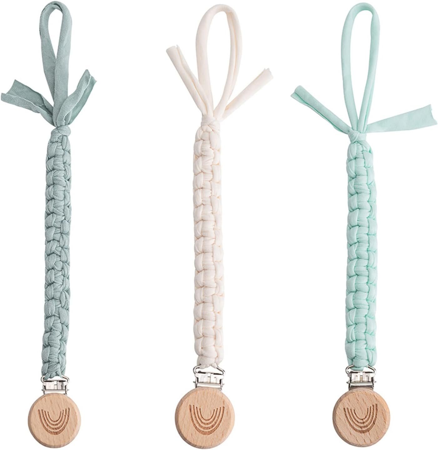 シンボルアイフェイファイヤークリップボーイガールパシファイヤーホルダーリーシュボーホーレインボー木製クリップ手作り編み綿ベビーシャワーバースデーギフトクリスマスプレゼント(パステルグリーンホワイトデニム)