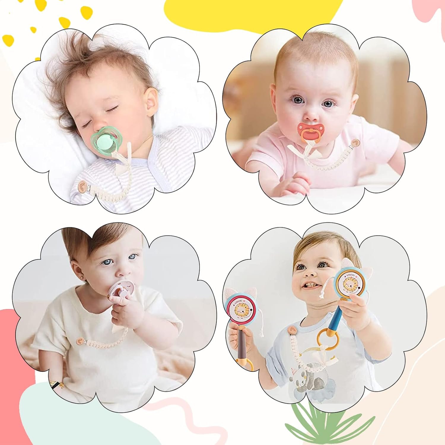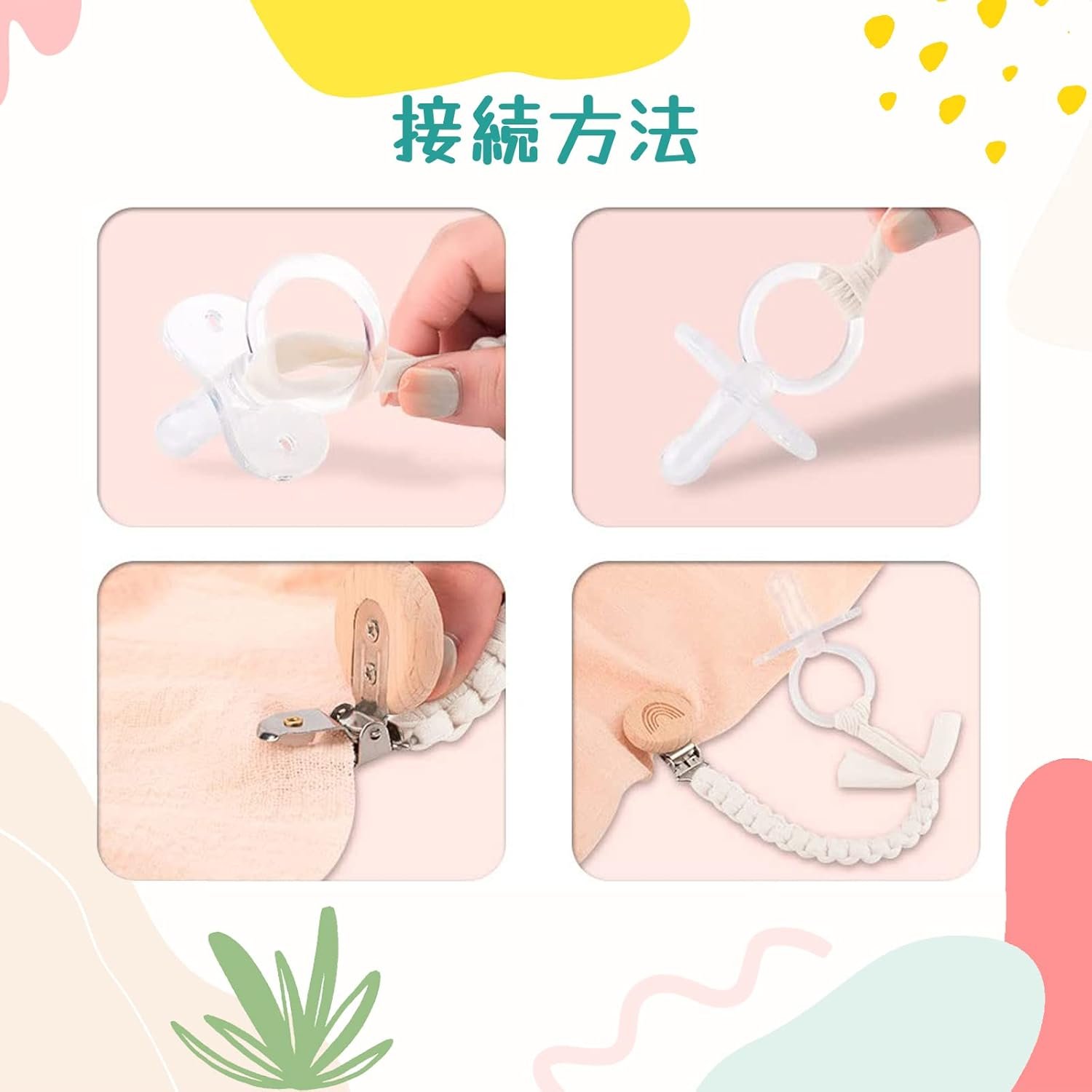 使いやすい:赤ちゃんの服、バッグ、よだれかけ、毛布、またはベビーカーに吊るしてください。おしゃぶり、歯、小さなおもちゃは落とすのを防ぎ、汚れ、喪失を防ぎ、それらをきれいに保つ