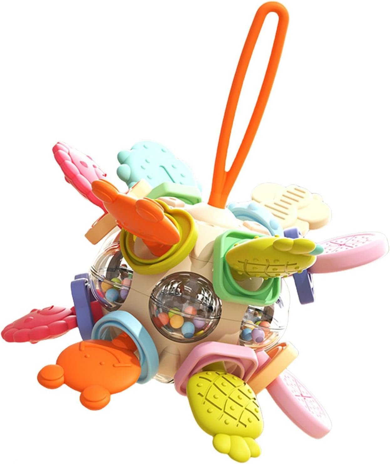 魅力的な赤ちゃんの注意:赤ちゃんの注意を引いて、歯が生えるおもちゃで感覚を刺激します。ガラガラを振って回転させて音を生み出し、視覚的および聴覚的発達を促進します。楽しい感覚探査を通じて、原因となる関係と細かい運動能力を教えるのに役立ちます