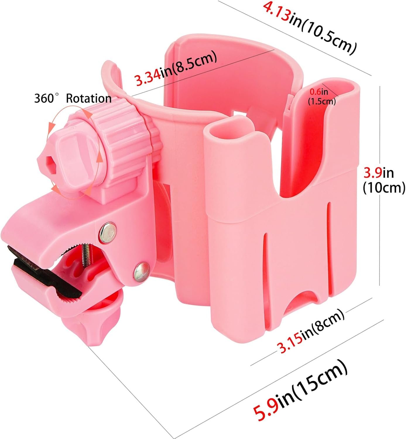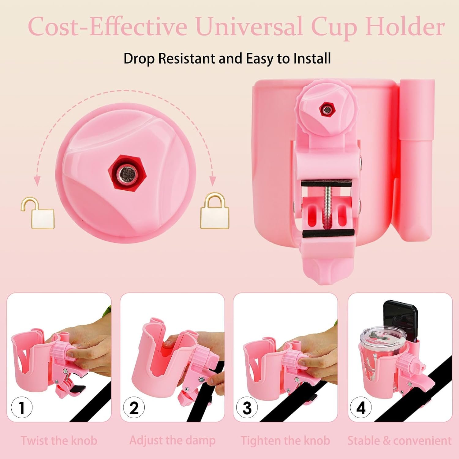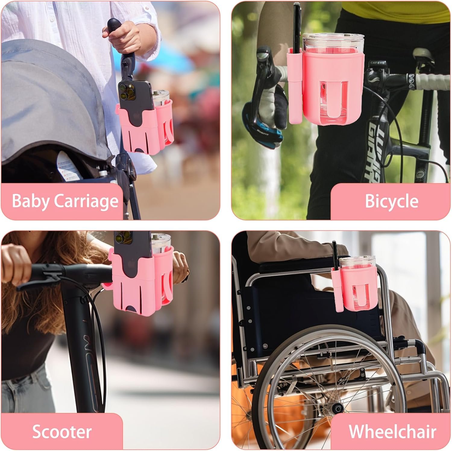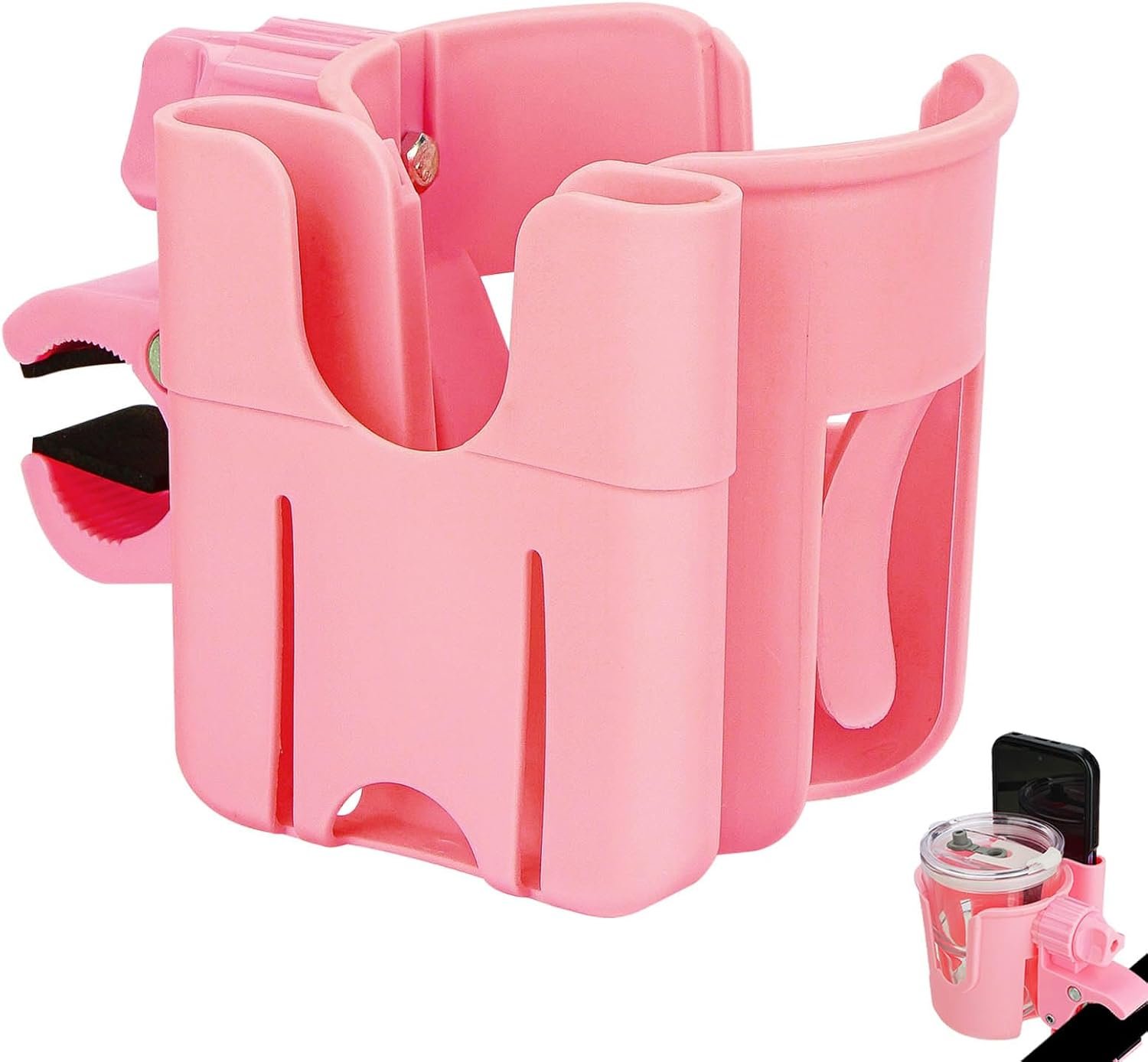Biiange 2 in 1カップ&スマートフォンホルダー、自転車、歩行者、車椅子、ベビーカーの多機能ドリンクホルダー、簡単に設置できます(1個、ピンク)