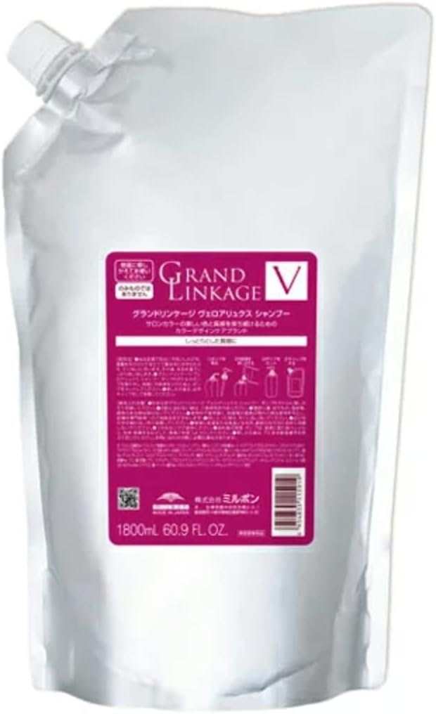 Milbon Grand Linkage Veloarlux Shampoo 60.6 fl oz(1,800 ml)、補充可能で、自宅またはサロンの色の直後に使用できます。それはあらゆる年齢の女性にとって髪を美しくし、輝かせます。 Supple(硬質髪/合成髪の場合):微量塩素による退色を減らし、柔らかい結束を提供します。香り:緑のリンゴに基づいた風通しの良い花。