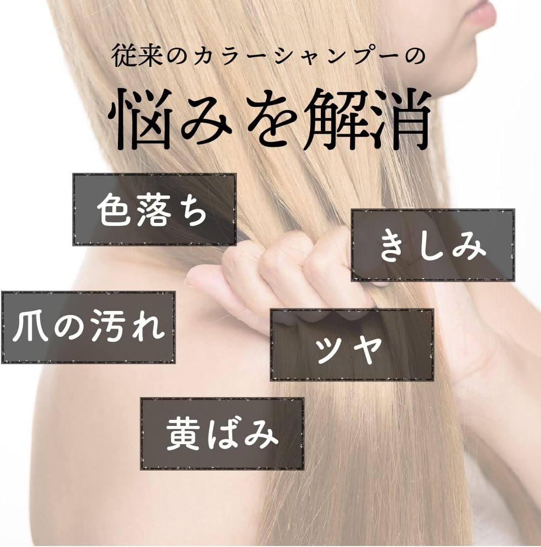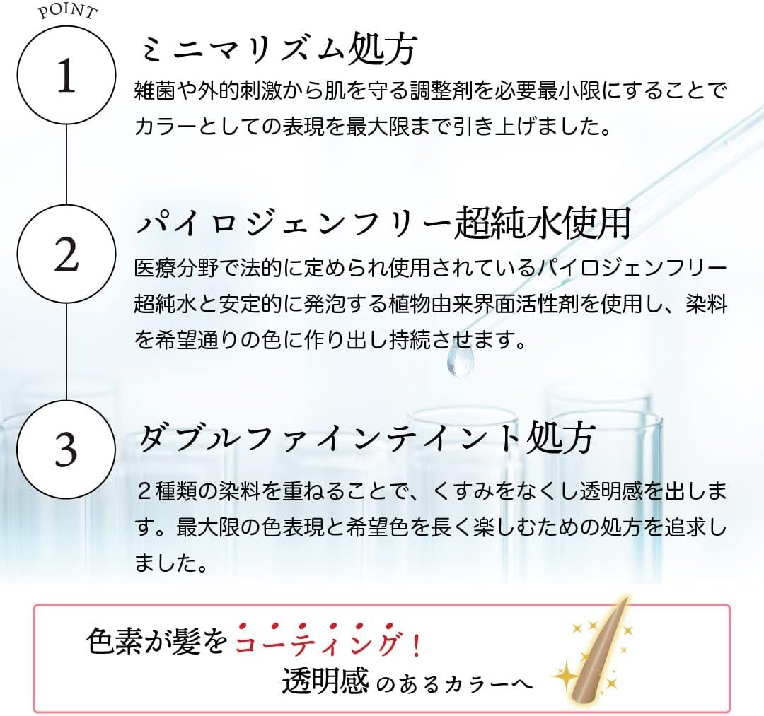 ✨【髪の毛を美しく保つためのこだわり】①ミニマリズム処方。求める色を追求するため、雑菌や外的刺激から肌を守る調整剤を必要最小限にすることで、敏感肌の方でも使用ができ、カラーシャンプーとしての表現を最大限まで引き上げました。②パイロジェンフリー超純水。シャンプーの主成分である水にこだわりました。医療分野で法的に定められ使用されているパイロジェンフリー超純粋と安定的に発泡する植物由来界面活性剤で染料を希望通りの色に作りだし持続させます。③ダブルファインテイント処方。2種類の染料を重ねることで、くすみをなくし透明感のある色味を再現しました。最大限の色表現と希望色を長く楽しむため、色素が髪をコーティングし透明感のあるカラーを維持できる配合を叶えました。