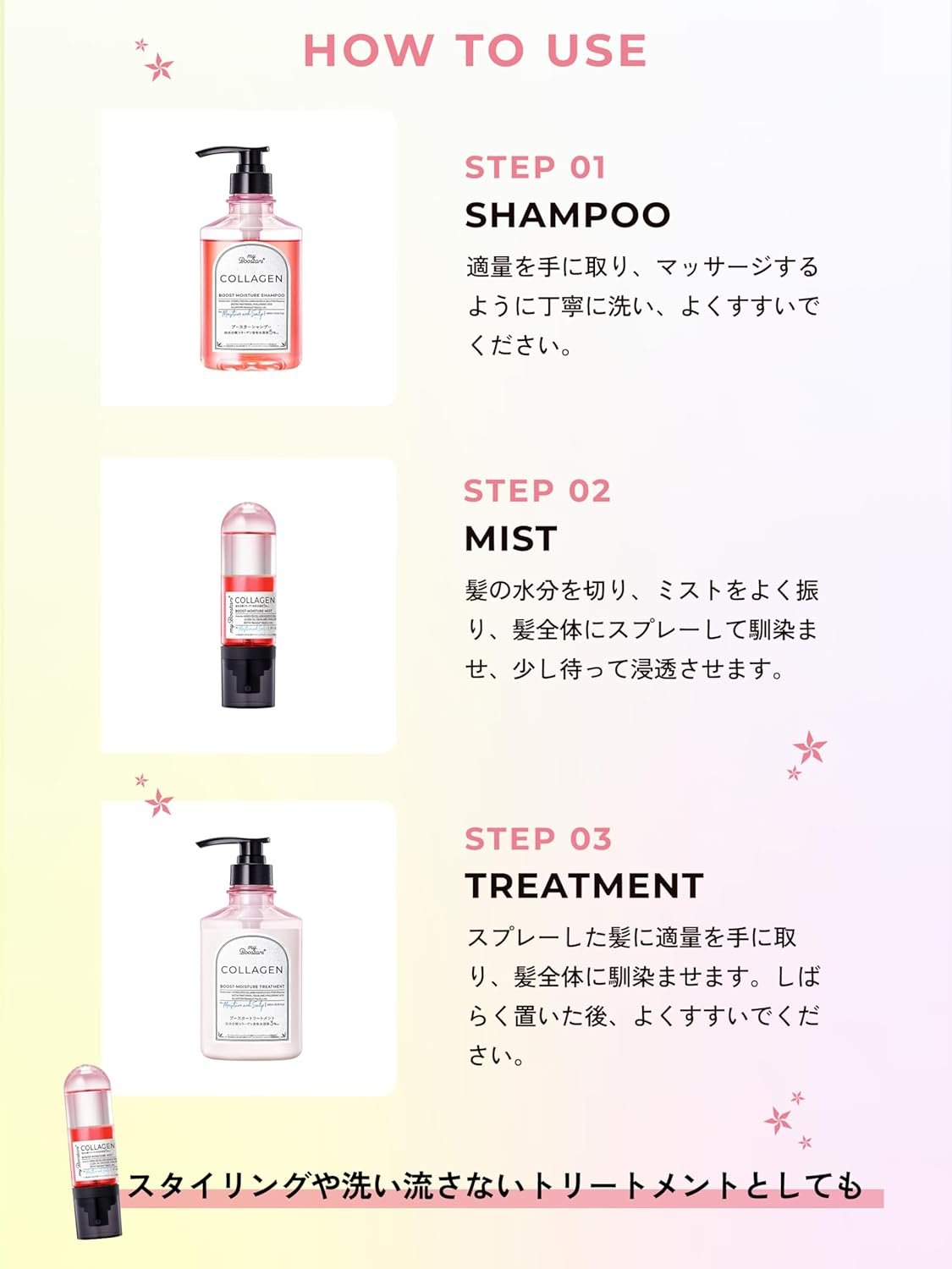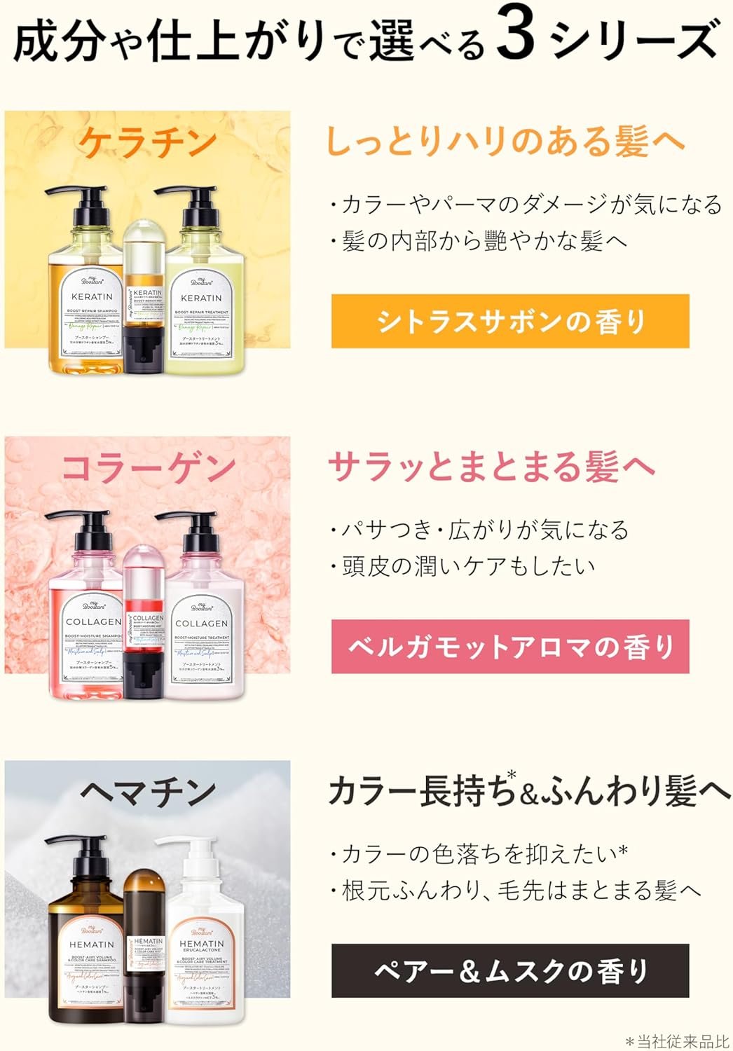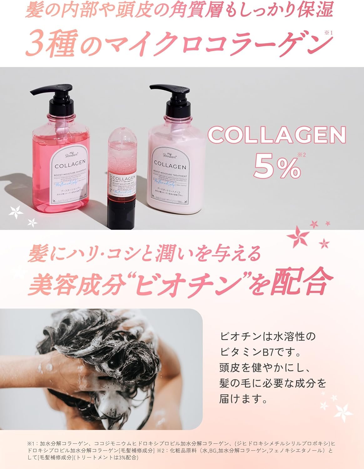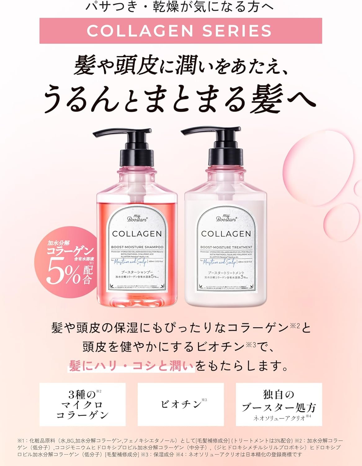 加水分解されたコラーゲンを使用したスキンケアのアイデアから生まれたブースターシャンプー(*1)。髪と頭皮に潤いを与え、髪を保湿にします