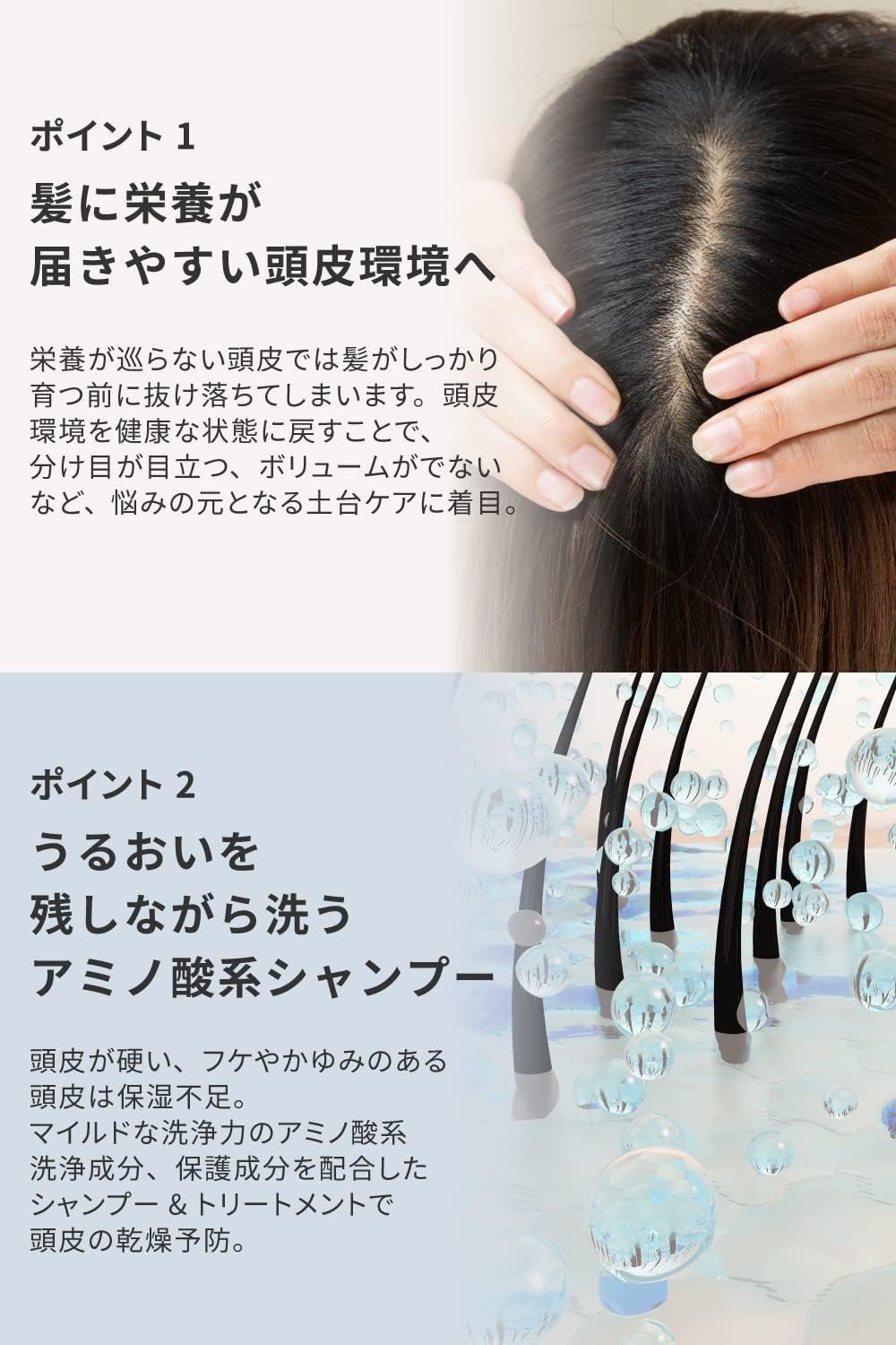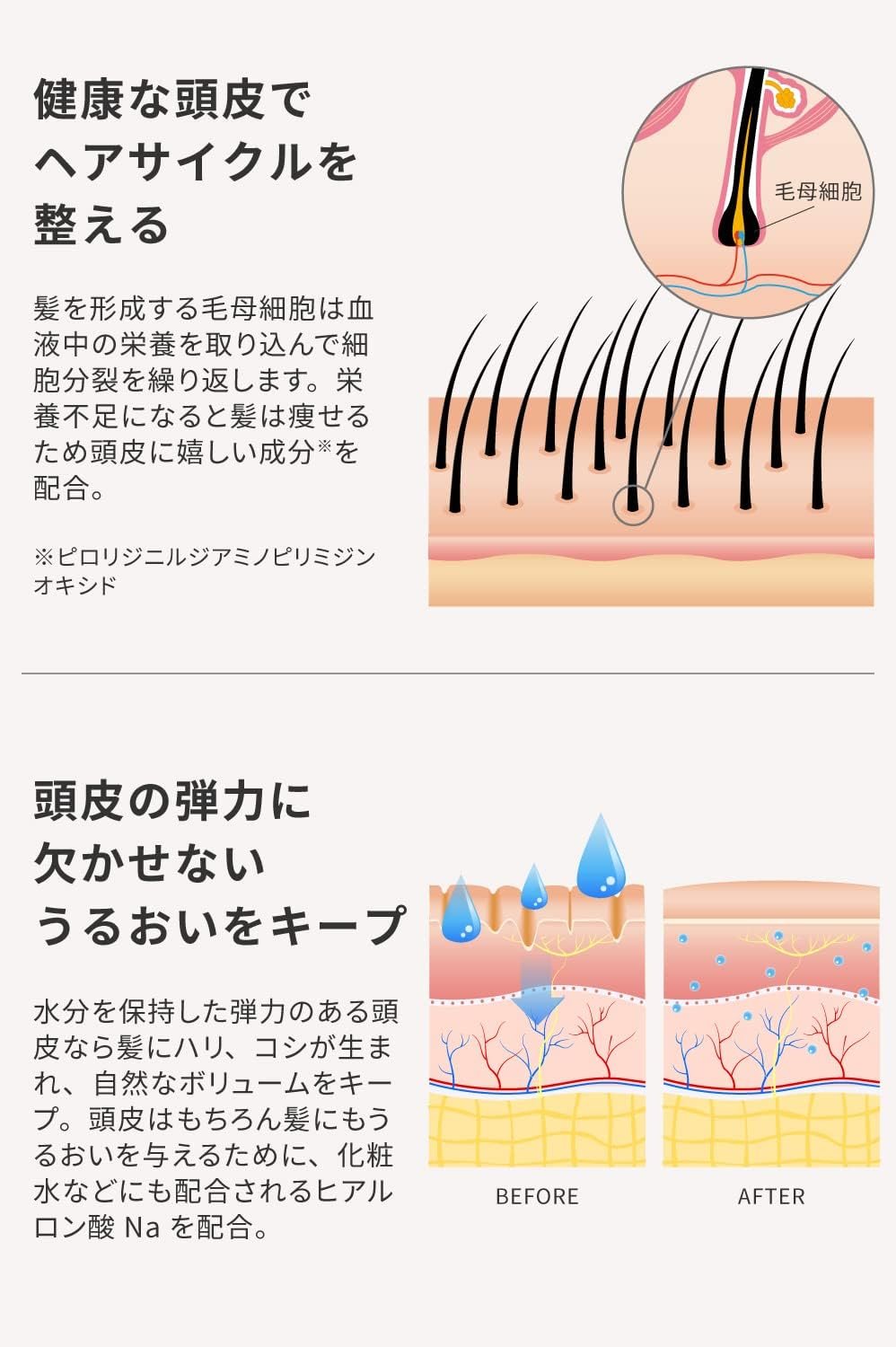 保湿:髪と頭皮を保湿するためのヒアルロン酸やコラーゲンなどの天然成分で配合された
