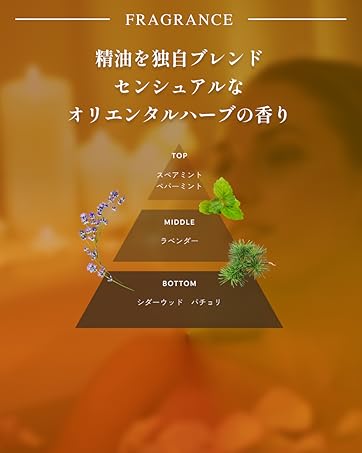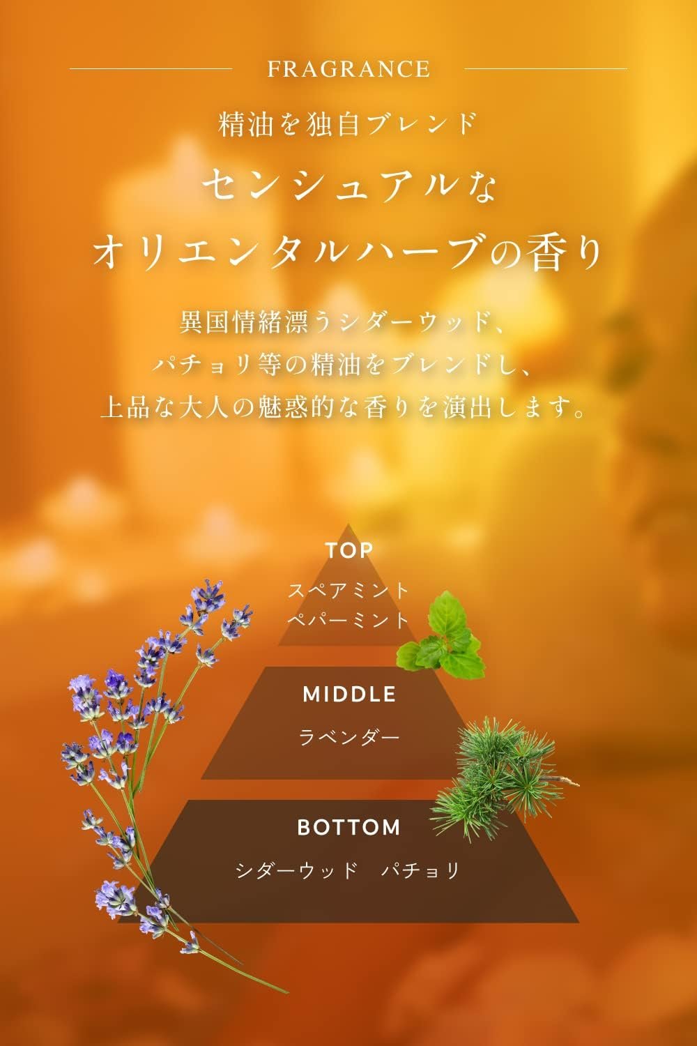 官能的なオリエンタルハーブフレグランス:シーダーウッド、ラベンダー、パチョリなどのエッセンシャルオイルの絶妙なブレンドは、洗練された大人のためのエレガントで魅惑的な香りを作り出します。