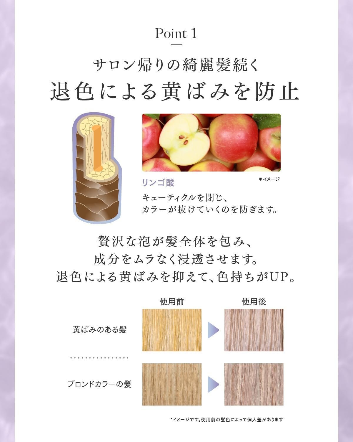 洗浄中の豪華なケア:「色の衰退は良くない」、「あなたが熱心に心配するなら、「髪が損傷します」、「これを避けるために」。 ★フェード抵抗性フォーミュラ★リッチフォーミング★アミノ酸ベースの洗浄(ナトリウムココイルメチルタウリン