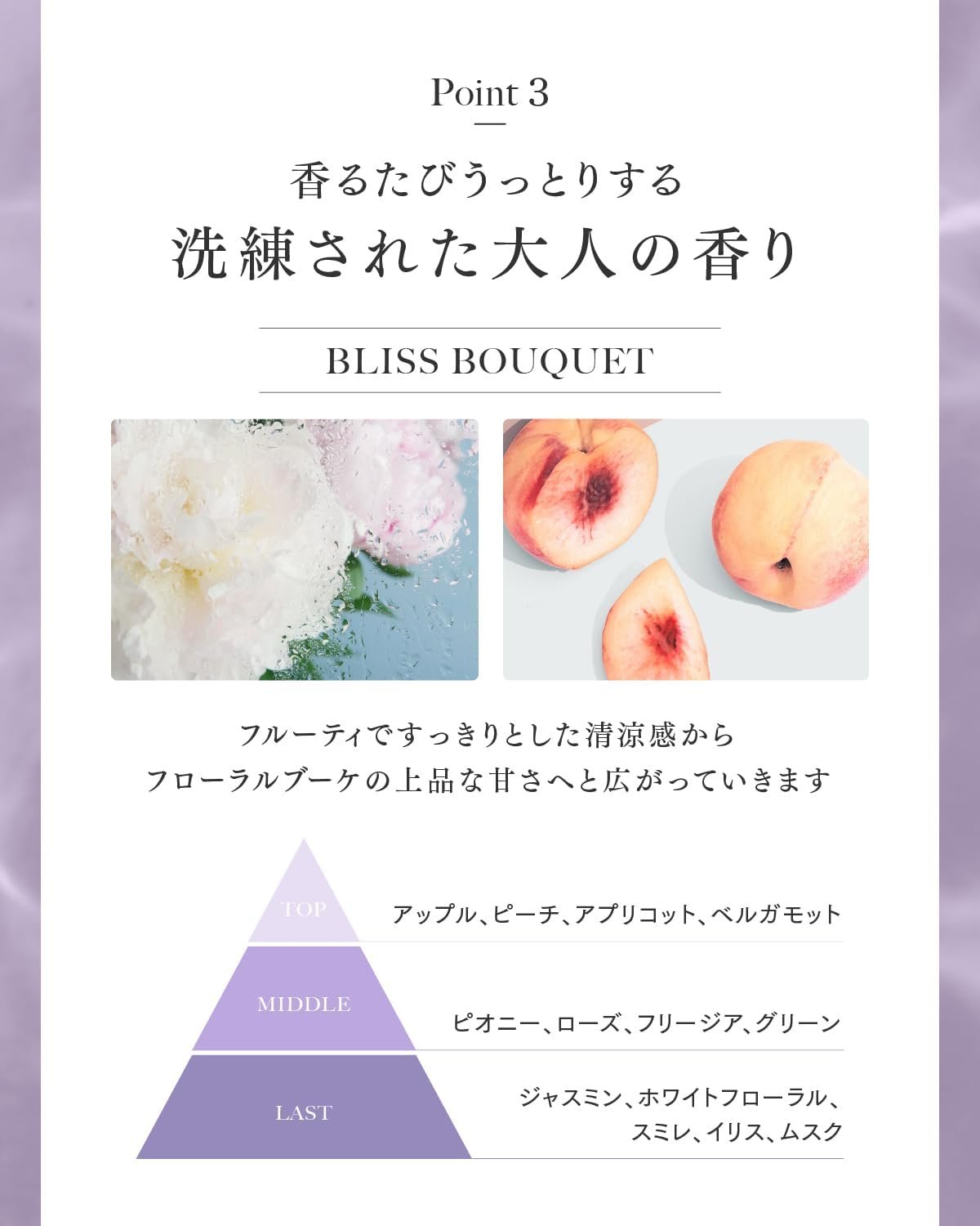 洗練された大人の香り〜フルーティーな花〜上部:リンゴ、ピーチ、アプリコット、ベルガモット。中央:ペオン、ローズ、フリージアグリーン。最後:ジャスミン、白い花、バイオレット、アイリスムスク