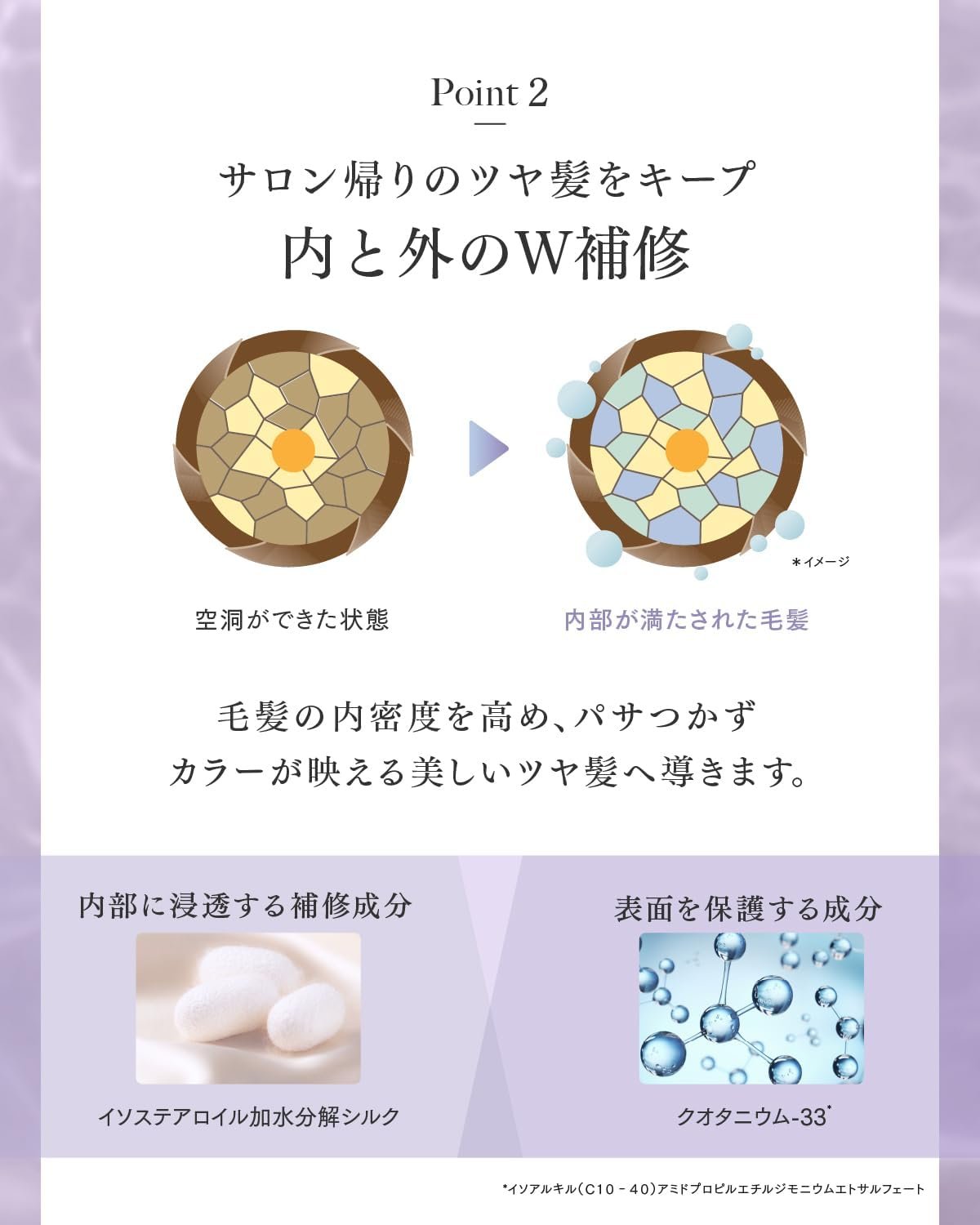 W修復:W修復式:この製品は、内部(イソステル加水分解絹)と「表面保護成分(クォータ33*)」に浸透する修理式です。髪の内側密度を増加させ、パックすることなく光沢のある色につながります。