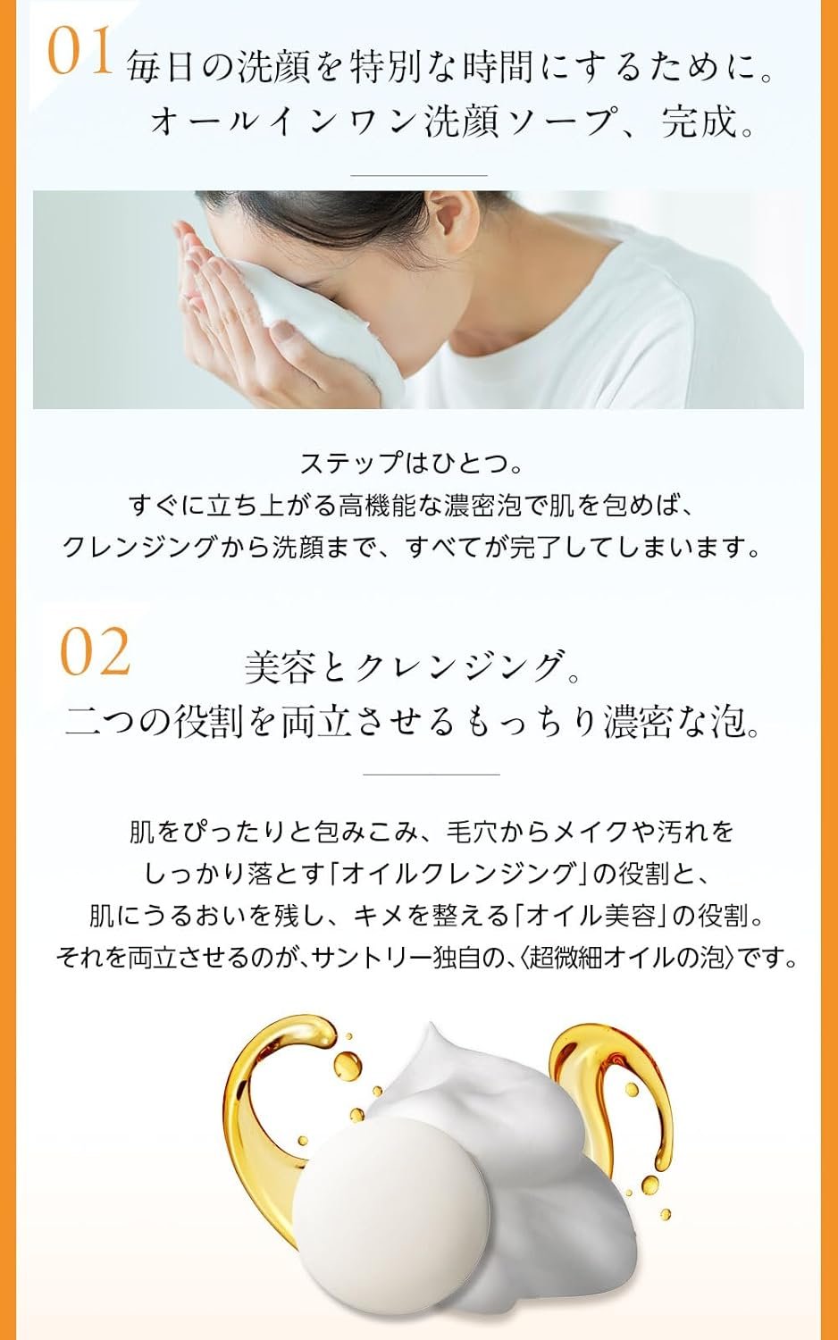 推奨される理由2:美しさとクレンジング。 2つの機能を組み合わせた密な泡。肌を抱きしめ、毛穴からメイクと汚れを完全に取り除き、「オイルの美しさ」を徹底的に取り除き、肌に水分を維持し、肌を調整します。 Suntory独自のウルトラファインオイルフォーム