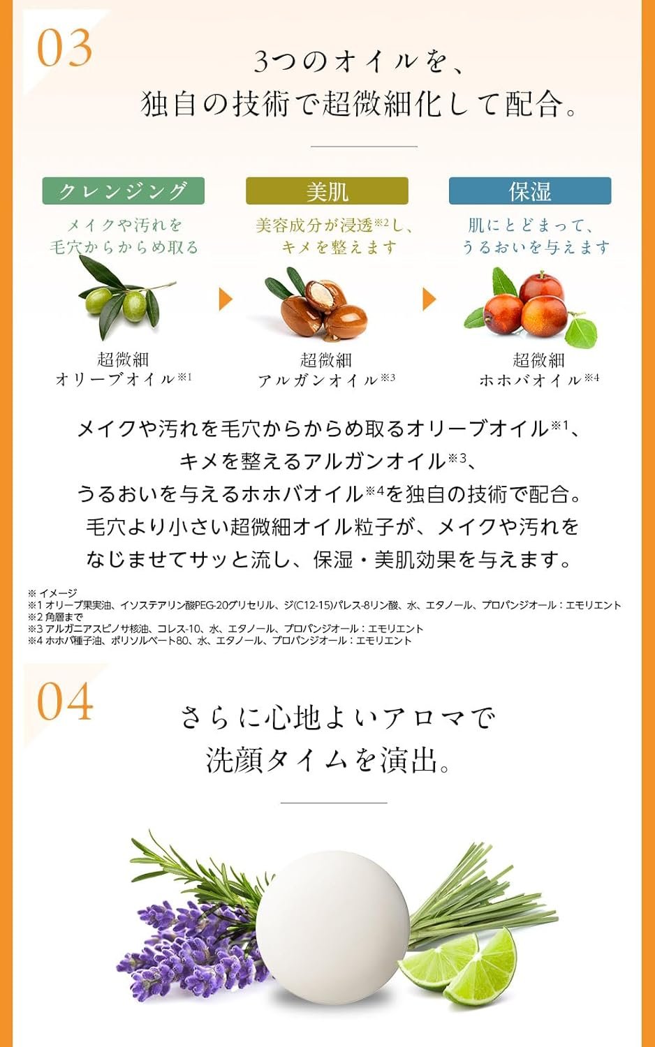 推奨される理由3:独自のテクノロジーで非常に優れた3つのオイルで処方されています。毛穴から化粧と汚れを取り除くオリーブオイル。 *1、ARGANオイルテクスチャを調整する *3、Jojojoba Oil *4は保湿を与えます。毛穴よりも小さい超微細なオイル粒子は、メイクと汚れを素早く流れ込んで、保湿と美しい肌を提供します。 ※1オリーブフルーツオイル、PEG-20等球酸、グリセリル、C12-15)宮殿-8リン酸、水、エタノール、プロパンシオール:皮膚軟layers *2 ARGANIA SPISOSA核オイル、Choles-10、水、エタノール、プロパンディオール:エモール油