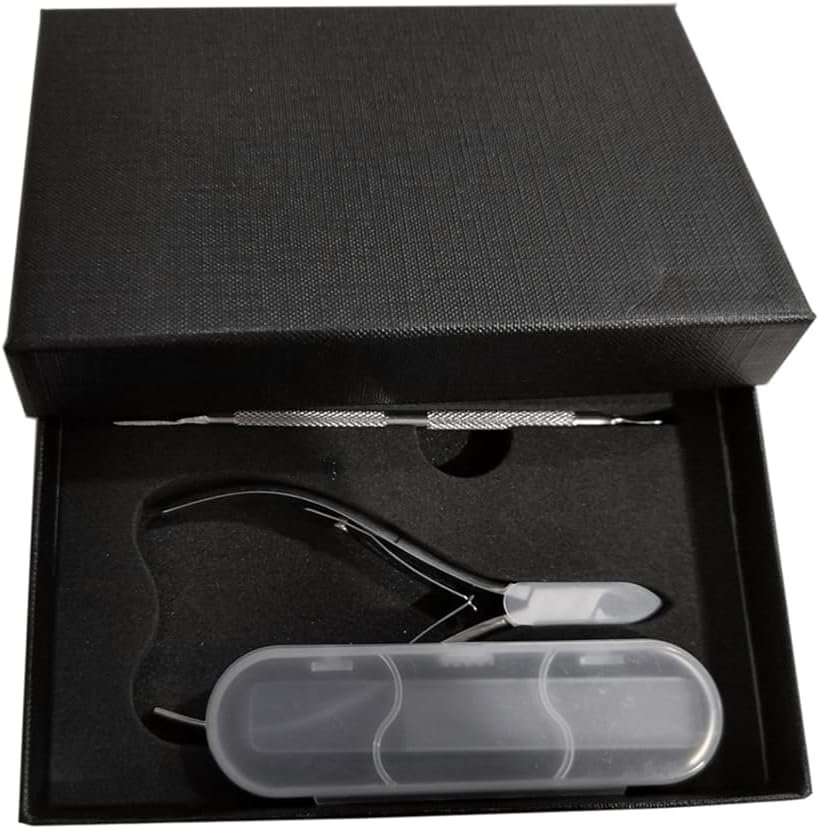 材料:ステンレス鋼、ガラス。内容の設定:ネイルニッパーX 1、ネイルプッシャーX 1、ネイルファイルX 1、ストレージケースX 2