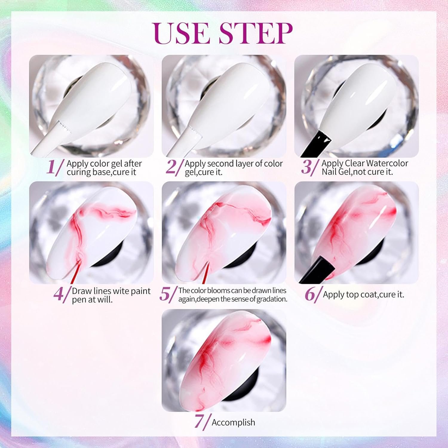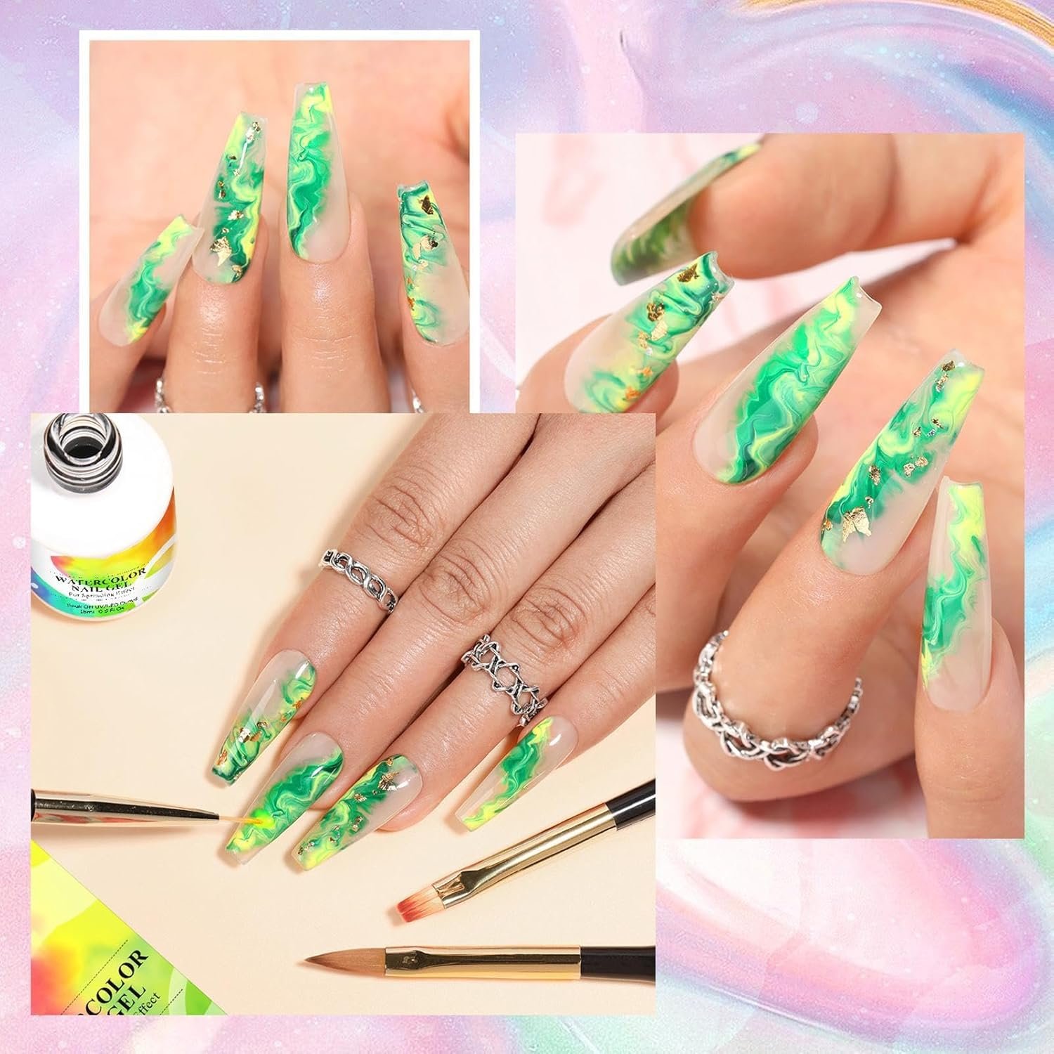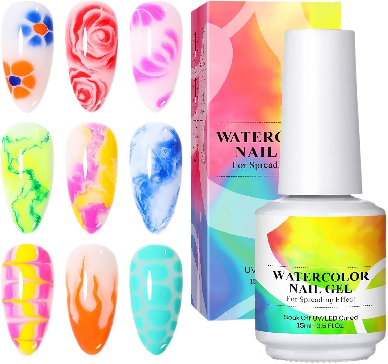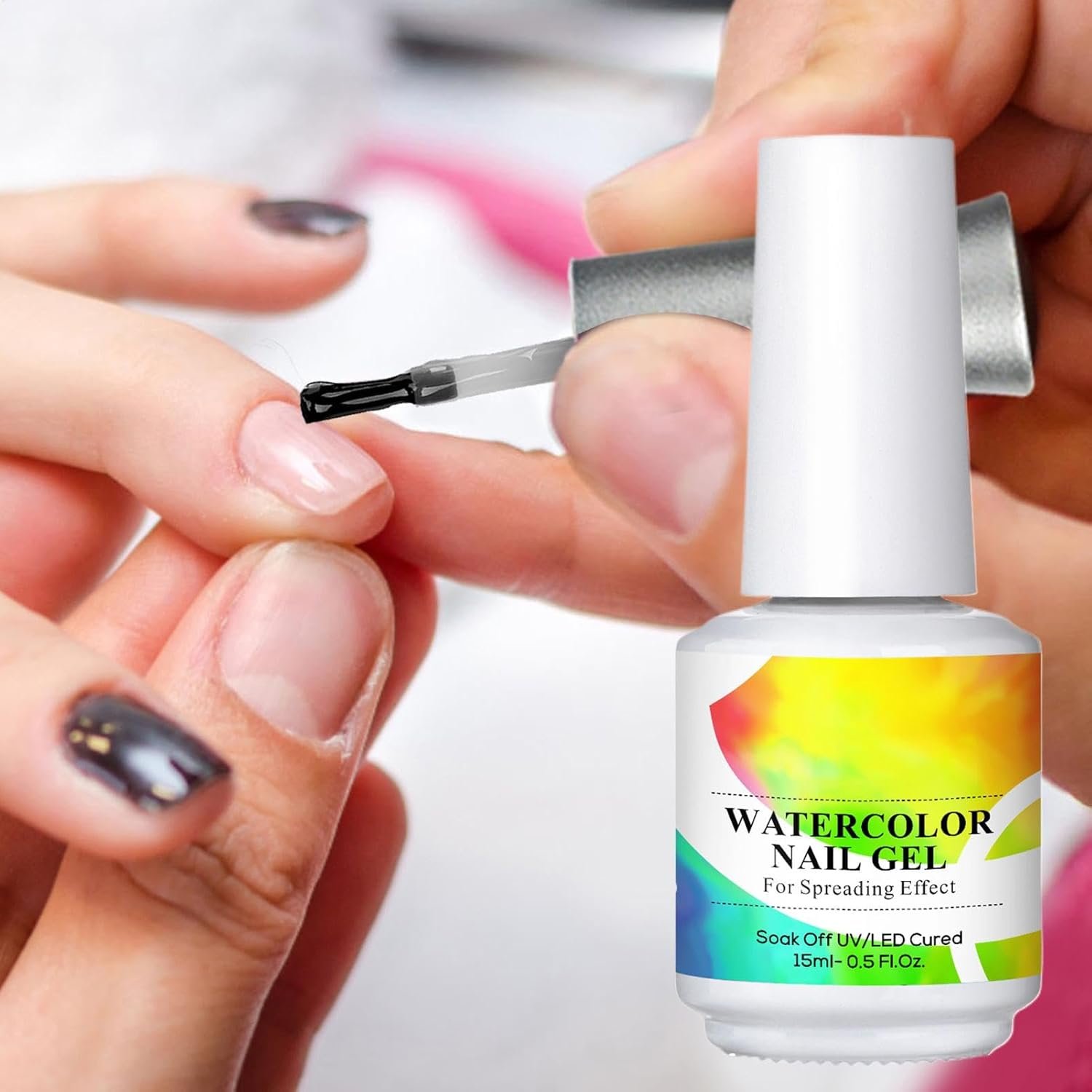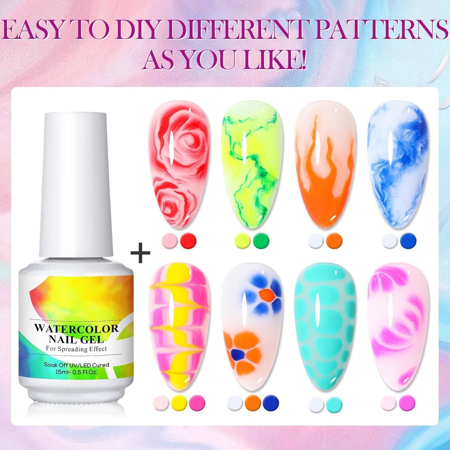 完璧なブルーム:プレーンジェルマニキュアを咲かせるジェル水彩効果を備えた絶妙な水彩、ストライプ、または花のデザインに変換