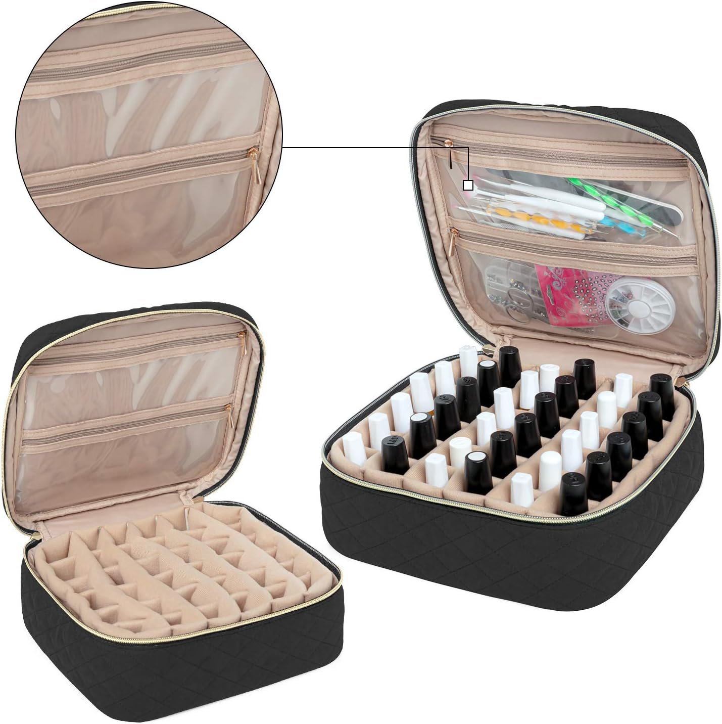 大容量:調整可能な仕切りパッドコンパートメントは、36本のマニキュアを保持できます。 2つの透明なポケットには、ネイルツール、ネイルファイル、ネイルパーツ、ステッカーなどがあります。 (高さ3.25 cm未満のボトルに合うことに注意してください)