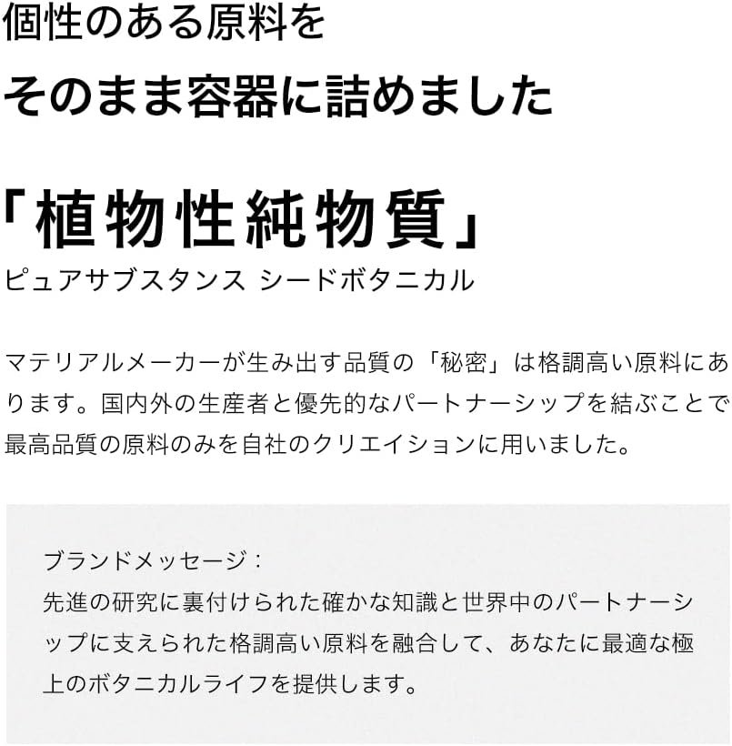 「純粋な物質種子植物」は、植物から抽出された植物油が植物の自然治癒力を追求して、添加物に依存せずに人間の自然治癒力を引き出し、自然環境と動物への悪影響を減らすために容器に詰められています。
