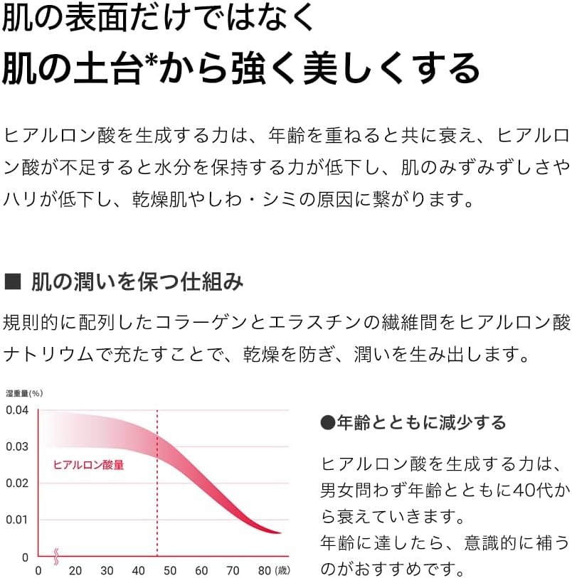 ヒアルロン酸を生成する力は年齢とともに消え、ヒアルロン酸の不足は水を保持する力を低下させ、皮膚がより落ち着いて硬くなり、乾燥肌、しわ、汚れを引き起こします。