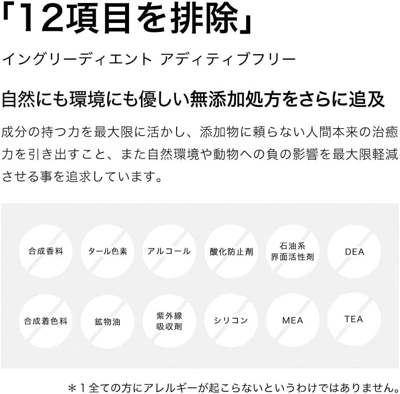 合成香料、合成色、抗酸化物質、アルコール、サルファート、ミネラルオイル、紫外線吸収体、石油界面活性剤、シリコン、DEA、MEA、TEA。
