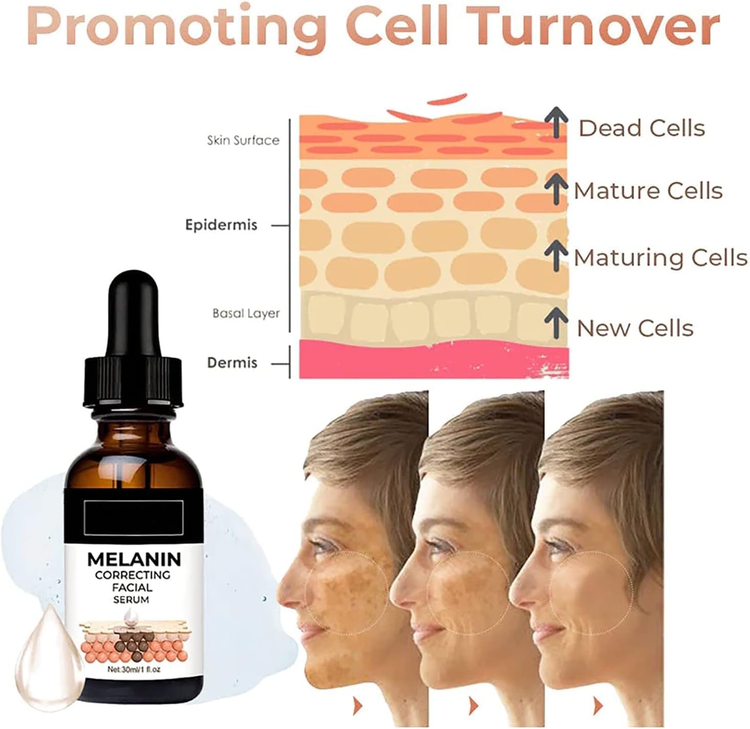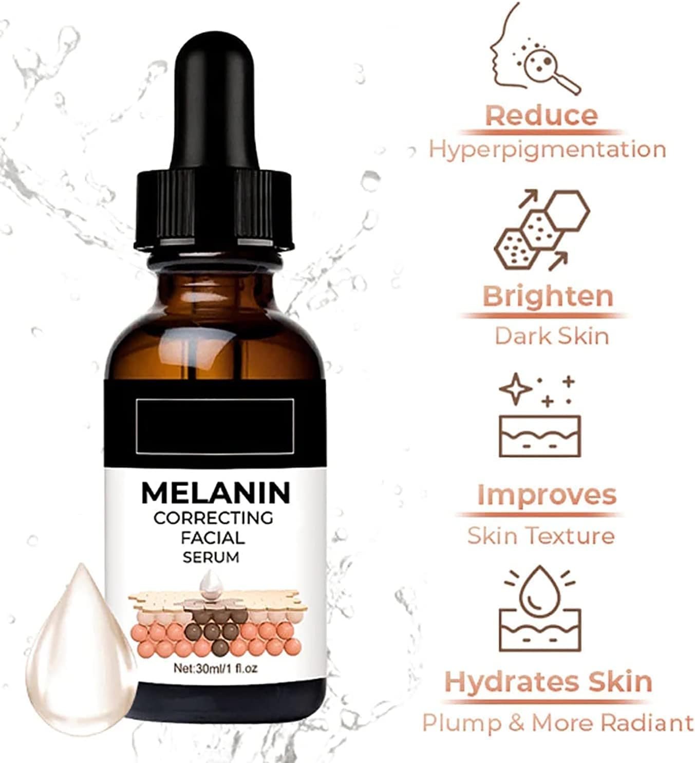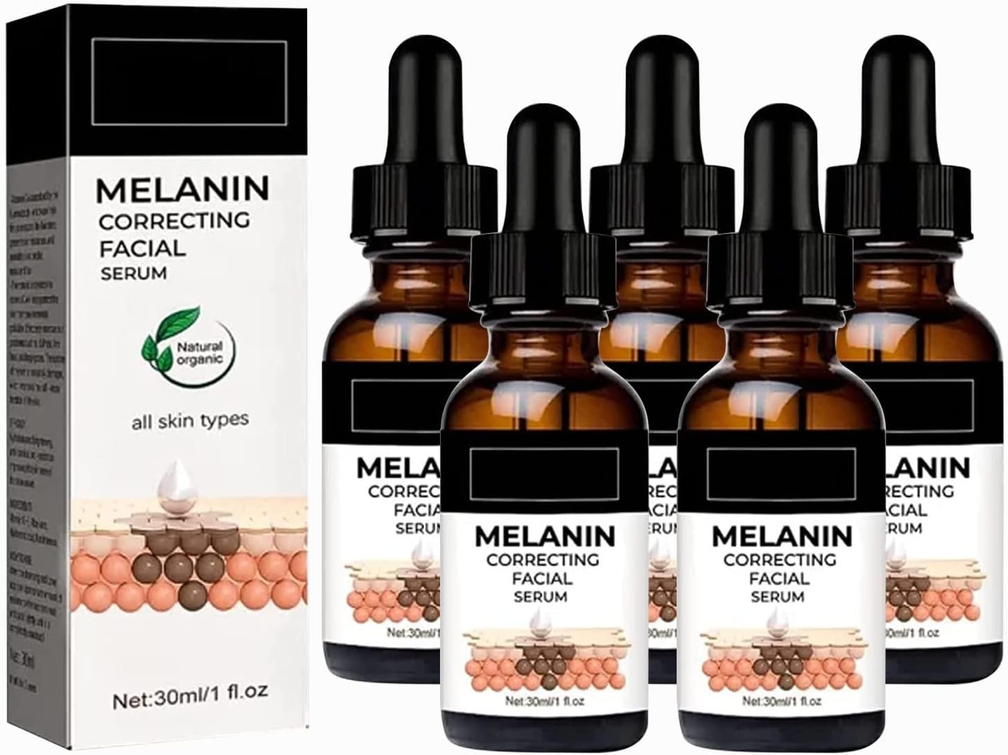 強力で効果的な成分:メラニン補正顔面血清は、メラミン補正、ビタミンC、ヒアルロン酸、コラーゲンの強力なブレンドであり、肌を明るくし、均一で、保湿し、光沢があります