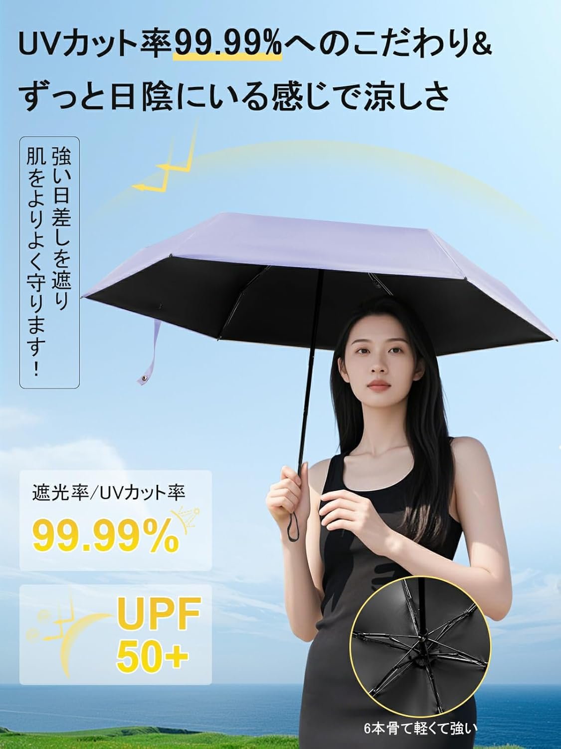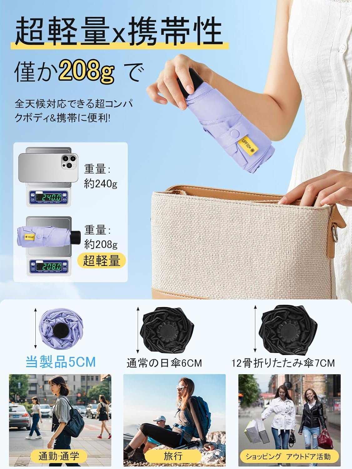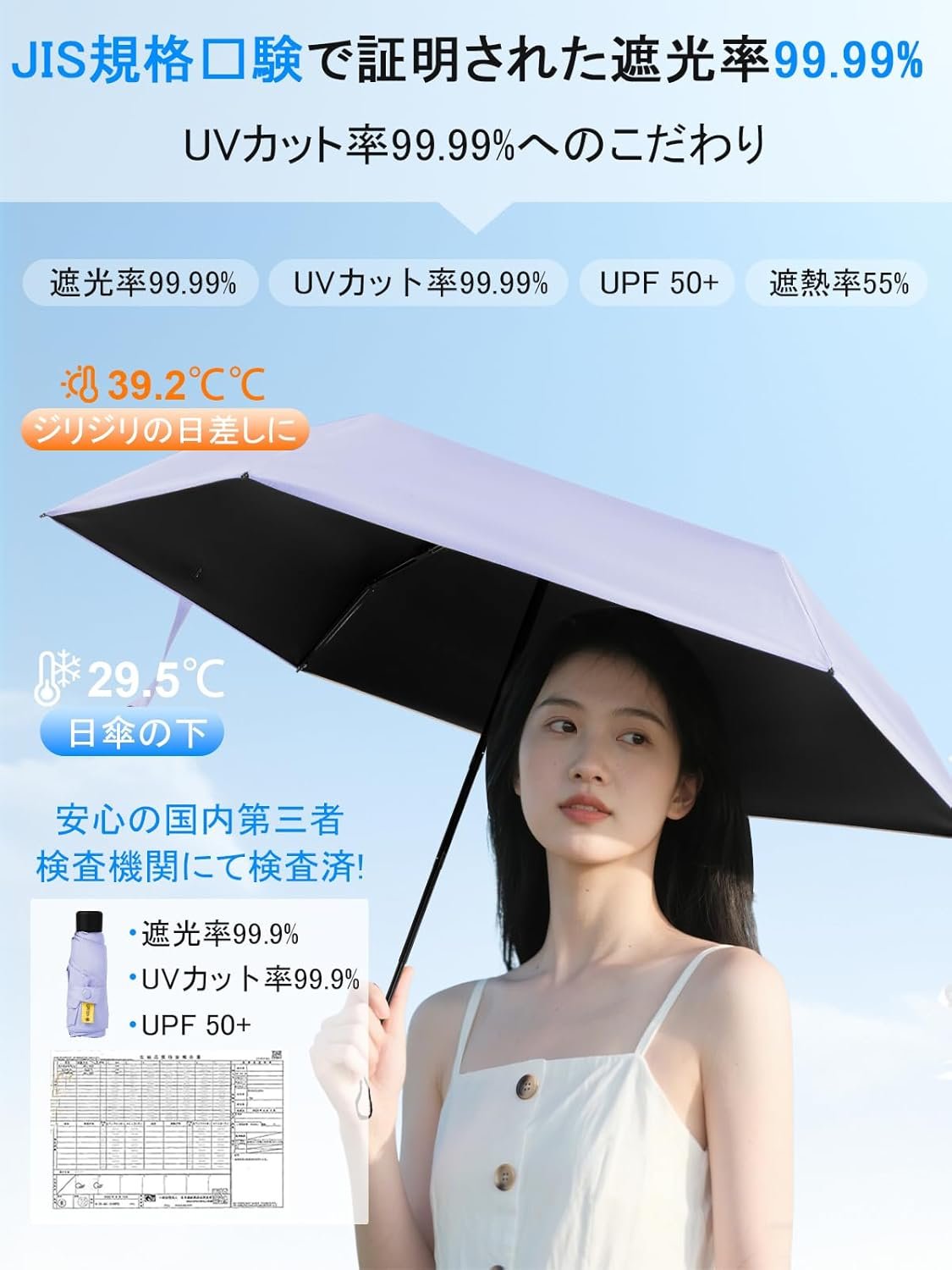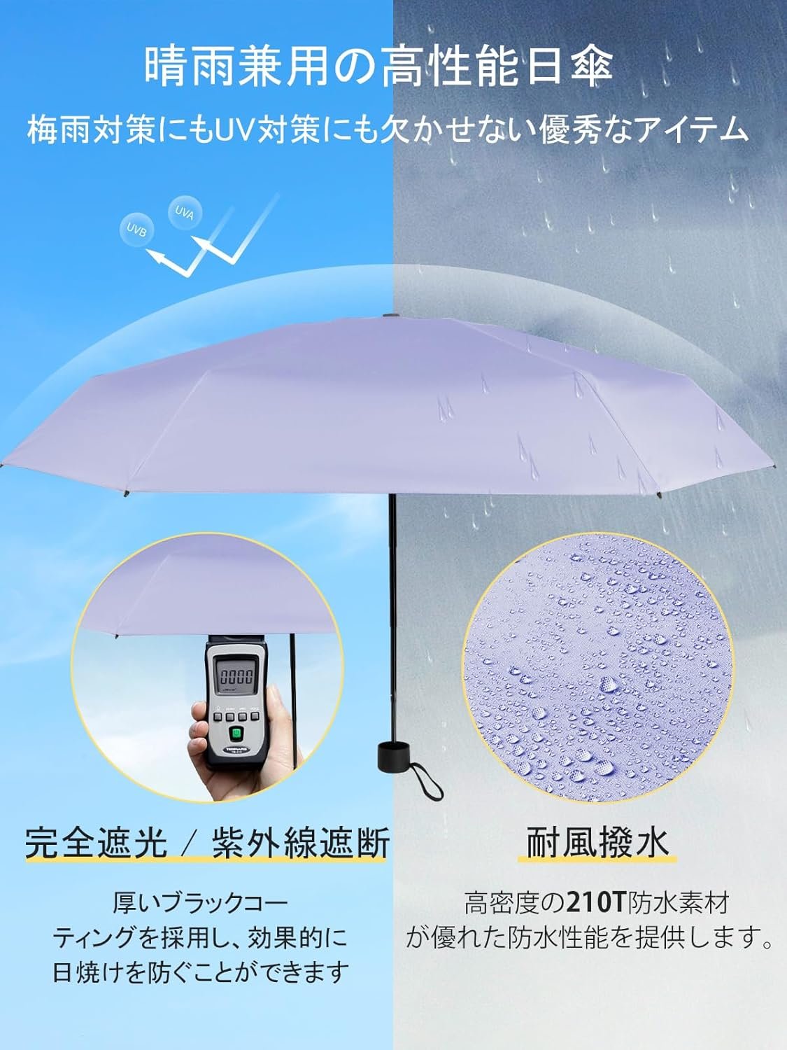🌞☔【UVカット100遮光・UPU】 50+】👍JIS認証:日本の危機な工業基準に適合し、UVカット性能は業界最高水準。UVA/UVBを全警戒遮断し、日よけ効果は普通の日傘をはるかに上回ります。信頼できるJIS認証を取得!国内の第三者機関による検査証明書付きで安心です。この日傘は、超高密度210T防水素材を使用し、優れた防水性能を実現。 厚い黒ノリコーティング加工で、UPF50+のプロ級UVカット効果。 99%の紫外線を遮断し、完全遮光以上&高効率日焼け防止を実現。 日常の通勤からアウトドア活動まで、肌を紫外線からしっかり守る。病気のリスクも軽減します。🌞☔【超軽量&超コンパクトで携帯に便利】この超軽量日傘は航空機級グラスファイバー骨を使用し、折りたたんだ時の厚みはわずか4cm、長さ17cm、約208g! 重量ポケットにすっと収納可能! バッグのスペースをほとんど取らない超スリム設計で、いつでもどこでも気軽に携帯🌞☔【軽量で耐久性に優れたグラスファイバー&晴雨兼用】グラスファイバー製の傘骨は、スチールや鉄製と比べて錆びず、耐熱性優れ、強風や雨にも強いこの折りたたみ傘は晴天時には紫外線や日光を効果的に遮断し、雨天時にはしっかり予防、一年中使用可能です。 雨季や紫外線対策には欠かせない優れたアイテムです!グ技術を採用しており、雨水が触れると滑り落ち、浸透せず跡も残りません。 あえて使用しても爽やかな状態を見極め、軽く振るだけで水分が落ち、拭き取りの手間がかかりません。傘はシンプルなデザインで無地仕様となっており、限りなく、あらゆるシーンやスタイルに合わせてお使いいただけます。軽く振るだけで水分が落ち、拭きとりの手間がかかりません。緻密なステッチ+シーリング加工により、豪雨時でも雨水の浸入を効果的にブロックし、内部を乾いた状態にてお選びいただけます。 この日傘はシンプルなデザインで無地仕様となっており、どんなシーンでもスタイルに合わせてお使いいただけます。