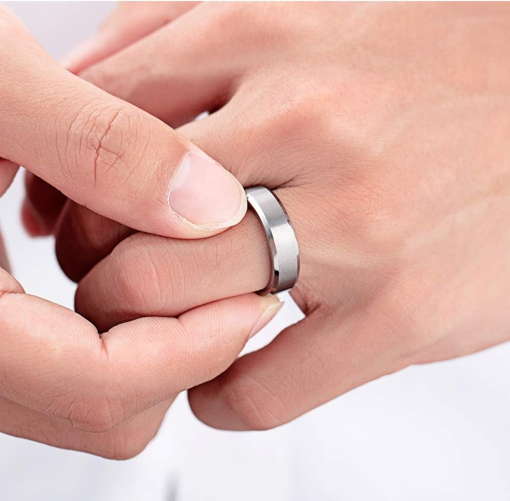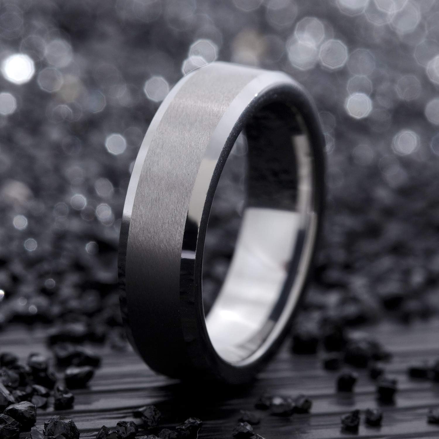 Rockyu Jewelry Brand人気チタンリング、メンズリング、マット仕上げ、ブラックリング、贅沢、フラット、0.3インチ(8 mm)幅、シンプルなファッションアクセサリー、タングステン、タングステンシルバー幅6mm