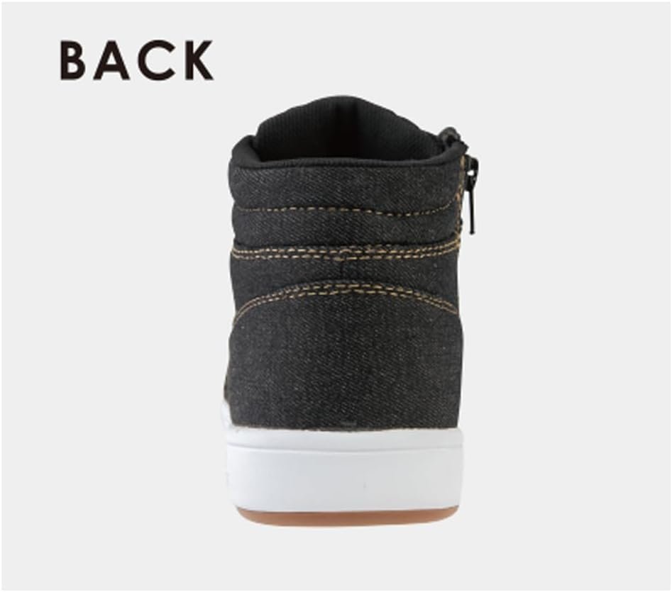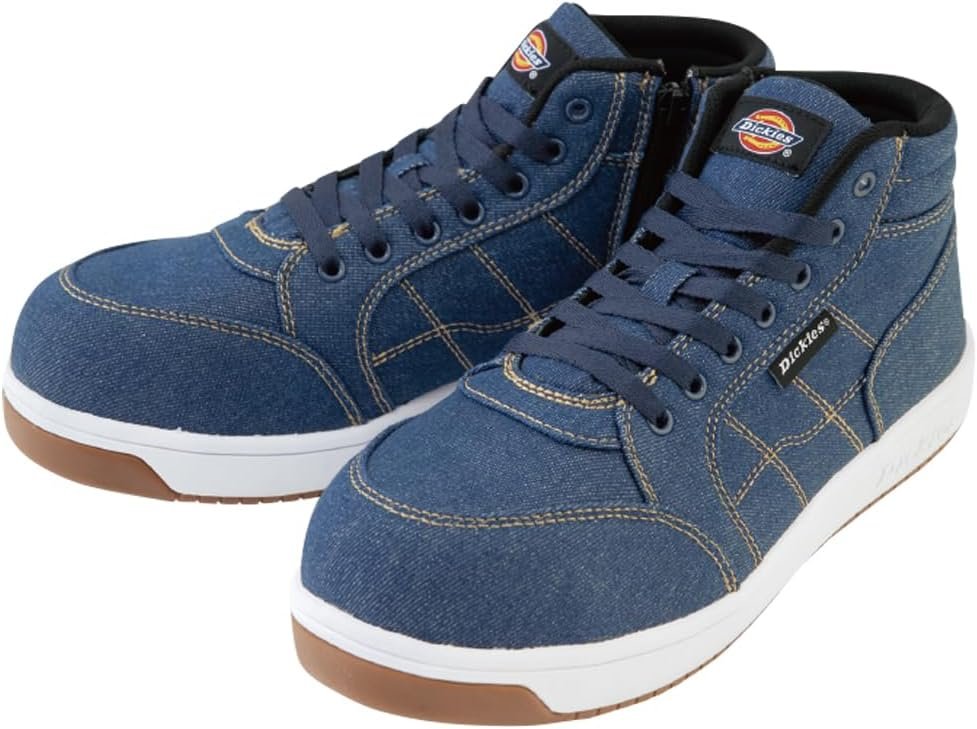 デニム素材のディッキーハイカットセーフティーシューズ。内側ファスナー付きで着脱が容易です。