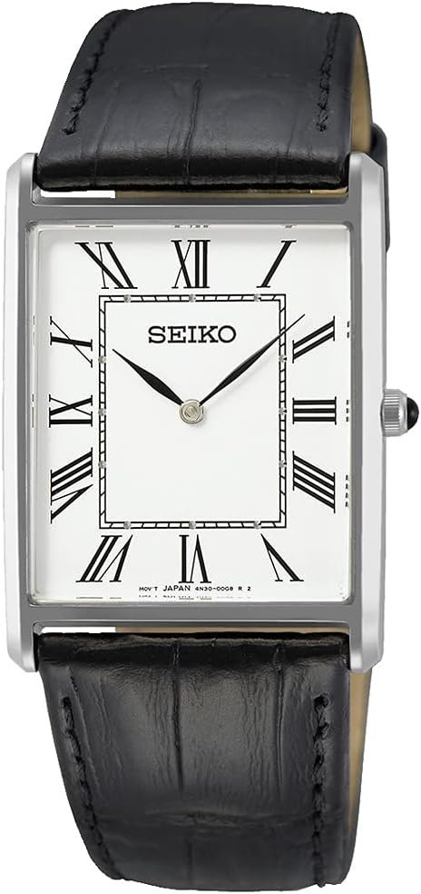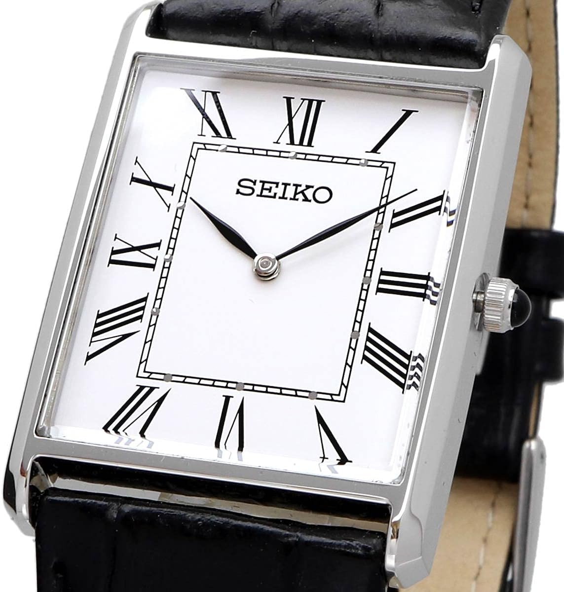 セイコーSWR049メンズウィストウォッチ、スクエアデザイン、クォーツ、ホワイトダイヤルxブラックレザーバンド、クラシック