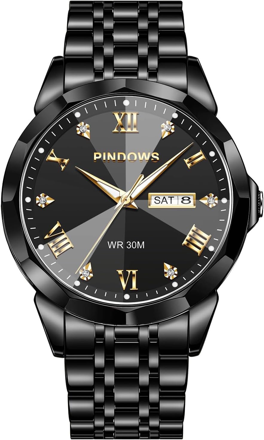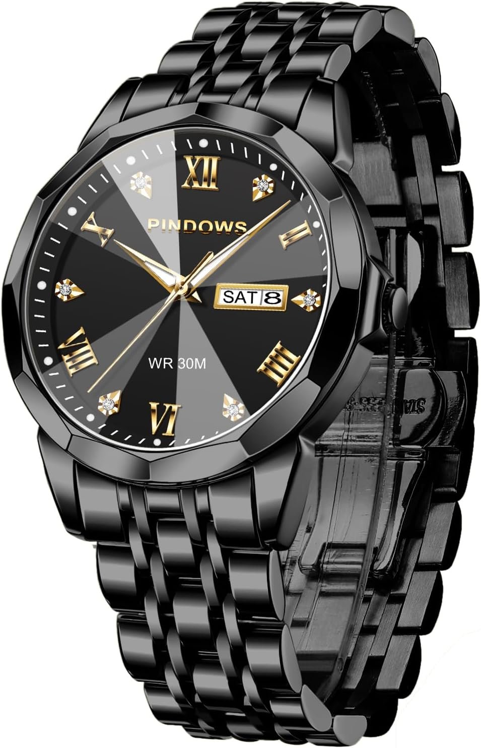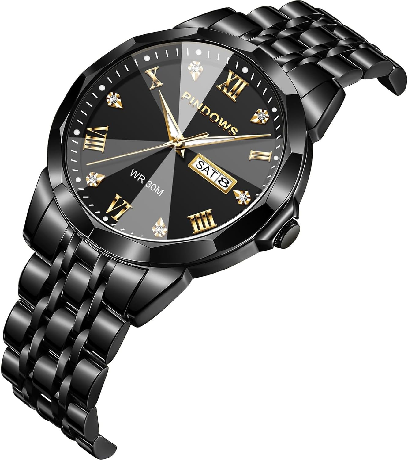ピンドウメンズウォッチダイヤモンドビジネスドレスアナログクォーツウォッチラグジュアリー防水輝く日付2トーンステンレススチールバンドクラシックファッションメンウォッチ、ブラックバンドダイヤル、クラシック、ファッション、ビジネス