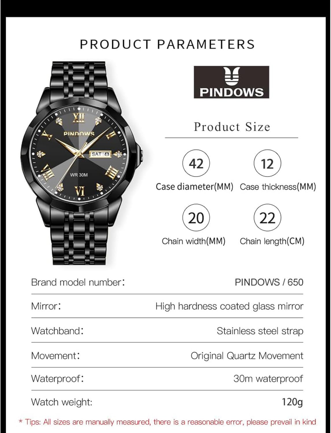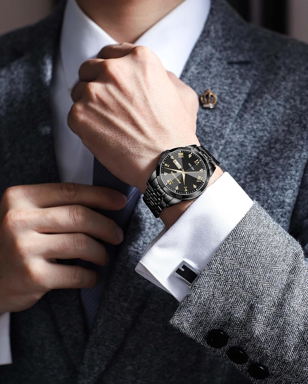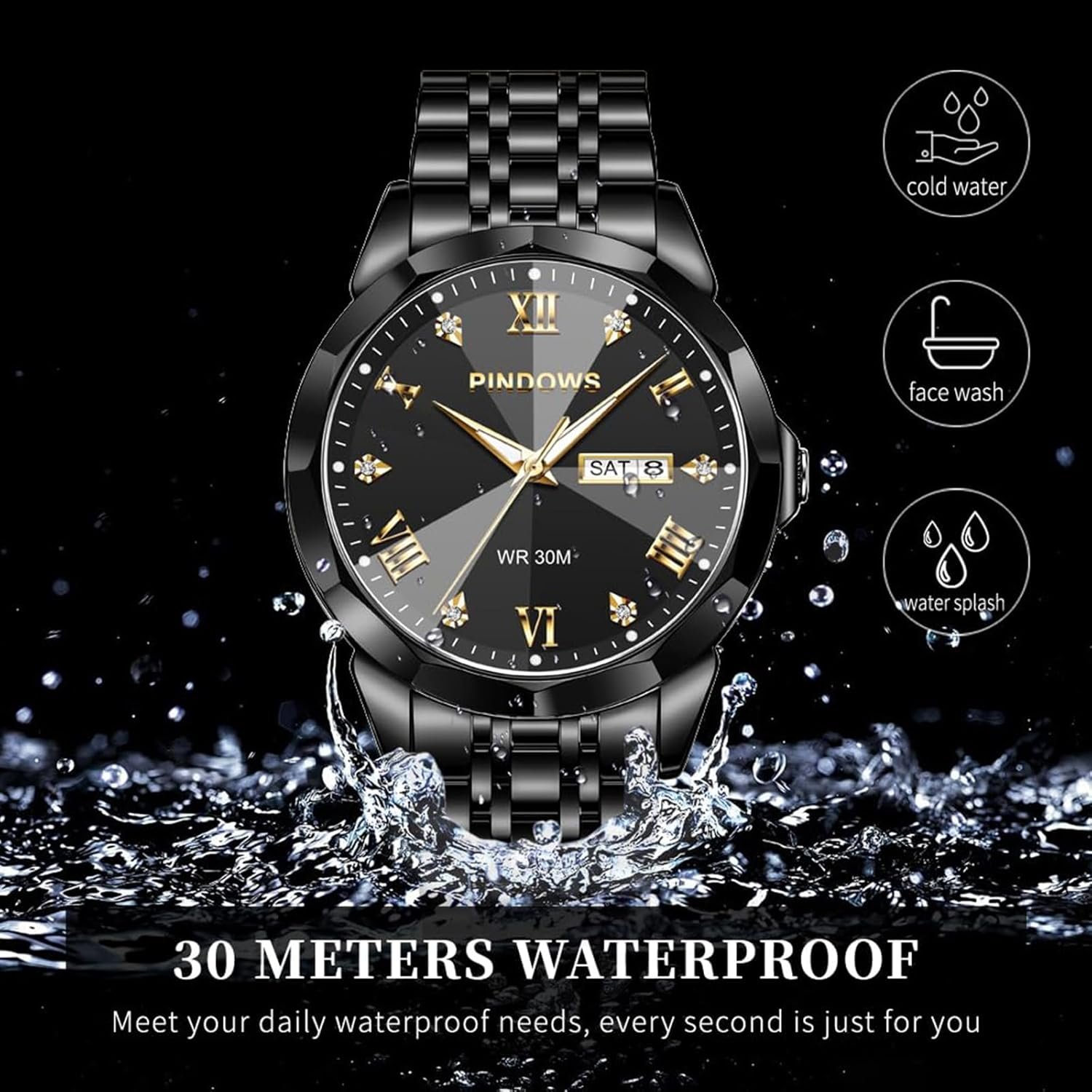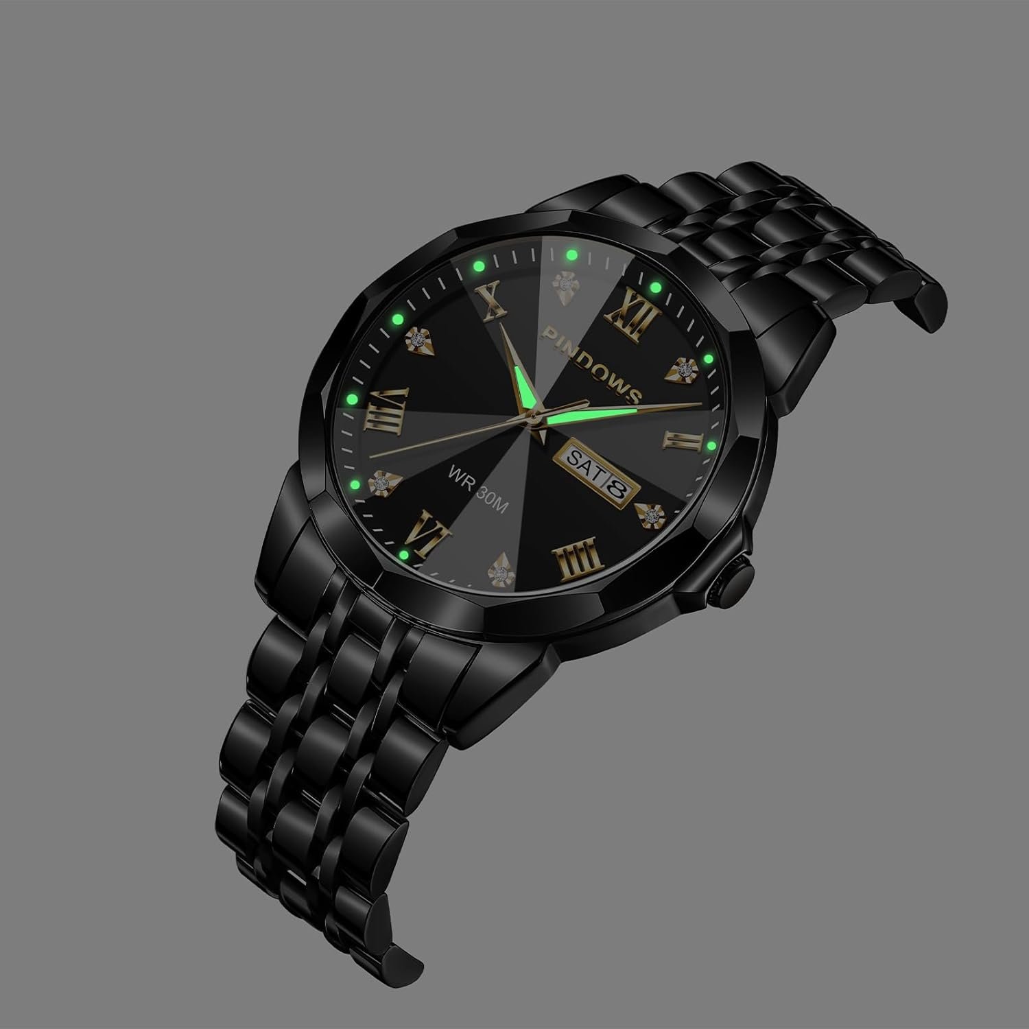 ピンドウメンズウォッチダイヤモンドビジネスドレスアナログクォーツウォッチラグジュアリー防水輝く日付2トーンステンレススチールバンドクラシックファッションメンウォッチ、ブラックバンドダイヤル、クラシック、ファッション、ビジネス