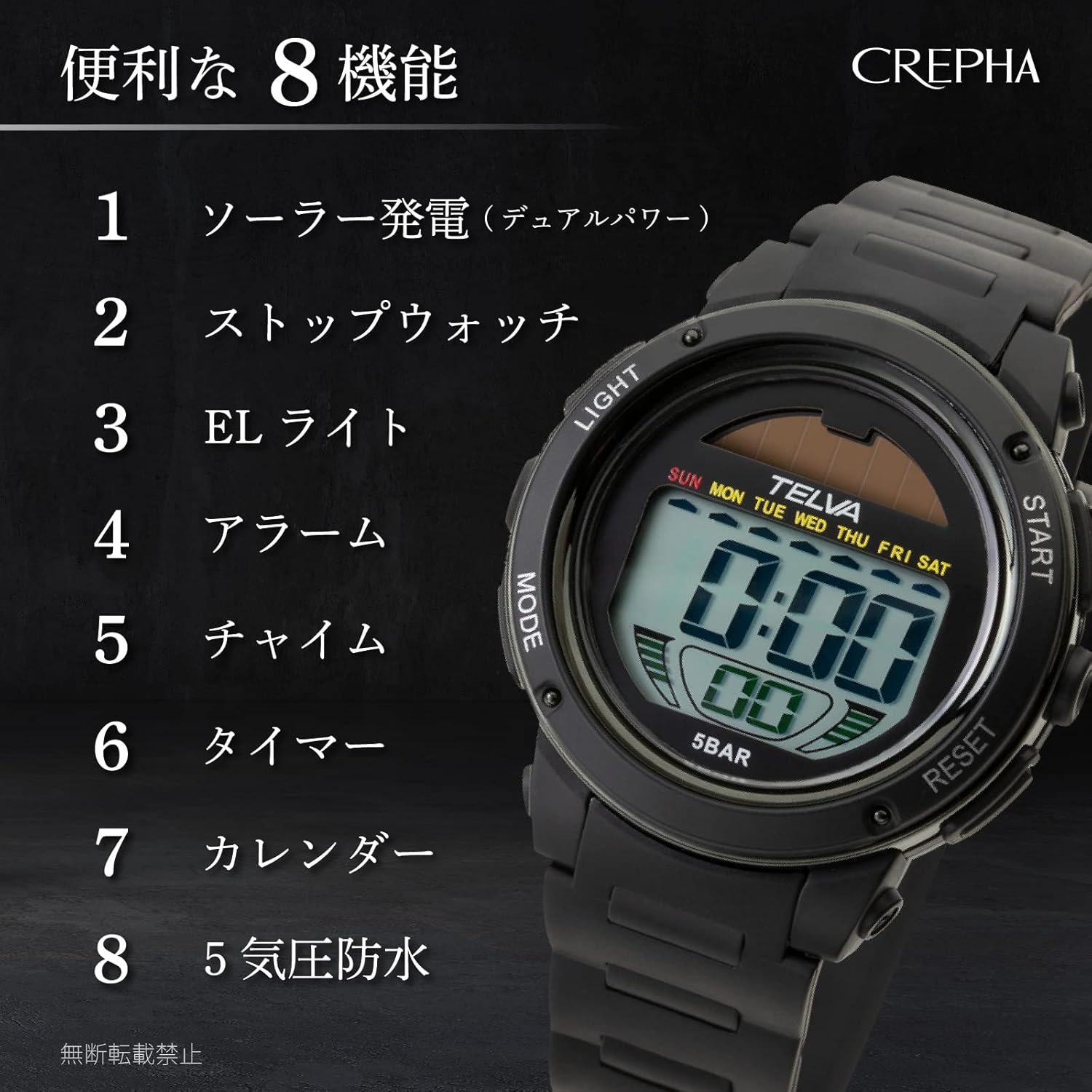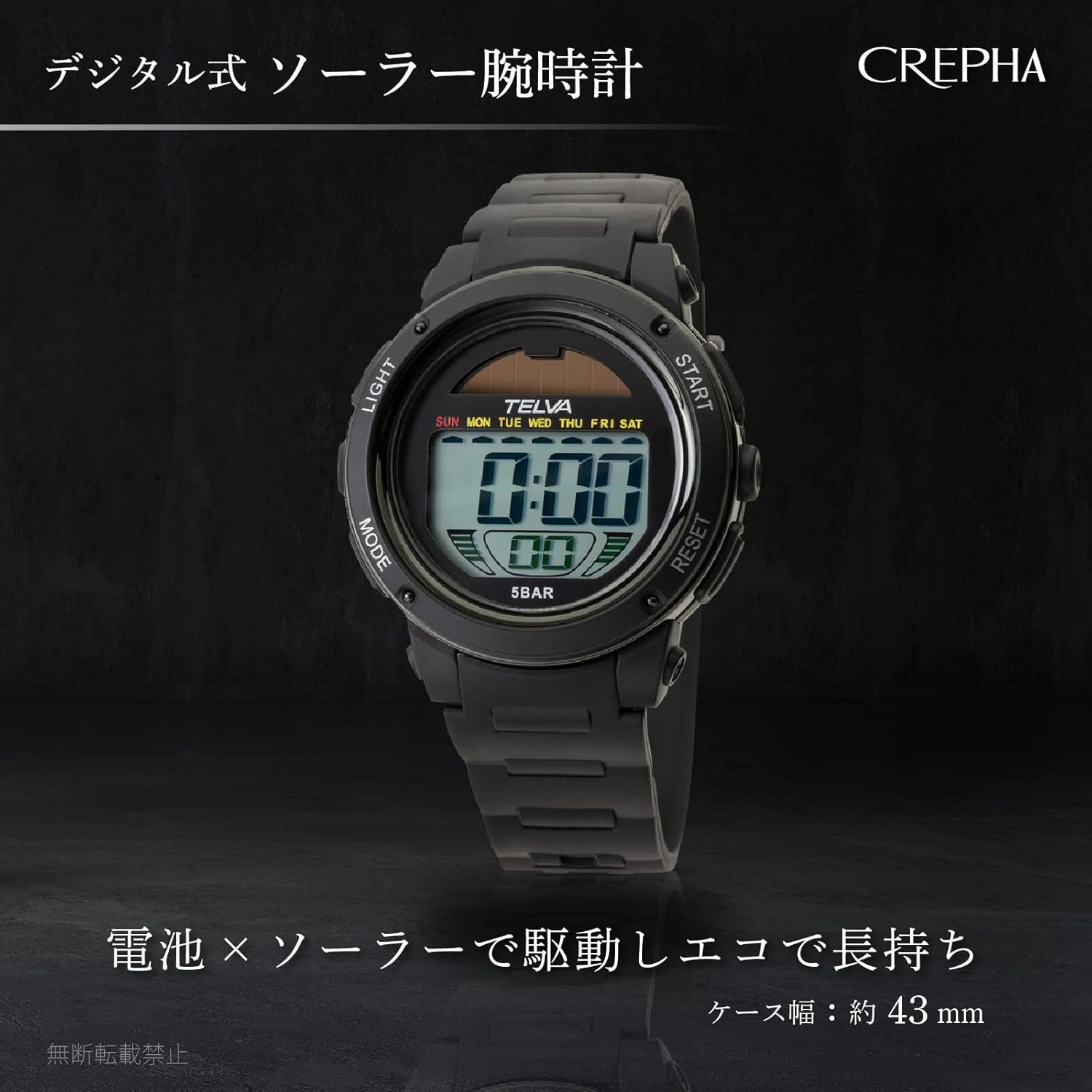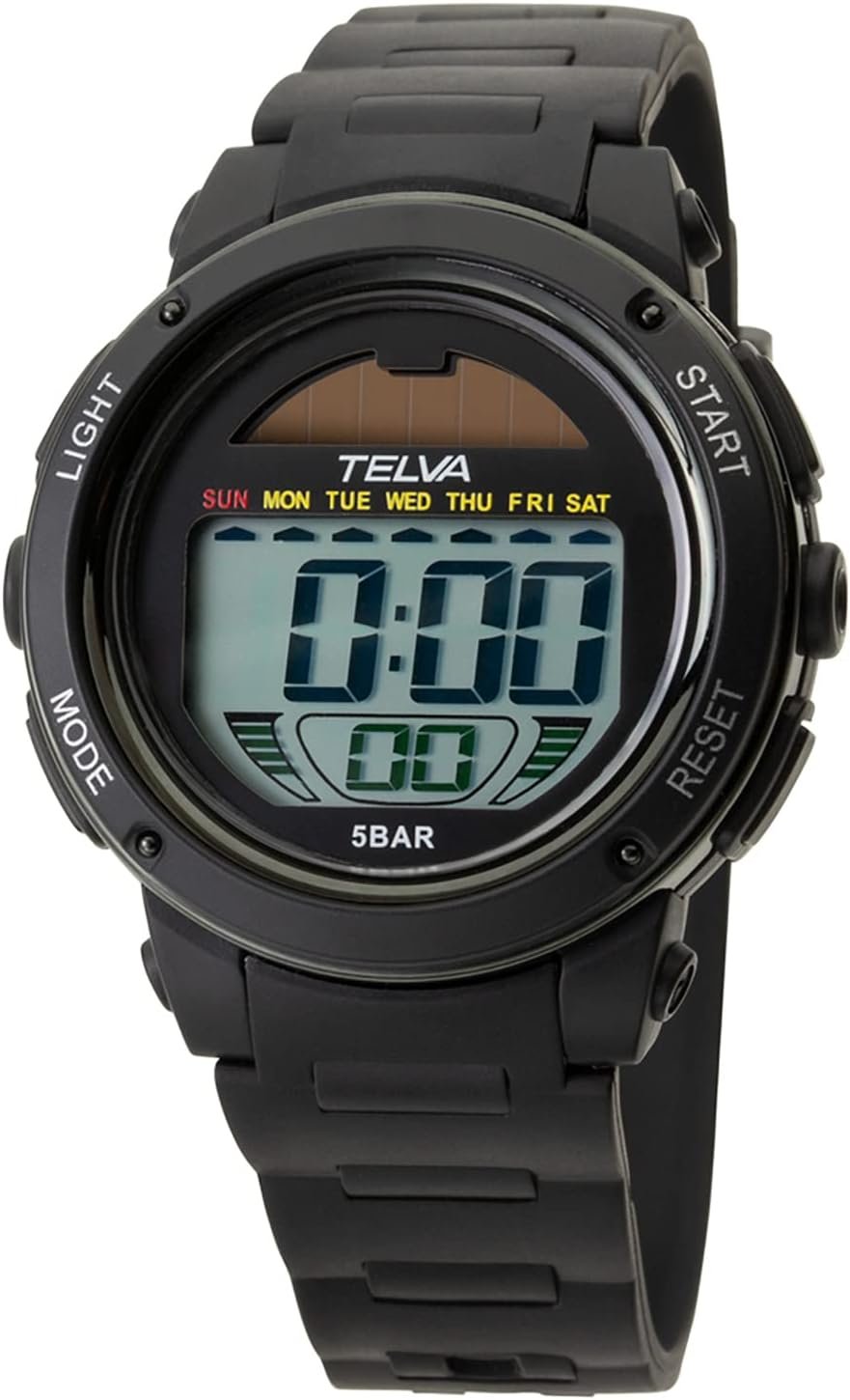 Clefer TE-D192-BKメンズデジタルリストウォッチ、ソーラー、充電式、ウレタンストラップ、ブラック、ブラック