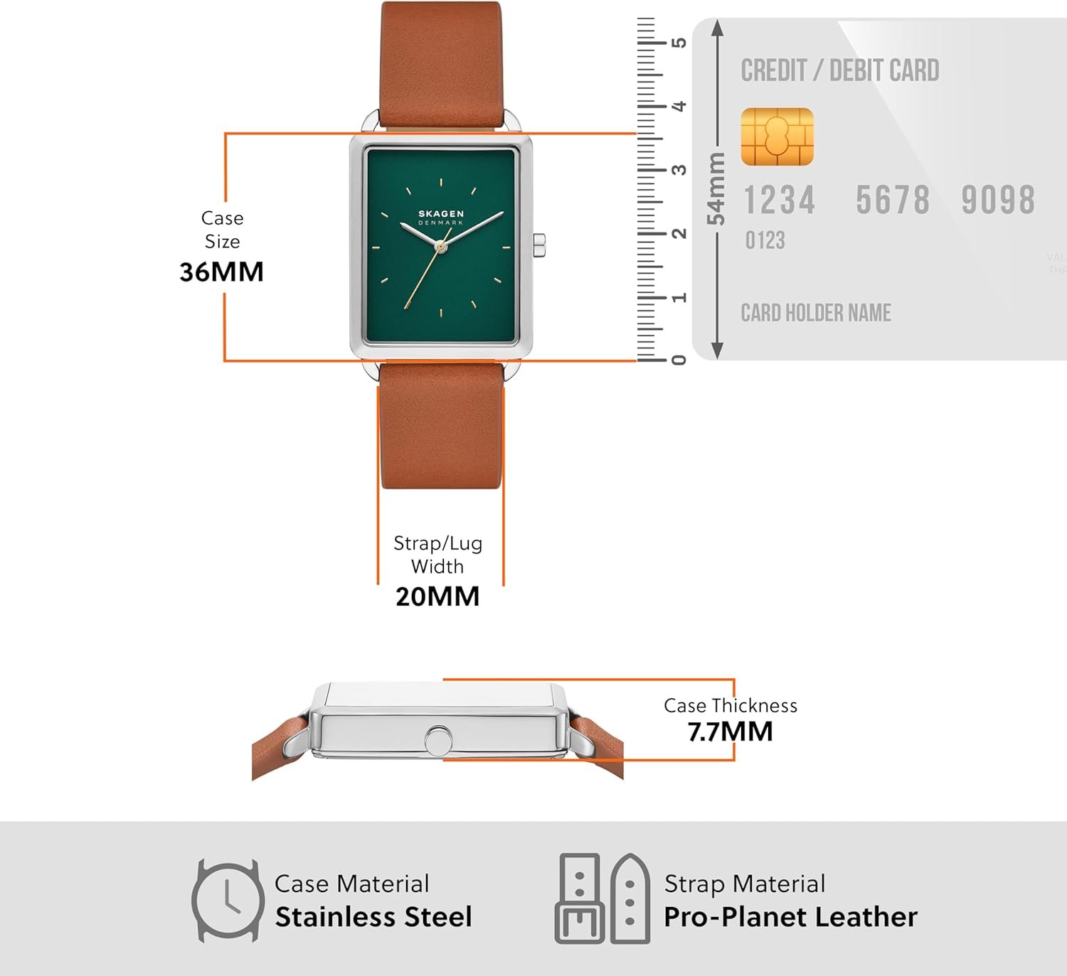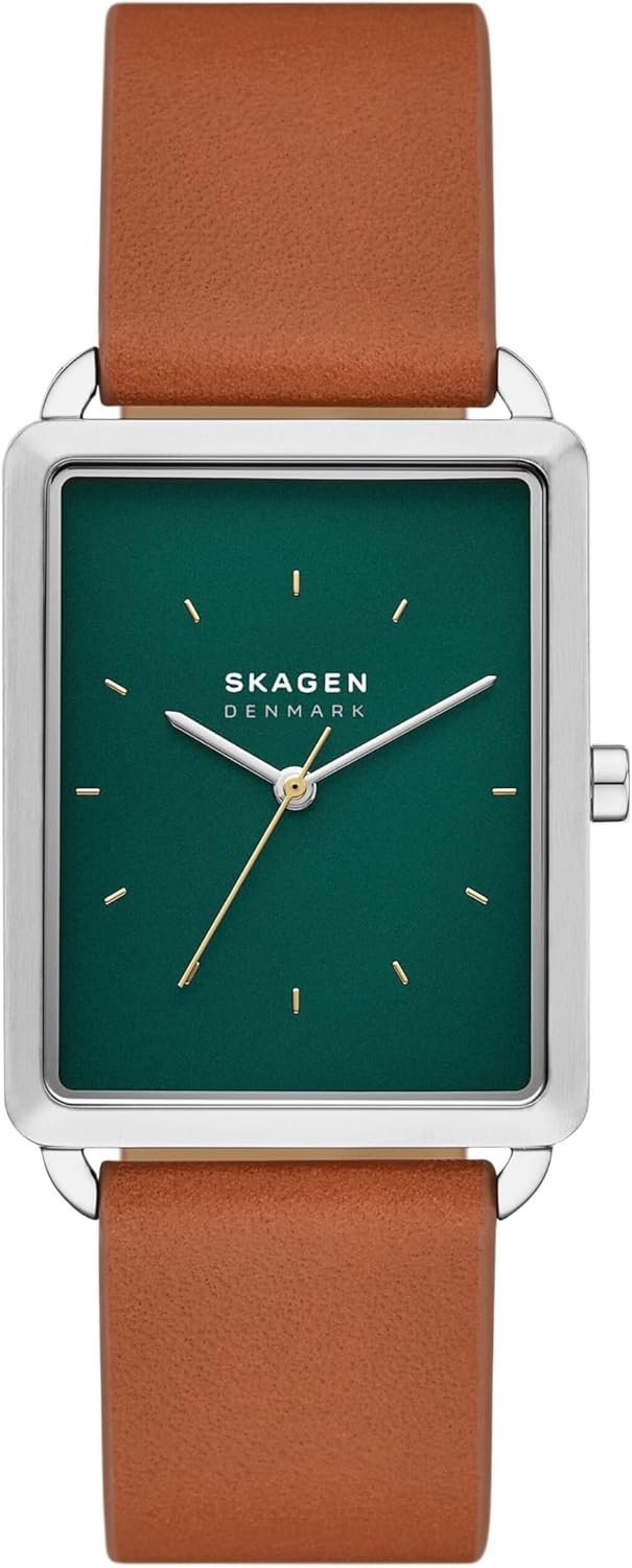 ハーゲンは、36mmの動きを備えた直径36mmのケースを特徴としています。茶色の革のストラップ付きのサンドブラストグリーンダイヤル