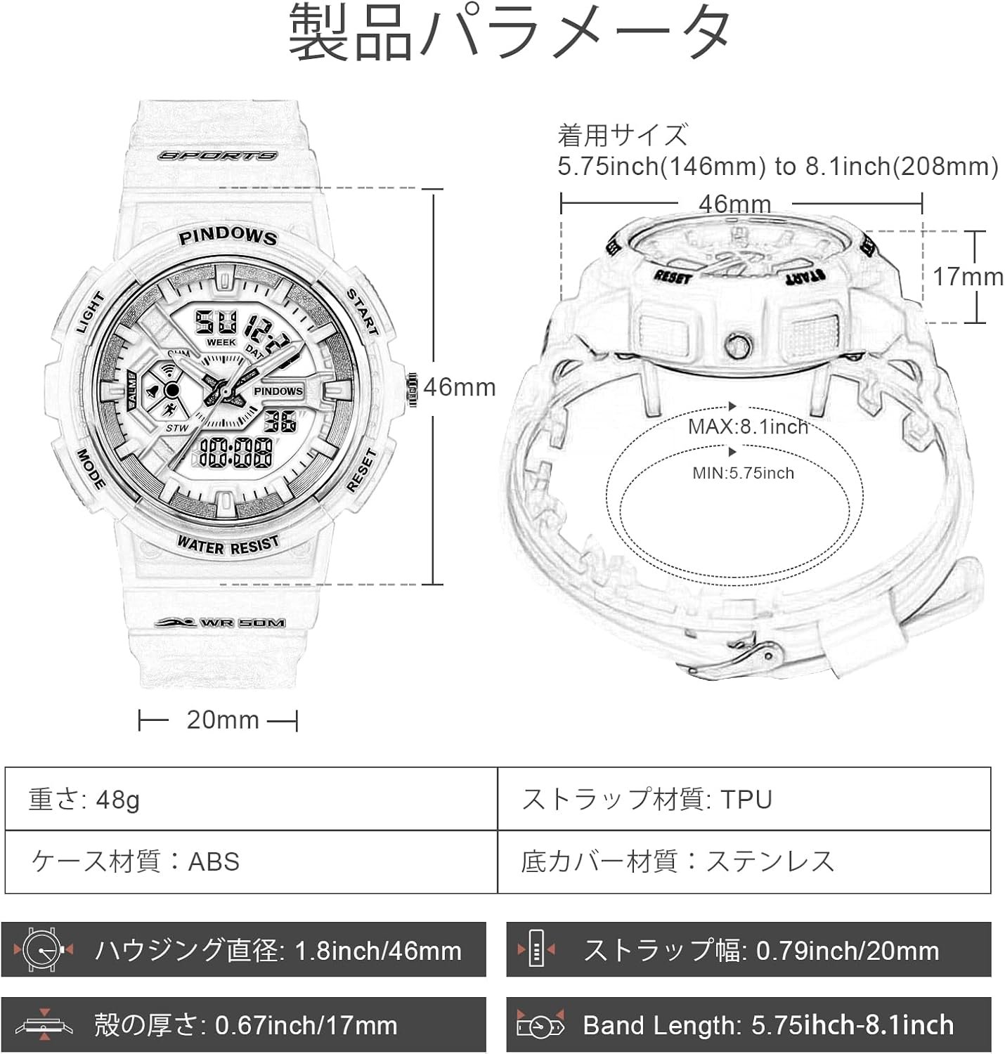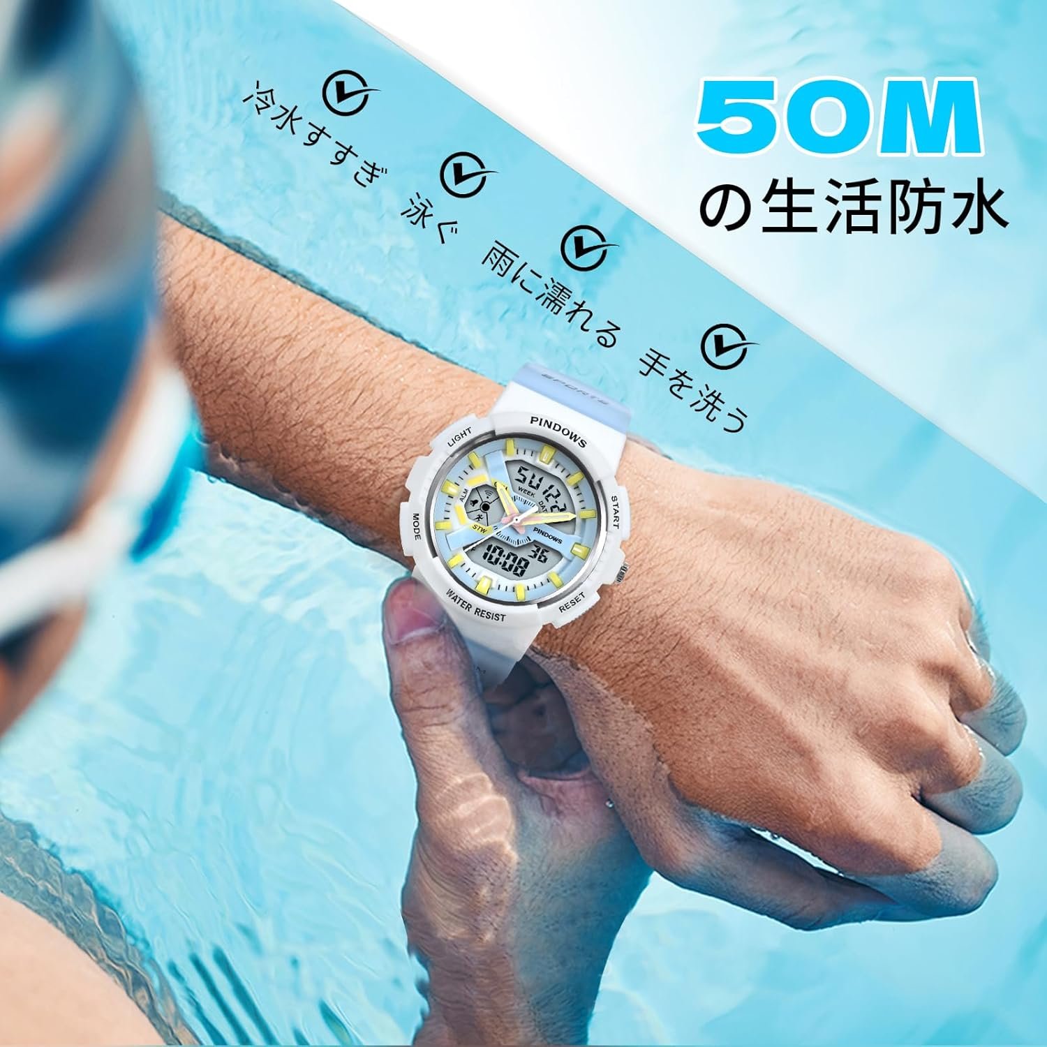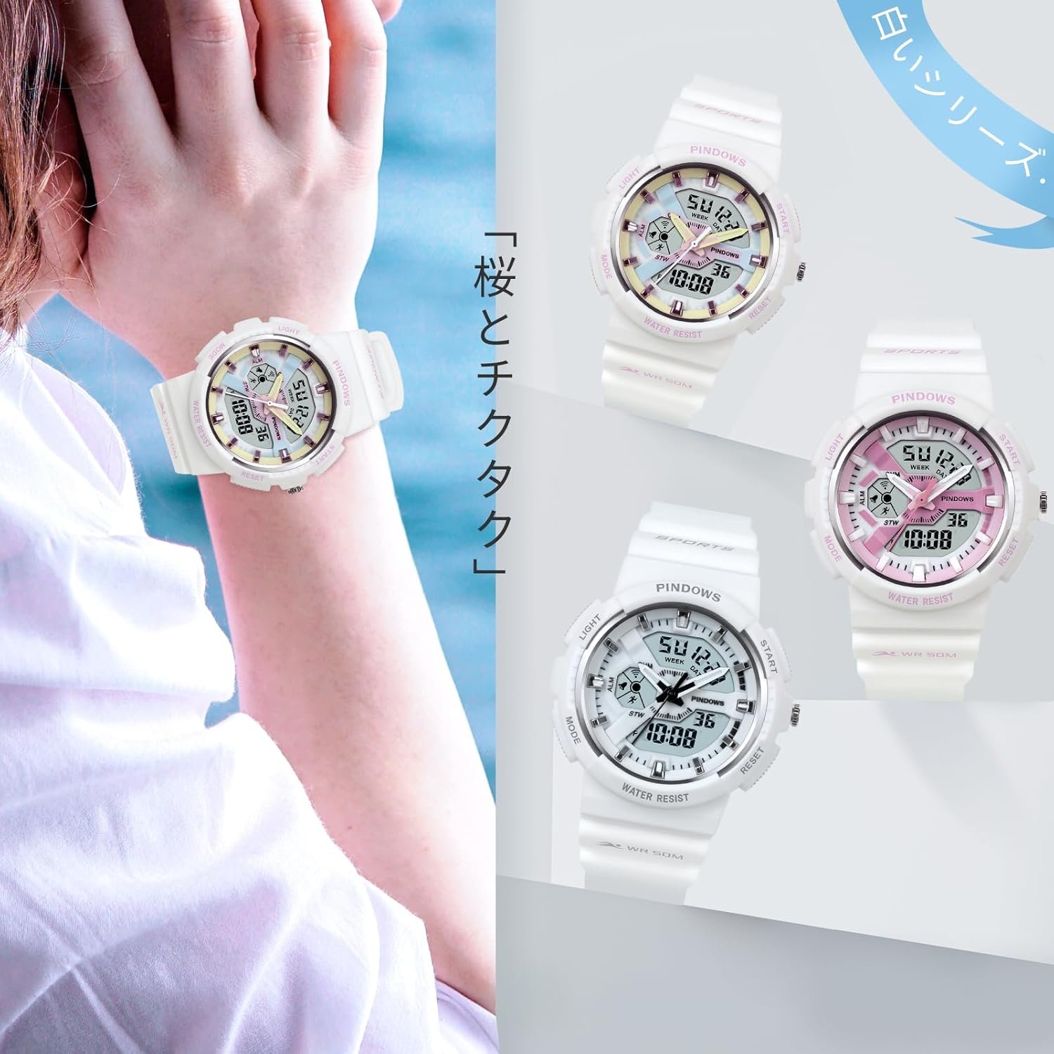 Pindows Women’s Analog Digital LED Backlight 50m防水マルチファンクションスポーツウォッチアウトドアアクティビティ、637N12:ホワイト、クラシック