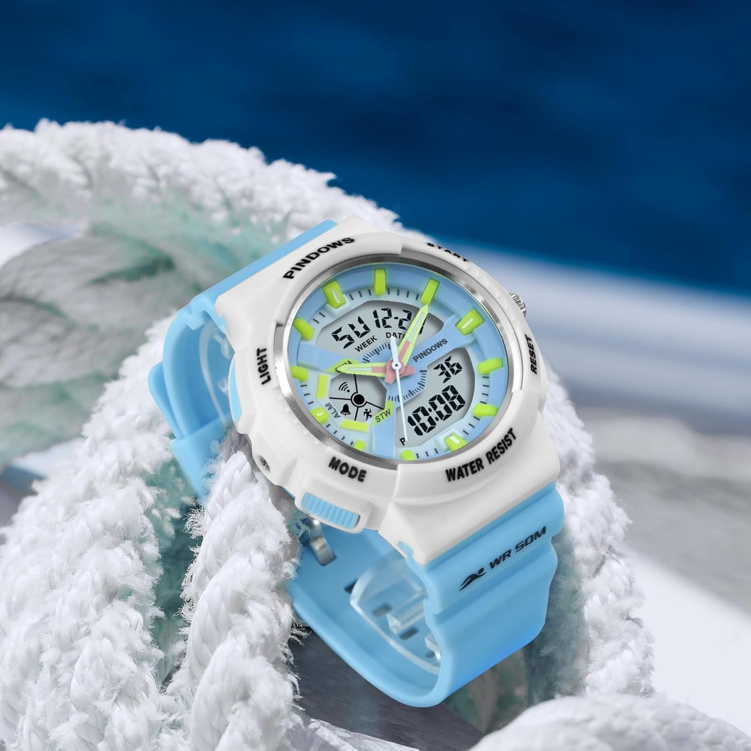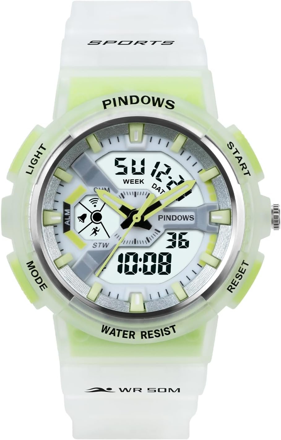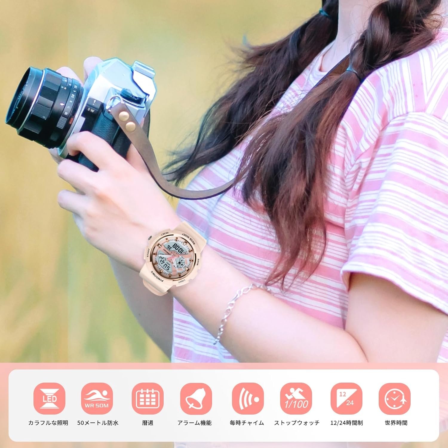 Pindows Women’s Analog Digital LED Backlight 50m防水マルチファンクションスポーツウォッチアウトドアアクティビティ、637N12:ホワイト、クラシック