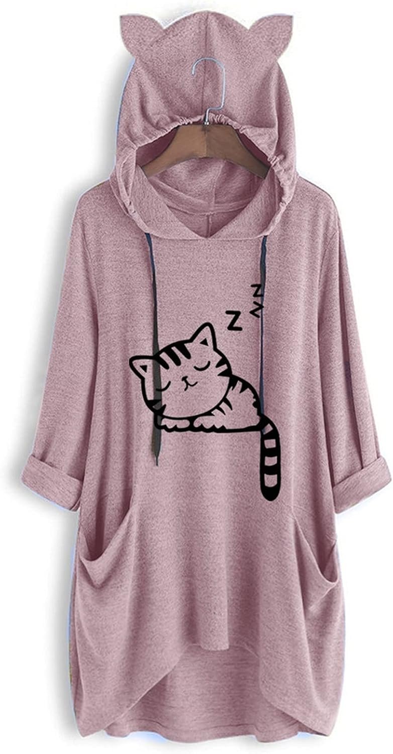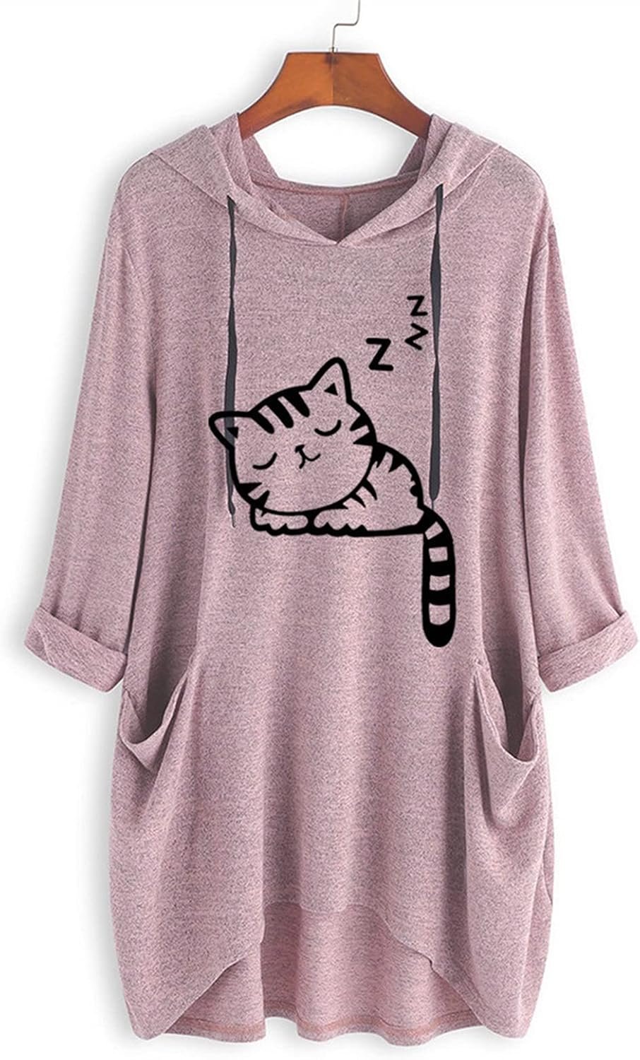 特徴:漫画プリント、猫プリント、タイダイプリント、長袖、フード付きラグランスリーブ、ドロップショルダー、女性用巾着パーカー
