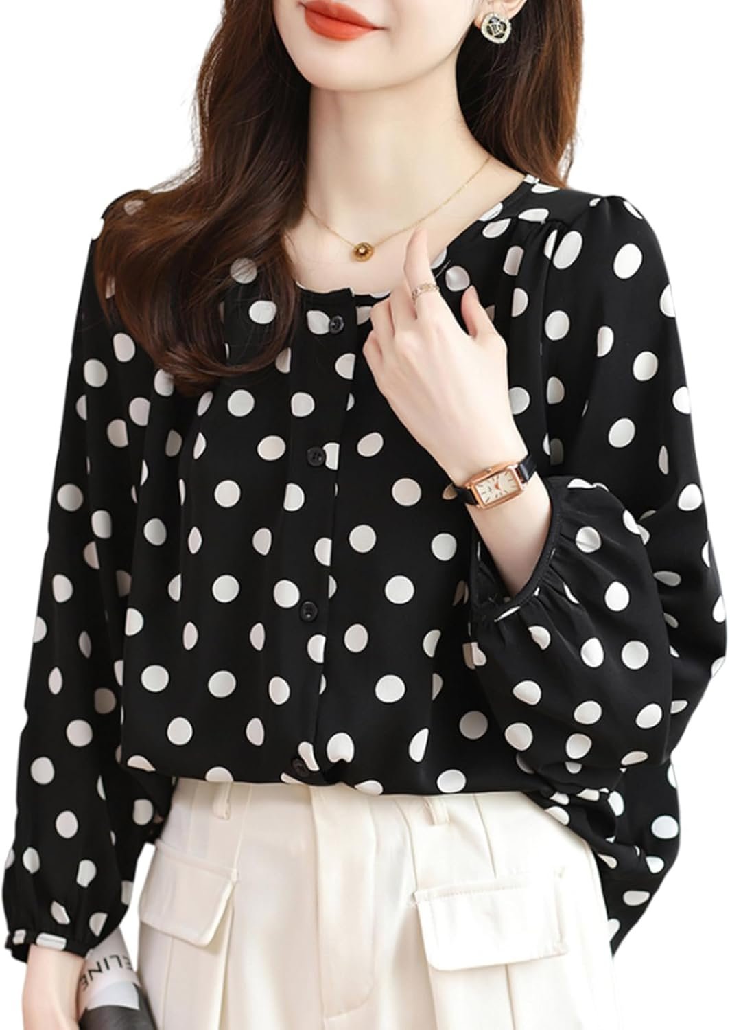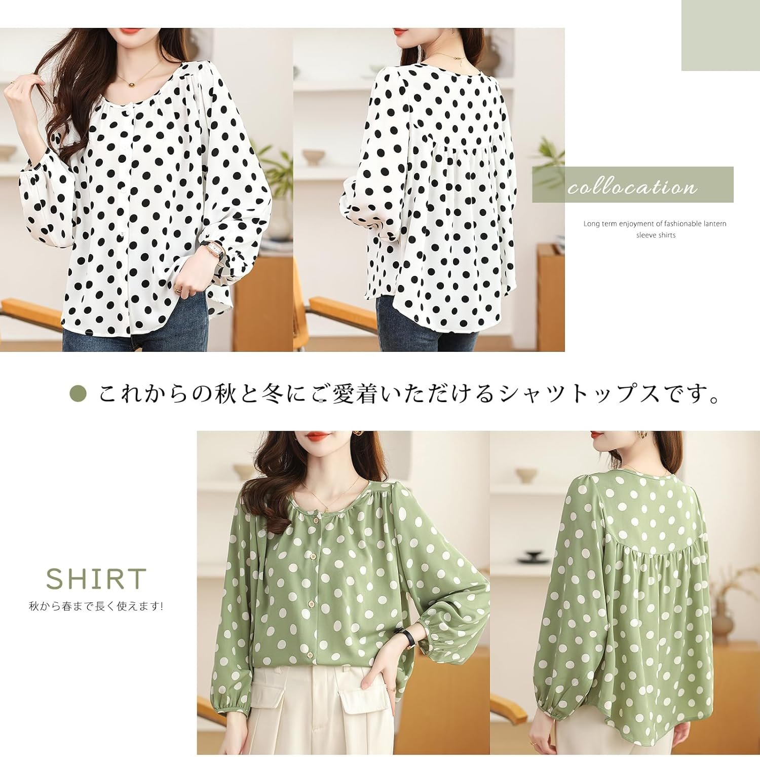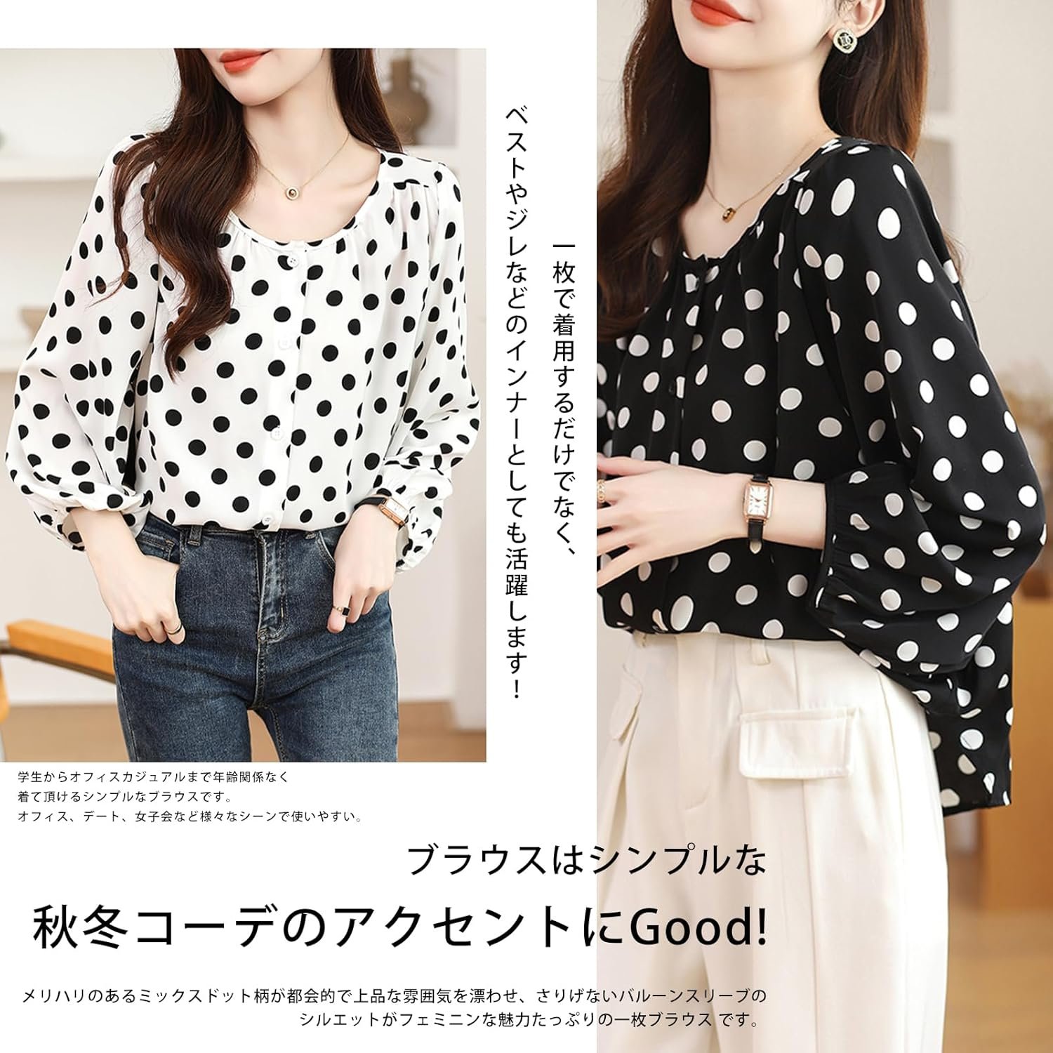 これからの秋冬に着ていただけるシャツトップスです。フォーマルにもデイリーにも使える万能ブラウスです。学生からオフィスカジュアルまで年齢問わず着られるシンプルなブラウスです。オフィス、デート、女子会など様々なシーンで使いやすいです。くっきりとしたミックスドット柄が都会的で上品な雰囲気を醸し出し、さりげないバルーンスリーブのシルエットが女性らしさを醸し出します。