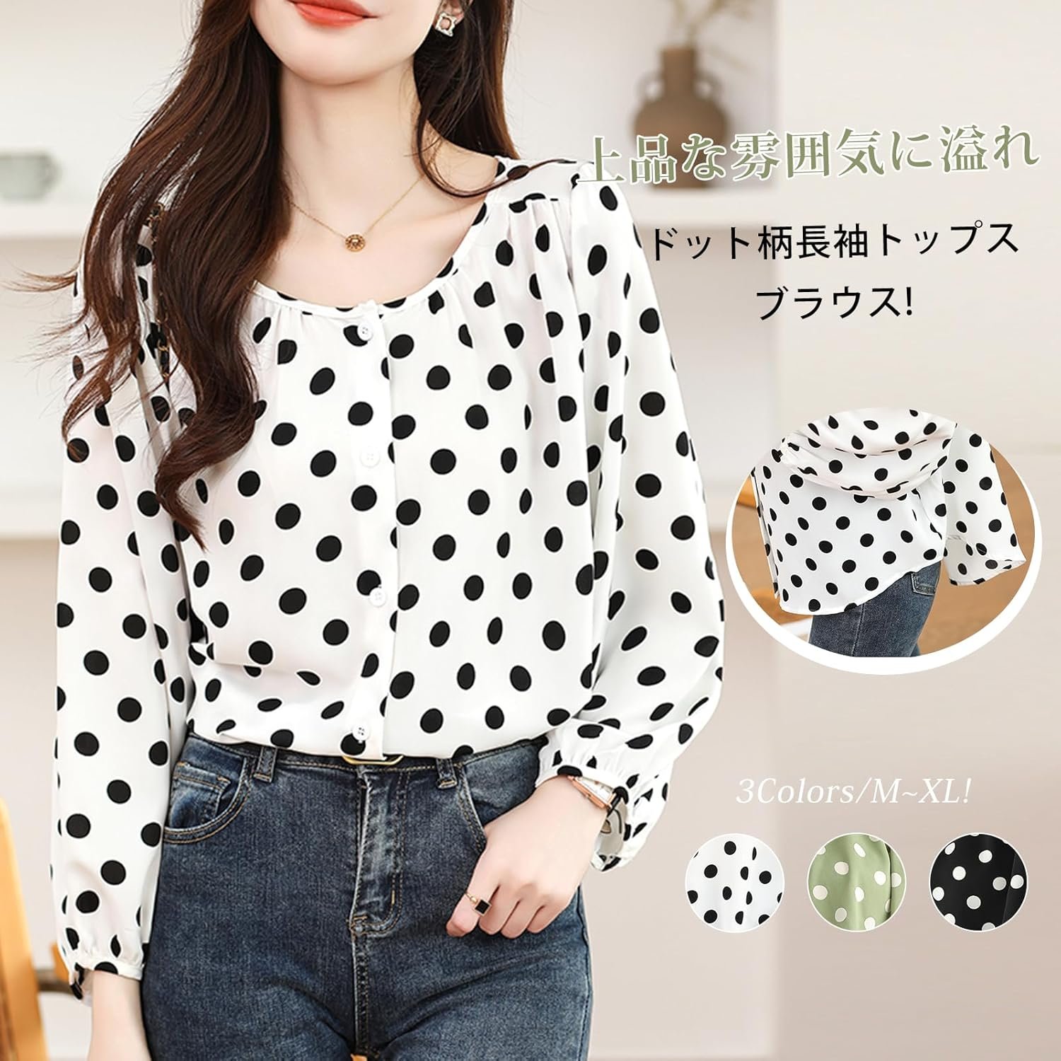 きれいめにもカジュアルにも合います。程よい甘さのシフォントップスにドット柄が上品さと可愛らしさをプラスします。長袖でこれからの季節にぴったりです。体型カバーして細見え効果も期待できます。ディテールにこだわった、着映えするデザインのブラウスです。ドット柄は流行り廃りのない定番デザインです。大人のきれいめコーデに大活躍間違いなしの長袖ブラウスです。