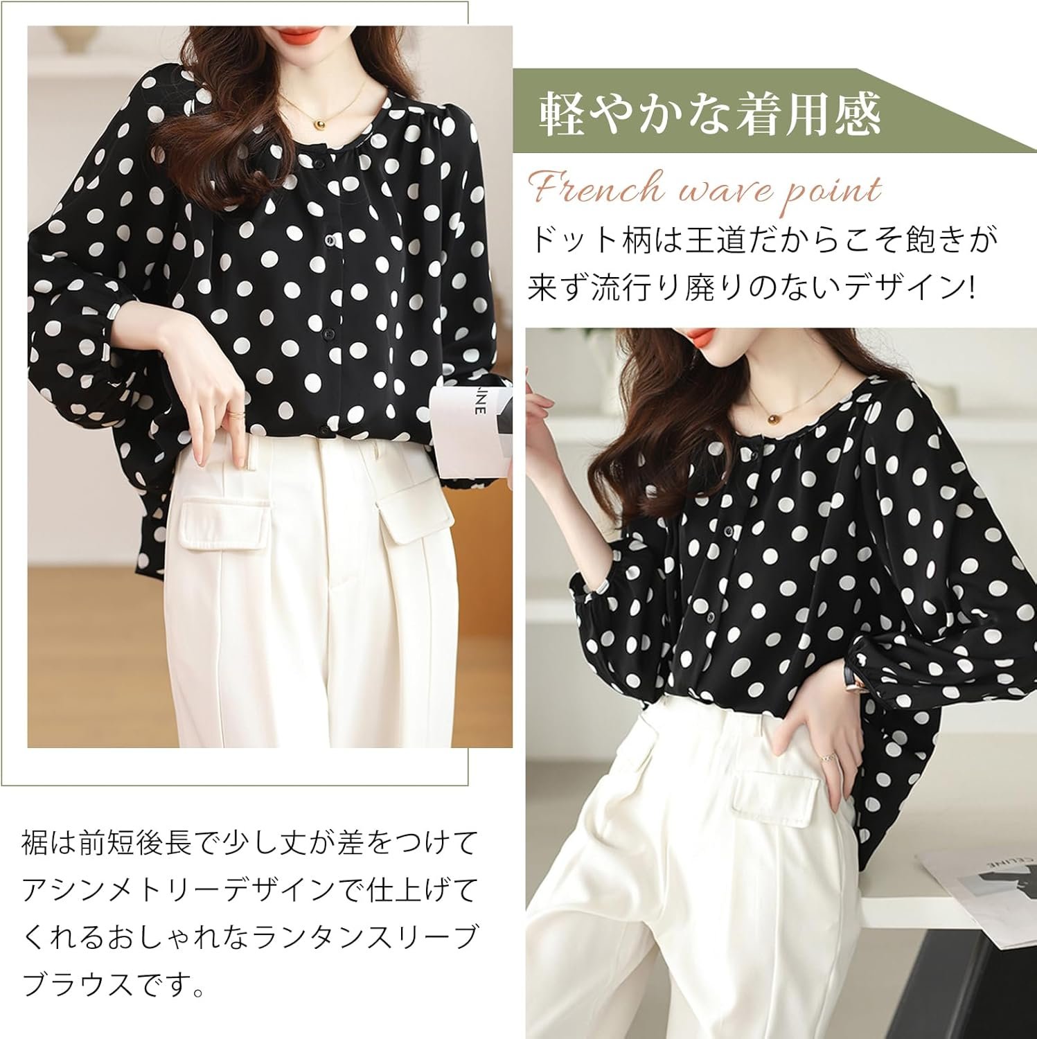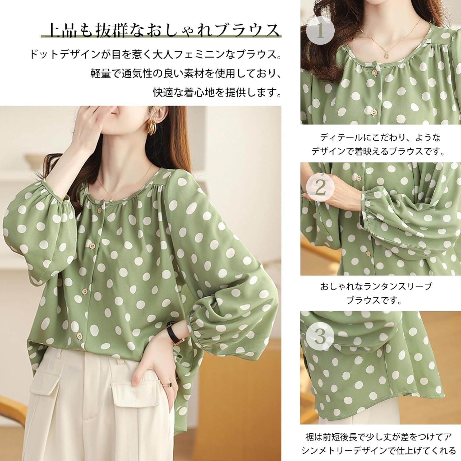 ドットデザインが大人フェミニンなブラウスです。軽くて通気性の良い素材で着心地も良く、落ち着いた素材が大人カジュアルな女性らしさを演出します。ボトムスを選ばず相性抜群。いつものコーデを格上げしてくれる「映えブラウス」です。季節を問わず、重ね着や重ね着でロングシーズンお使いいただけます。