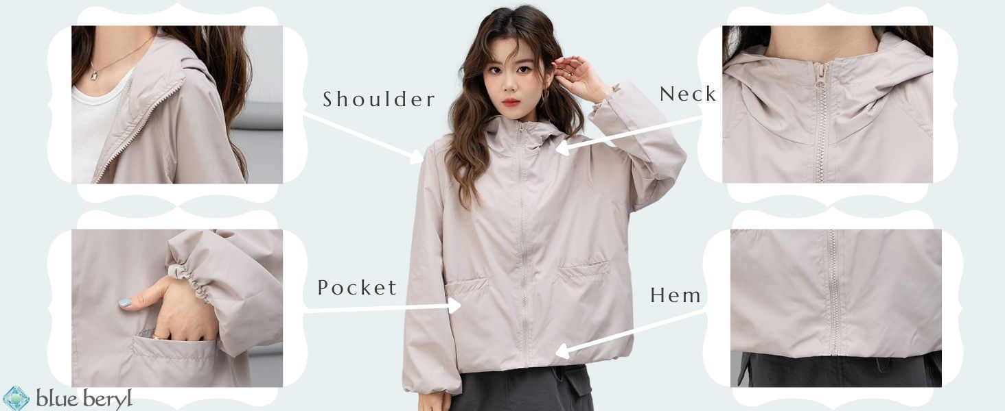 Blue beryl BB074 Women’s Zip-up Blouson with Hood, Lightweight, Outerwear, UV Protection, Puff Sleeve, Stand Collar, Loose Fit, Lined