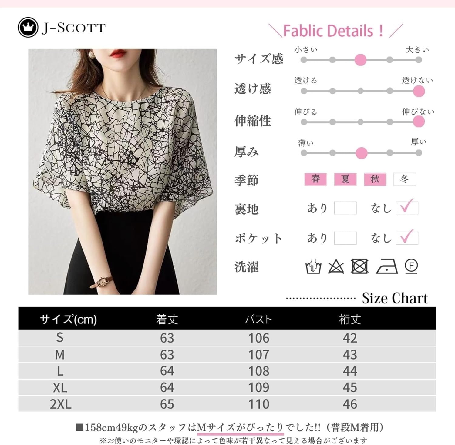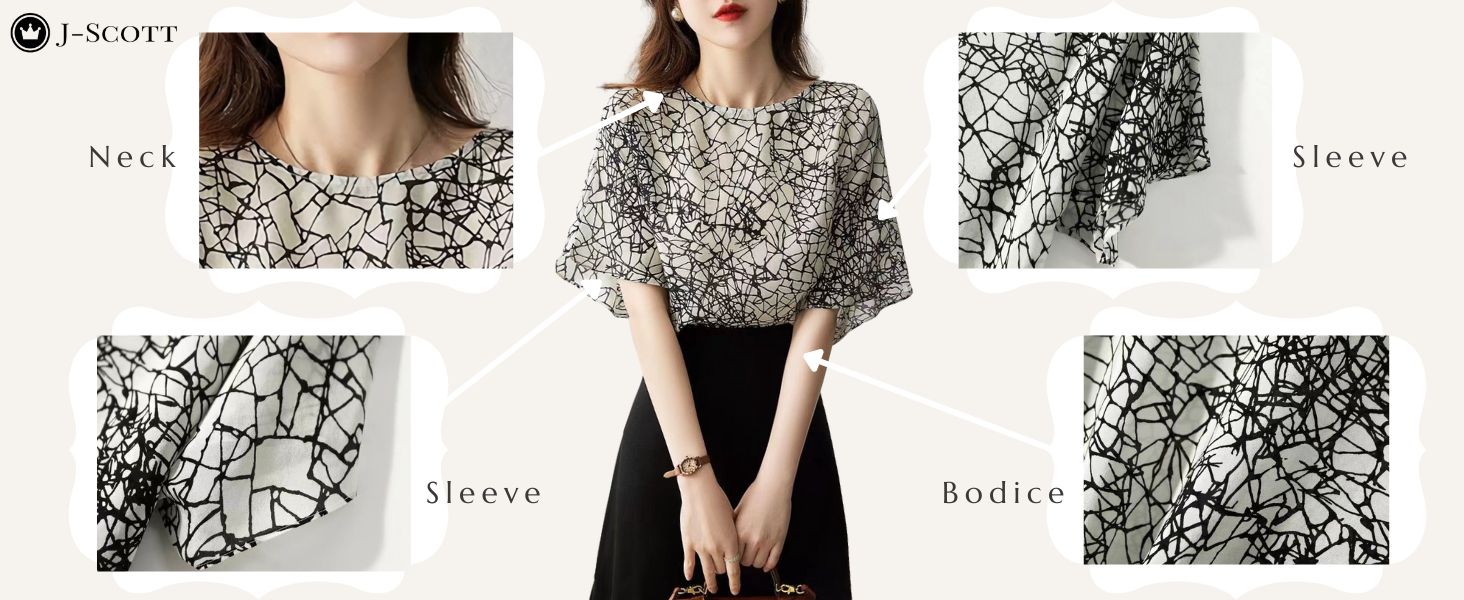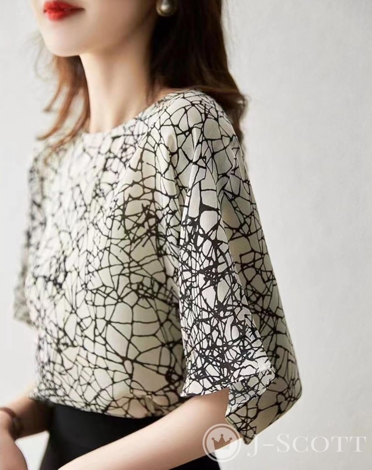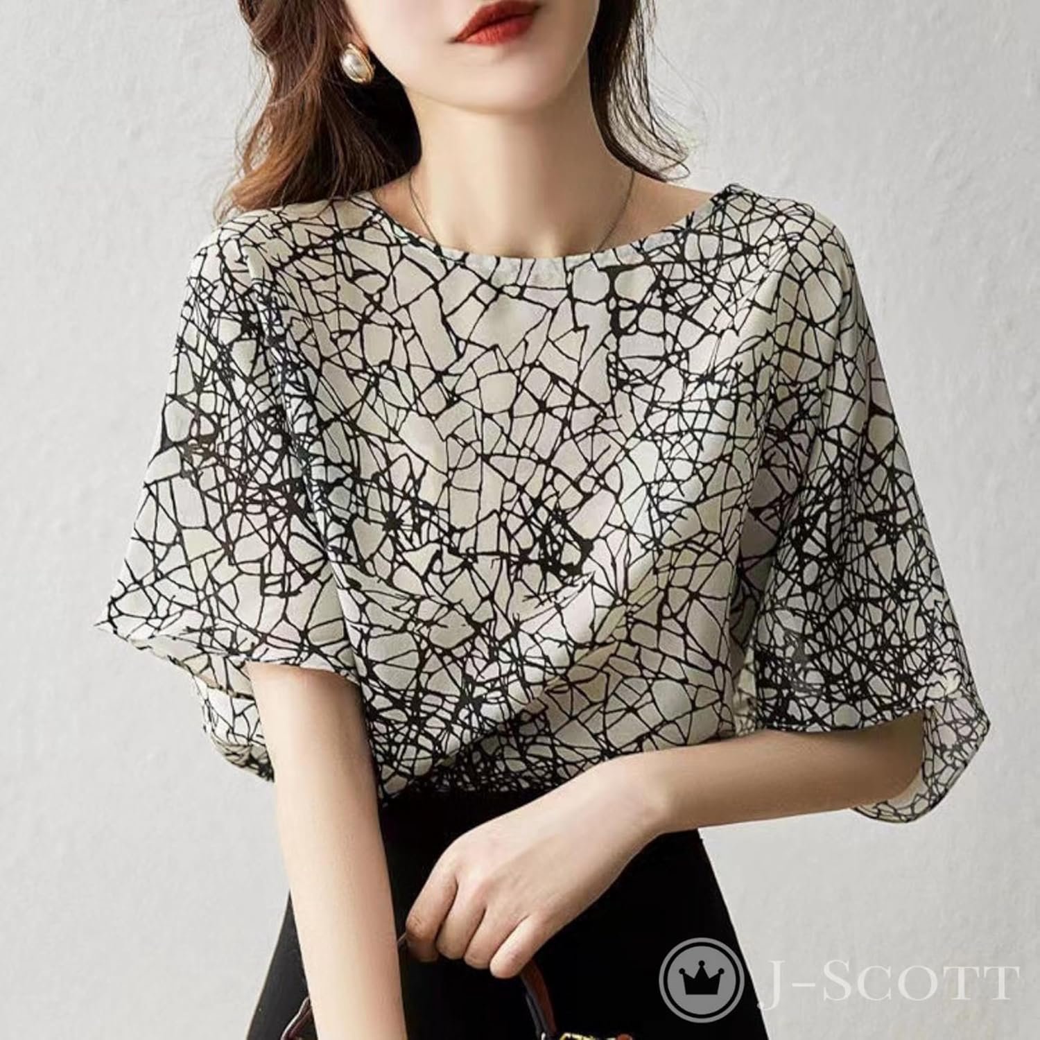 J-Scott JS142 Women’s Blouse, Print, Monotone, Flare Sleeve, Half Sleeve, Round Neck, Chiffon