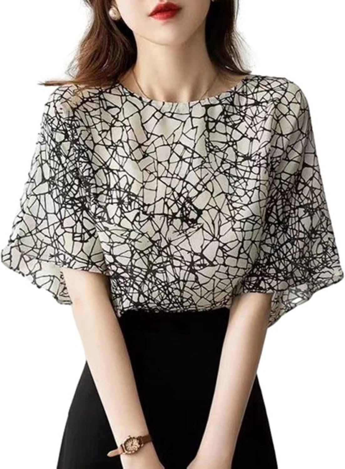 (An adult outfit that enhances your presence) Women's Print Monotone Flare Sleeve Half Sleeve Round Neck Chiffon Elegant Geometric Pullover Outfits Design Blouse Modern Slimming Look Sleek Look NeatWomen's Print Monotone Flare Sleeve Half Sleeve Round Neck Chiffon Elegant Geometric Pullover Outfits Design Blouse Modern Slimming Look Sleek Look Neat