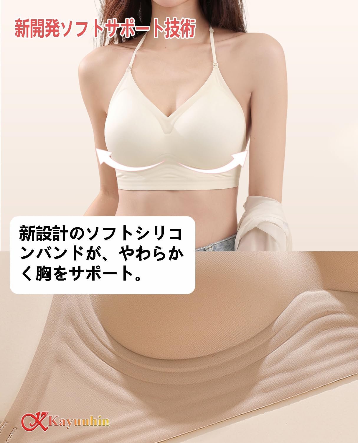 マルチジェルサポートバンド – 柔らかくしっかりとしたサポートバンドがバストを包み込み、ふっくらとボリューム感のあるバストをサポートしながら引き上げます。