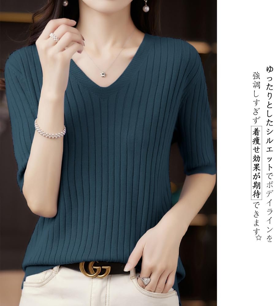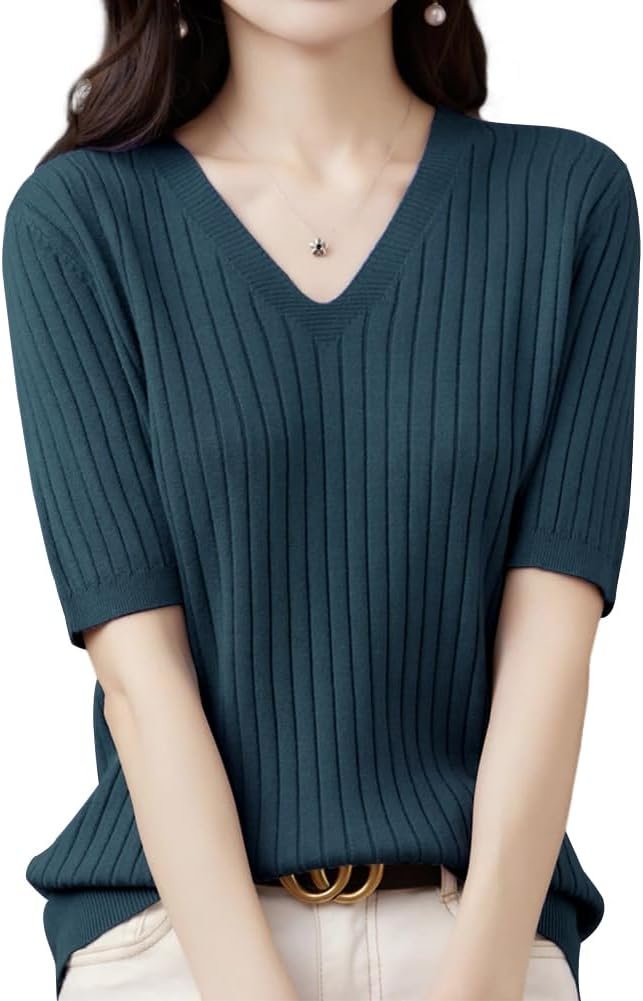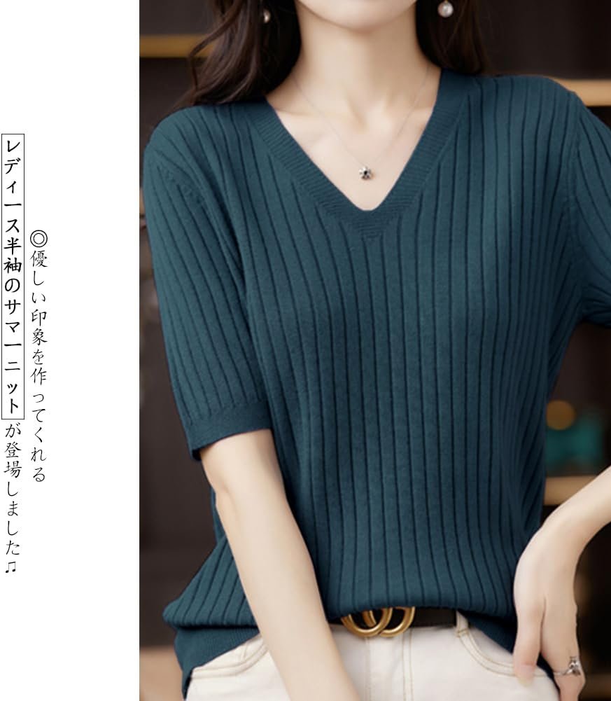 KQOKQO Women’s半袖Vネックサマットニットカット&縫い縫いリブ薄い柔らかいストレッチルーズ、スリミング、シンプル、汎用性があり、スタイリッシュ、セーター、カジュアル、通勤、夏
