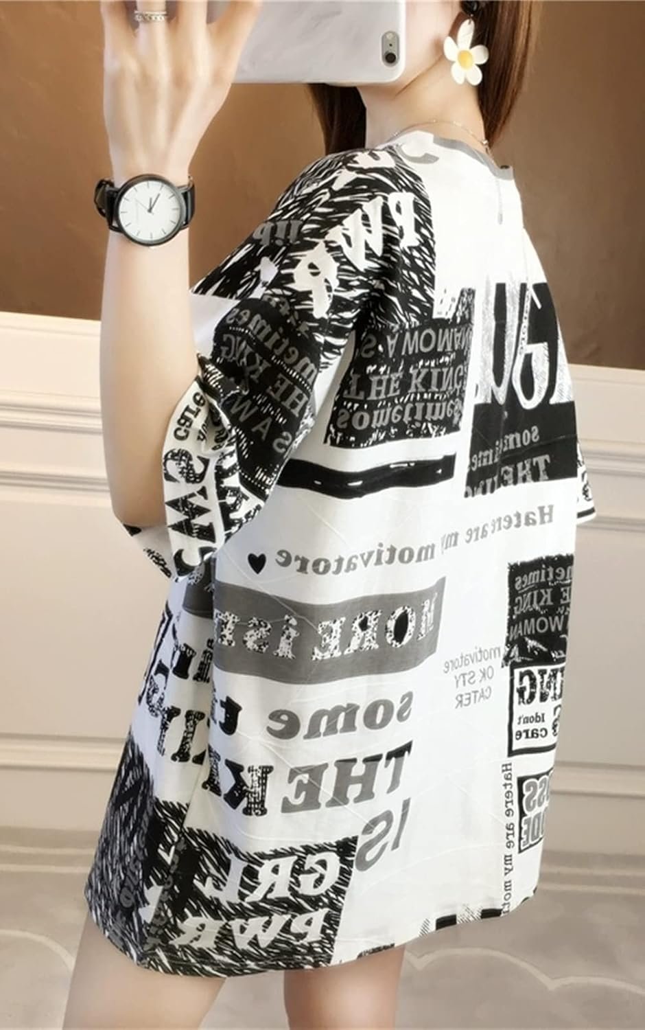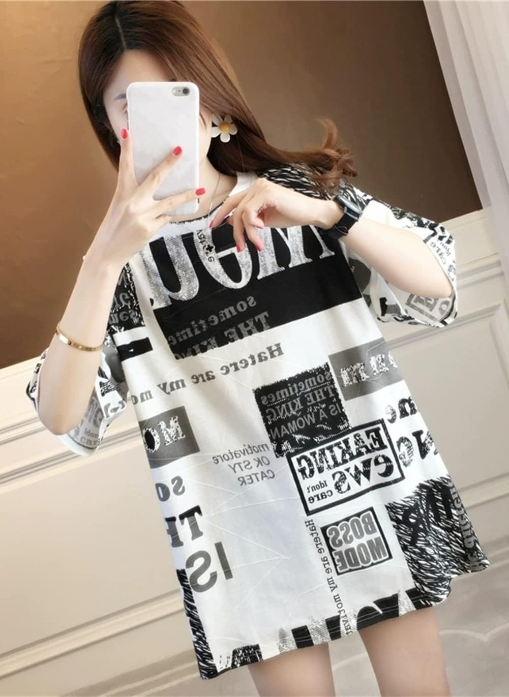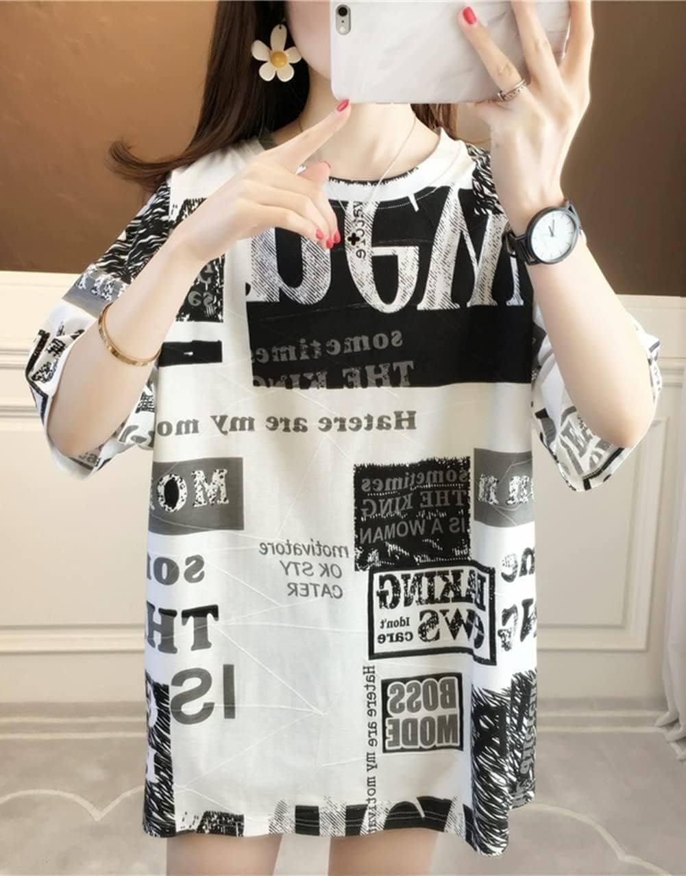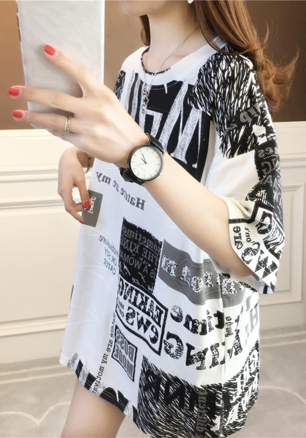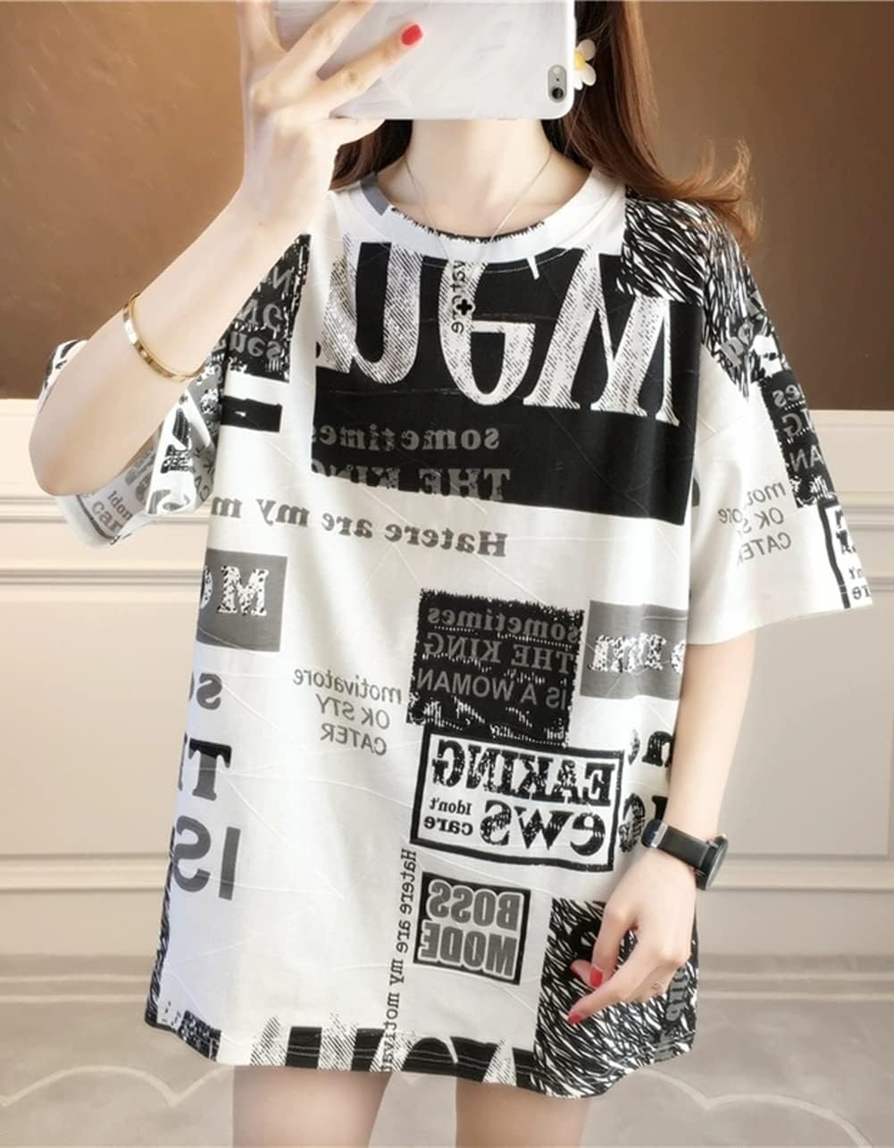 この女性のTシャツには、ファッションの最前線で歩くのに十分なデザイン、リラックスしたレイアウト、何を着るべきかわからないというトラブル、白黒のデザイン、衣服との簡単なマッチングがあります。このTシャツは、あなたを涼しく、装備し、快適に保つために流れる空気で、暑い夏には少し涼しくなります。中程度の長さのデザインスタイルは若くて美しく、あなたのスタイルを強調してください。それはあなた自身の価値があります。
