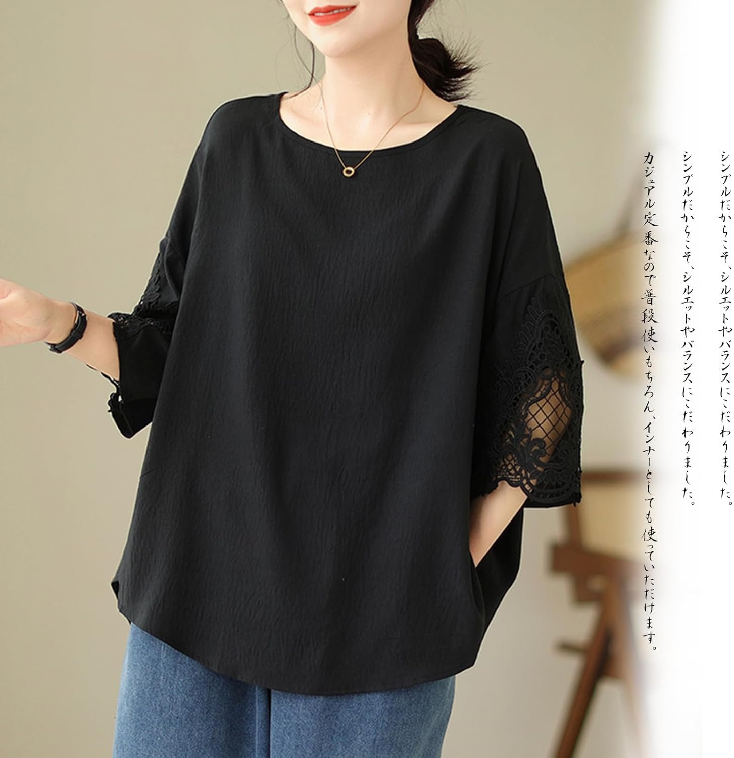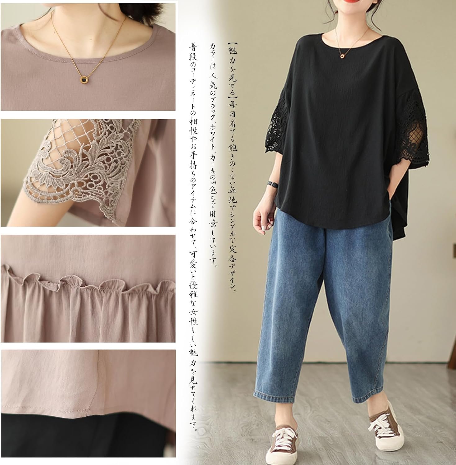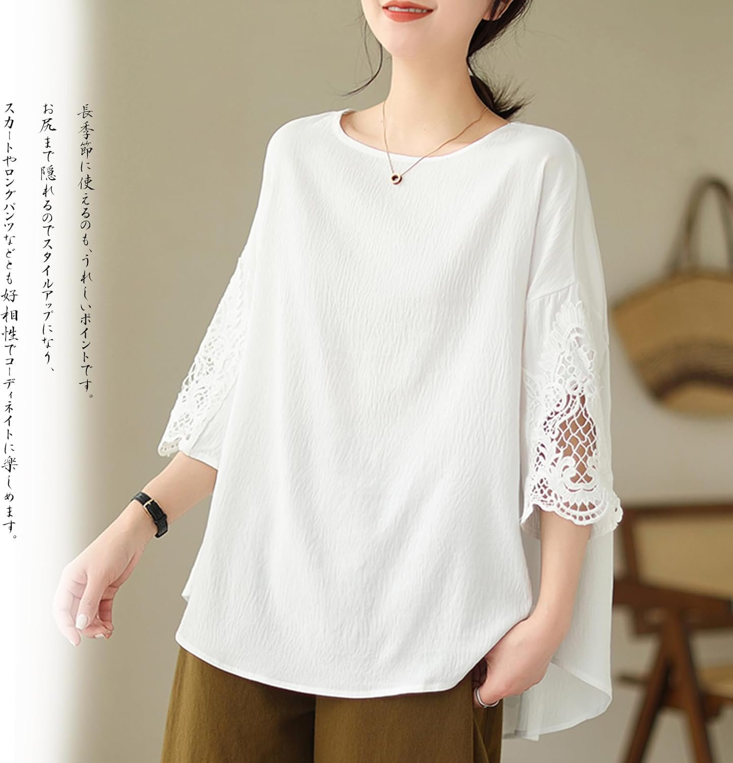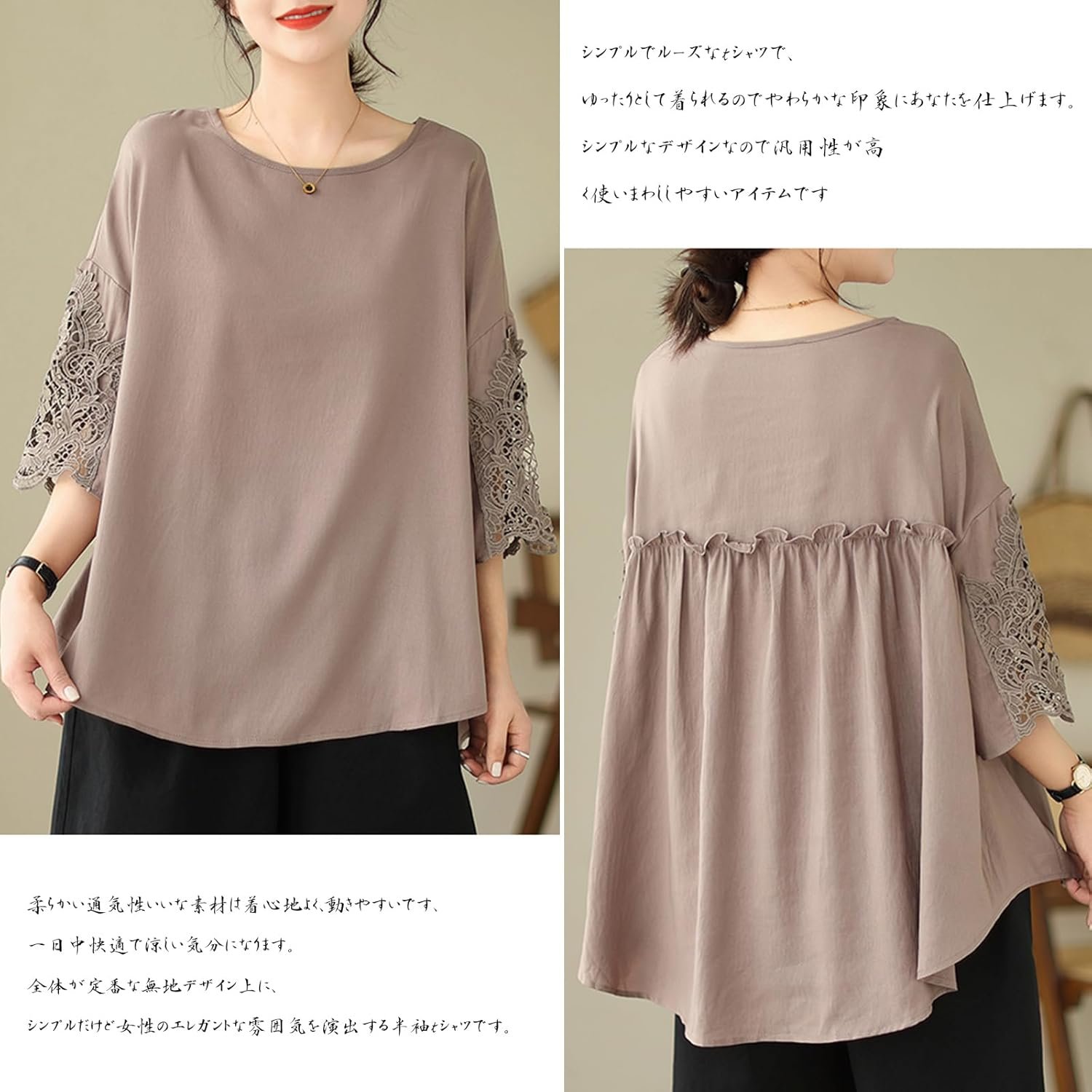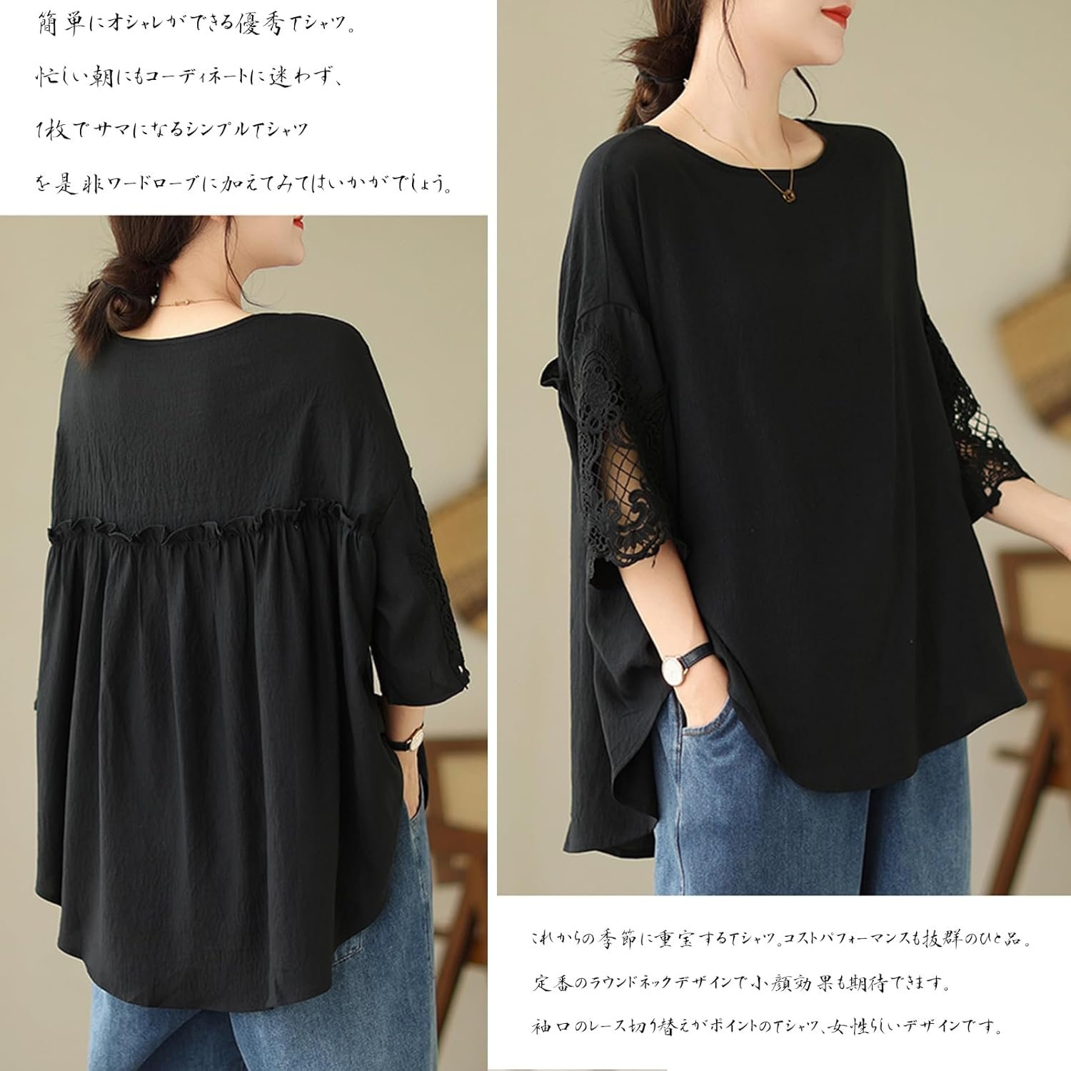また、今後のシーズンに最適なTシャツが優れたコストパフォーマンスです。クラシックラウンドネックのデザインは顔が小さくなります。フェミニンなデザインのためにカフスにレースパネルが付いているTシャツ。