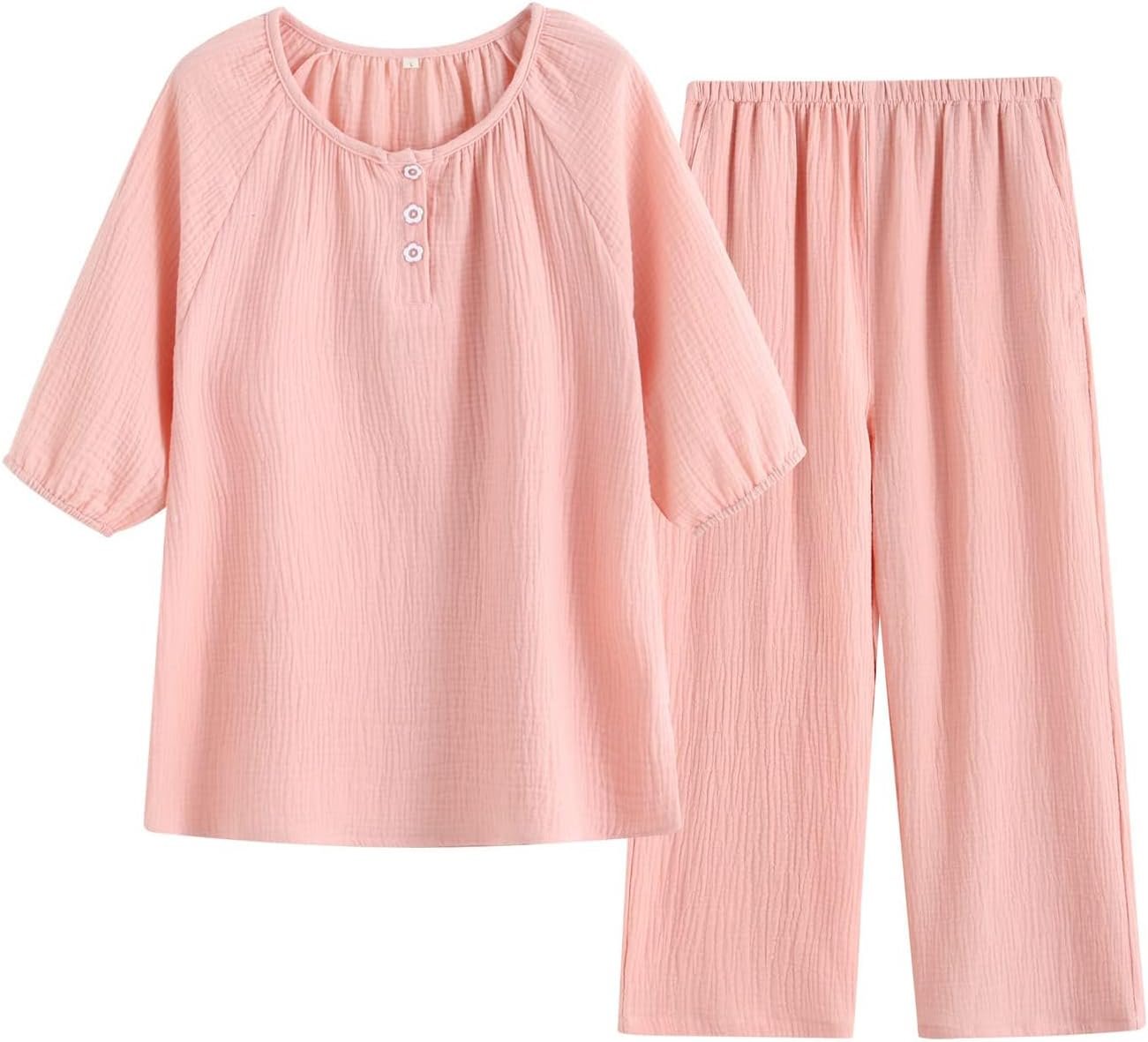 Sisoftly Women’s半袖パジャマ、オープンフロント、トップ、ボトムセット、夏、肌にやさしい、ダブルガーゼ、8/4長さのズボン、スタイリッシュ、ソリッドカラー、春と夏、クール、女性、