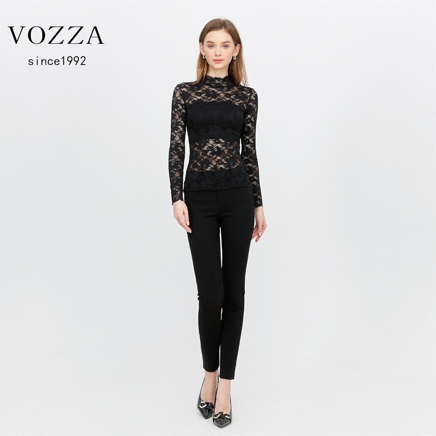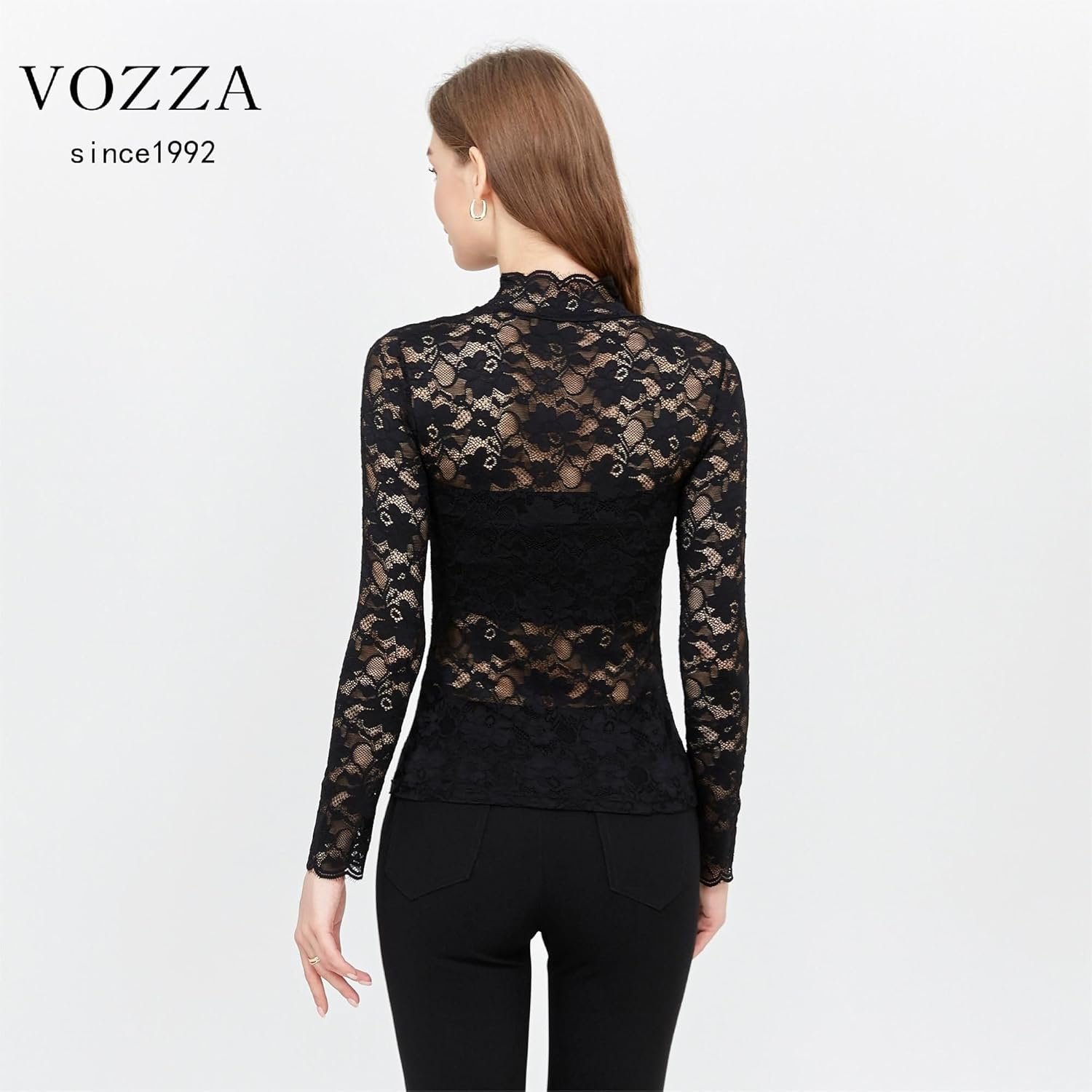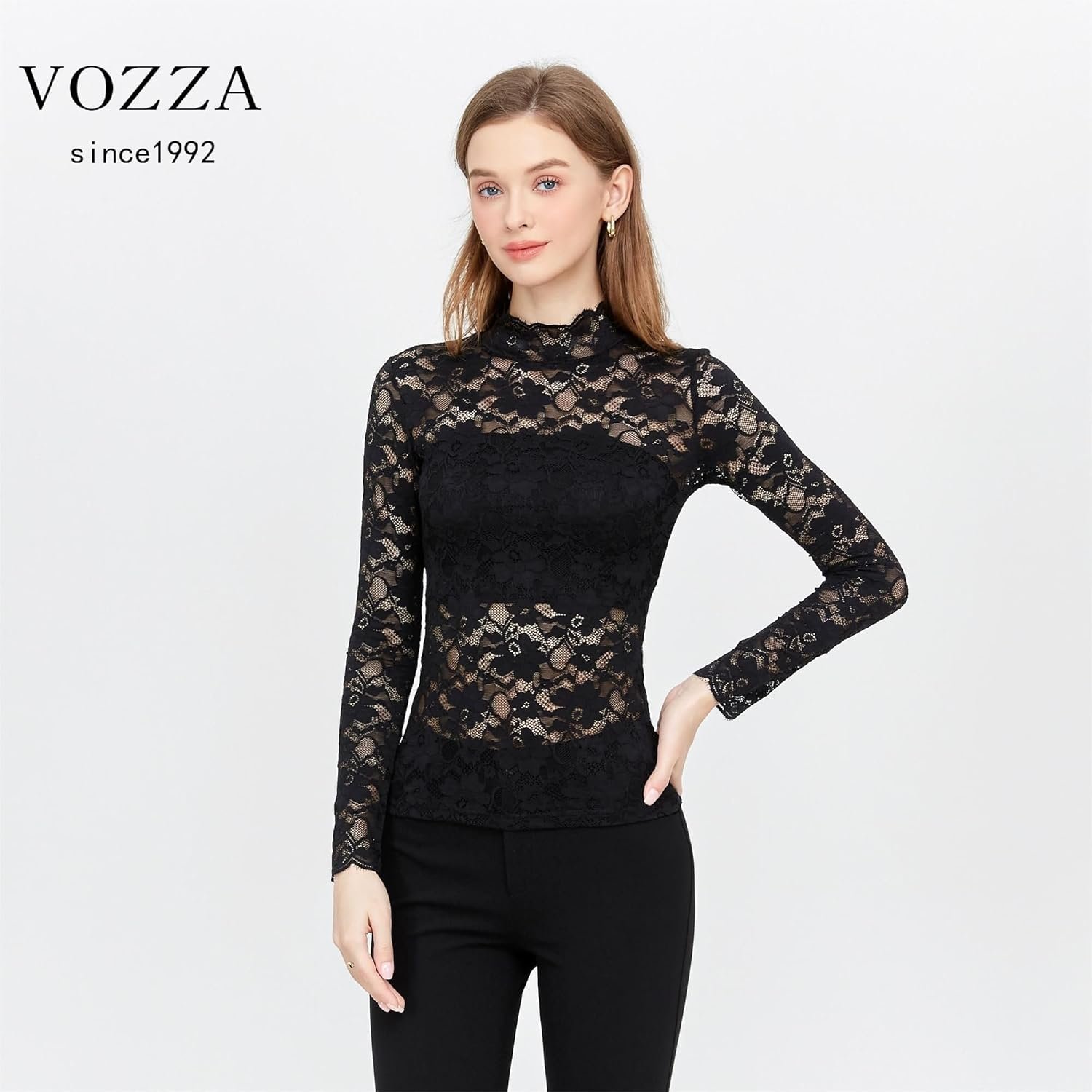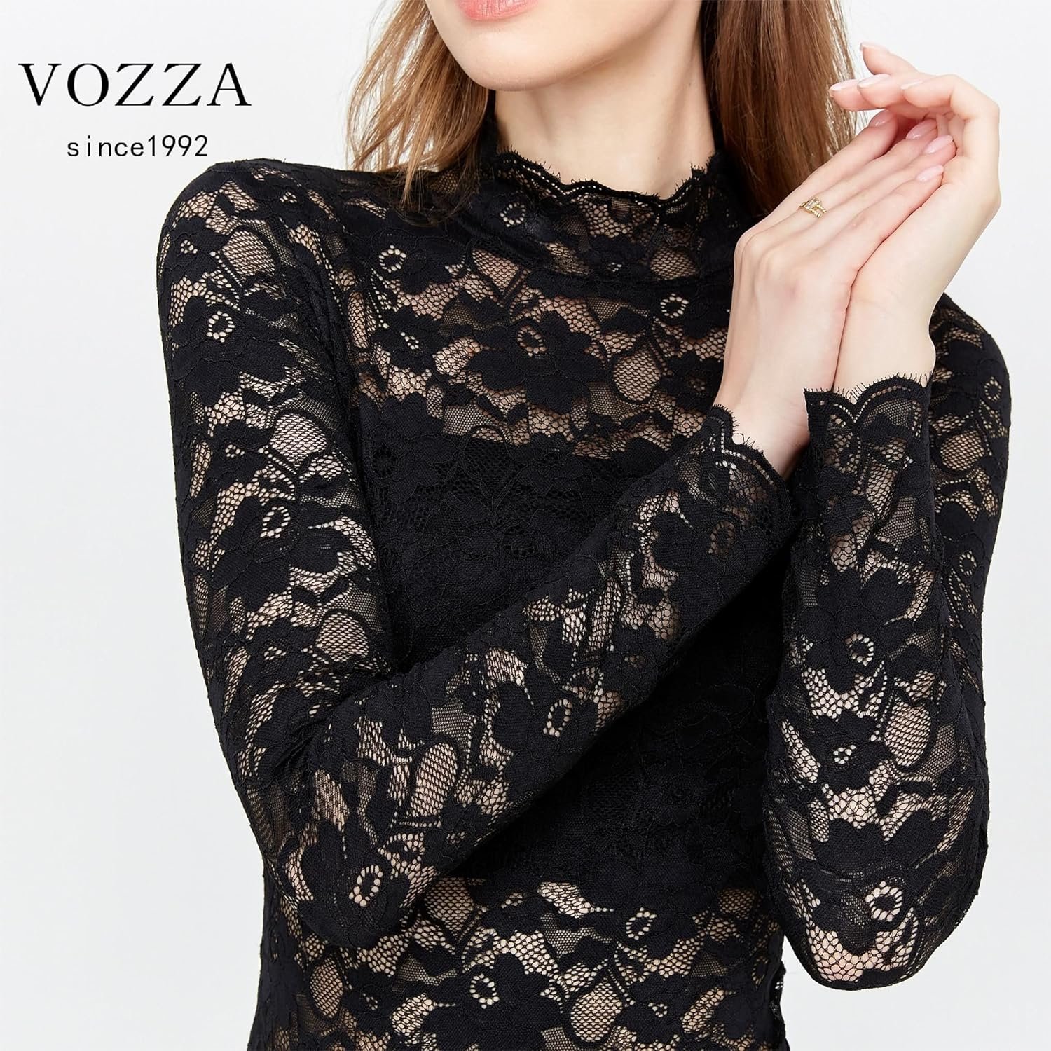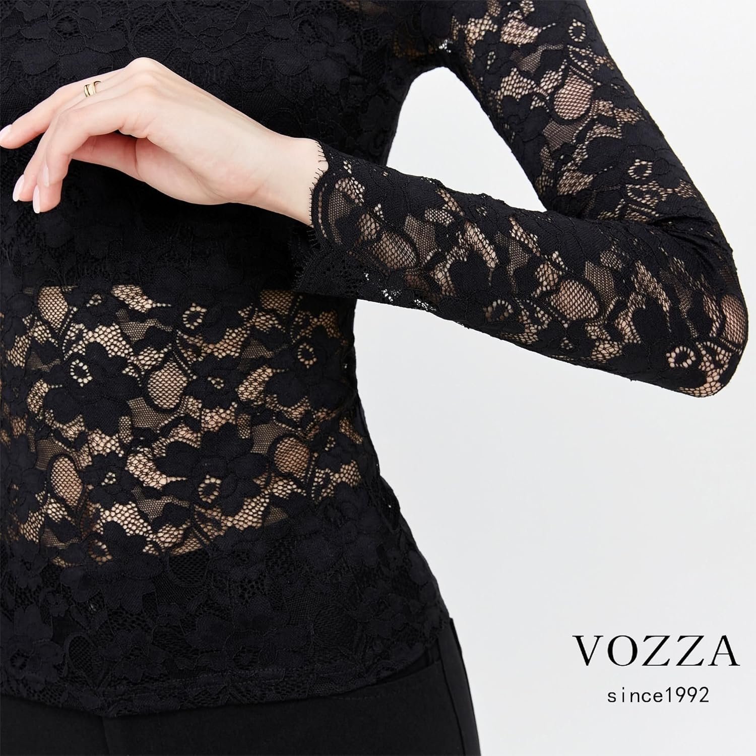 Vozza Women’s Fully Lace、See-Sthrough、Stretch-Blouse、Embroidery、Sheer、Stretry、Long Sleeve、High Neck Top、Women’s、Power Net、透明、伸縮性、長袖、スタンドカラー、ぶら下がり、ぶら下がり、ぶら下がり、