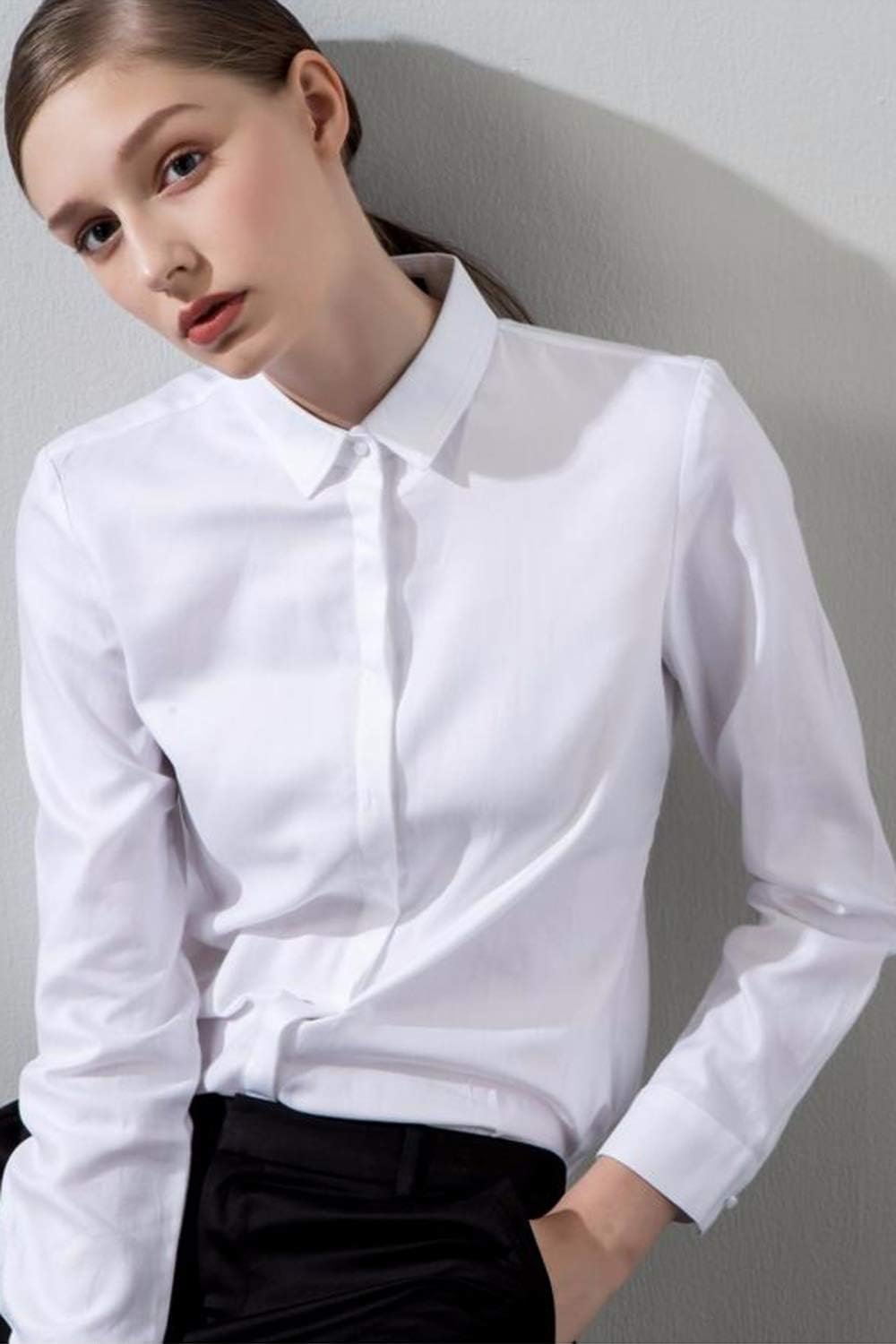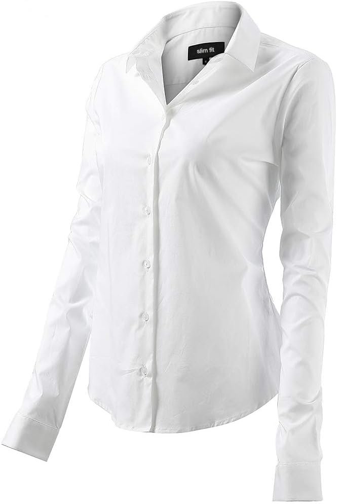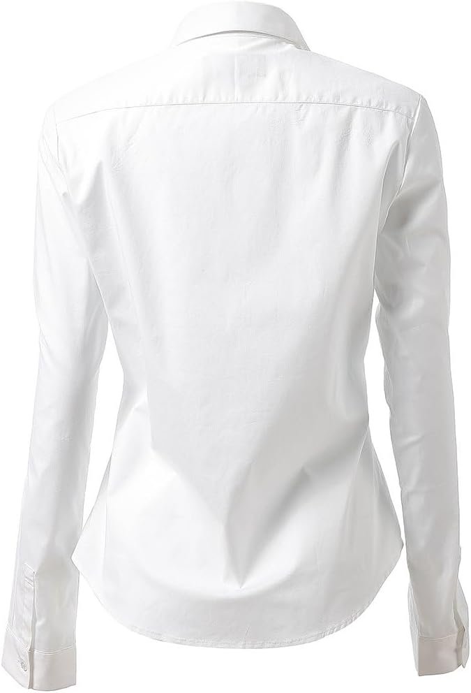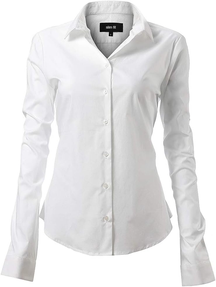 コーディネートの幅が広いブラウス 春、秋、冬にはセーターやカーディガンの下に着るのはもちろん、オールシーズン活躍するアイテムです。女性のボタンダウン長袖スリムフィットソリッドストレッチシャツカットの良いスリムフィットブラウス – 柔らかく、通気性があり、スタイリッシュです。